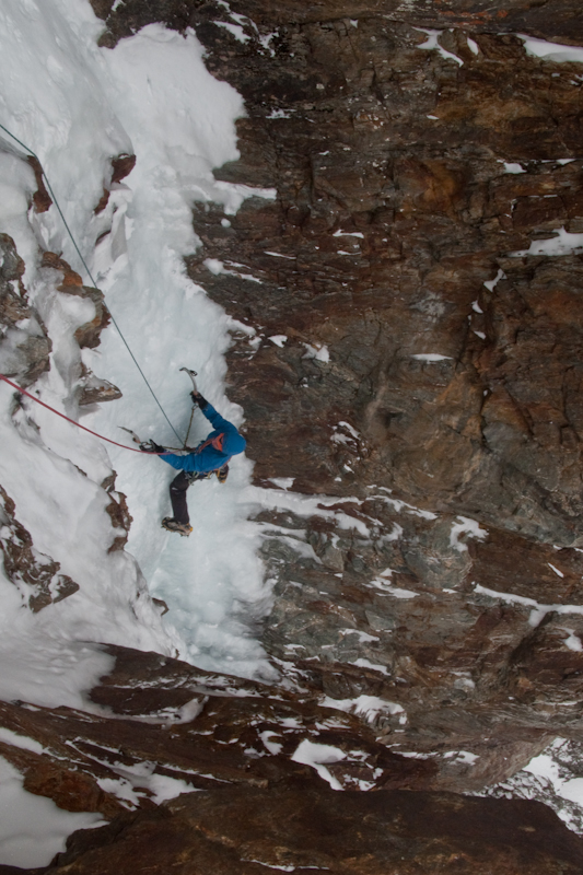 Jeroen en Andy klommen terwijl Chandelle Levure(II 4+ 180m). Hier klimt Andy zijn eerste lengtes voor waar hij zelf zijn vijzen draait hoewel het ijs soms wat te dun was voor een goede vijs. De laatste pilaar en normaal mooiste lengte lag in geen al te goede condities en was nogal sorbet achtig waardoor ijsvijzen bijna nutteloos werden.