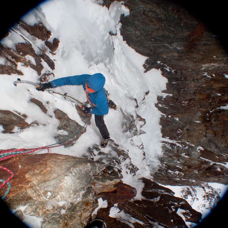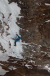 De derde lengte is de zogezegde crux. Een 15 meter 90° dat dan stilaan afzwakt naar 80°. In een smalle geul plakt er overal ijs en sneeuw. Dik is het zeker niet maar met een beetje zoeken en proberen krijg je er her en der vijzen van 16 cm in. Maar ook hier is het tussen de losse poeder zoeken naar stevige stukken firn of ijs voor de voeten, bijlen en ijsvijzen. Na een lastige maar mooie traverse beland ik aan een Relais. Tim klimt deze lengte na door een continue spindrift ik kan enkele leuke foto’s maken.