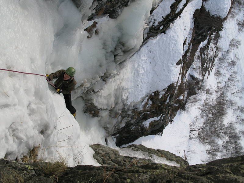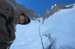 Wij schoten deze keer wel goed op en ondanks de grote hoeveelheid sneeuw geraakten we vlot tot onderaan de crux. Ik stelde Tim VH voor om deze lengte voor te klimmen, zo kon hij zijn nieuwe bijlen eens degelijk inwijden. Maar 10 meter ver in deze lengte sloeg de verzuring toe in Tim zijn kuiten en geraakte hij niet meer verder…en toen was het aan mij om voor te klimmen Op bepaalde stukken was het ijs echt loodrecht, door de koude was het bikkelhard en de ski’s op mijn rug trokken mij naar achter. Ik heb echt moeten vechten en volgens mij is deze lengte eerder 5+ waard i.p.v de 4+ quotatie die de topo aangeeft.