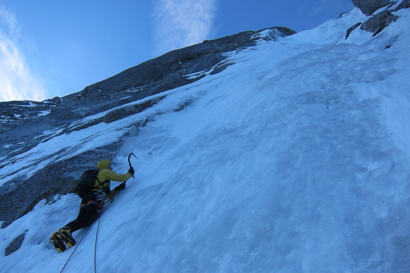 Bij het eerste licht op het middelste firnveld halverwege de wand.