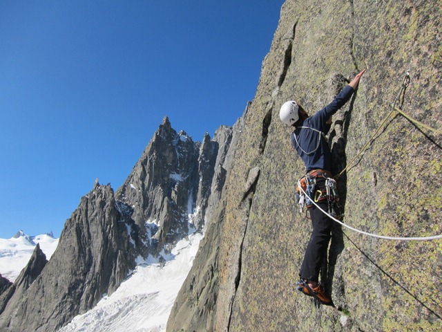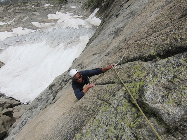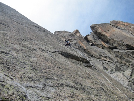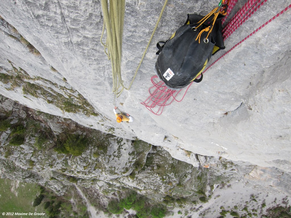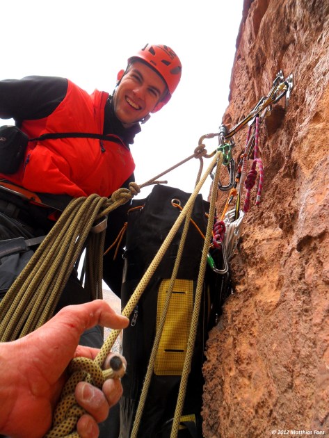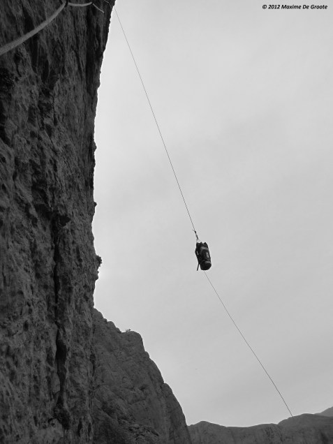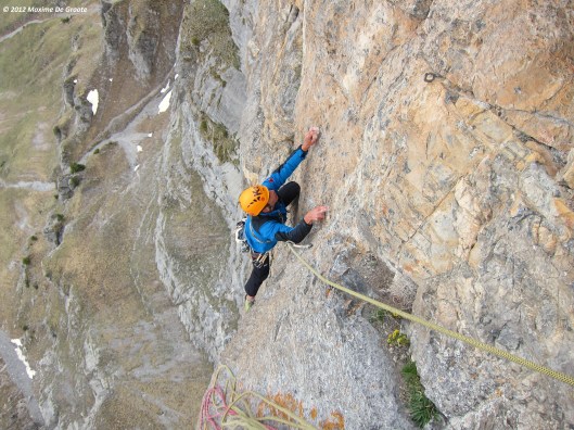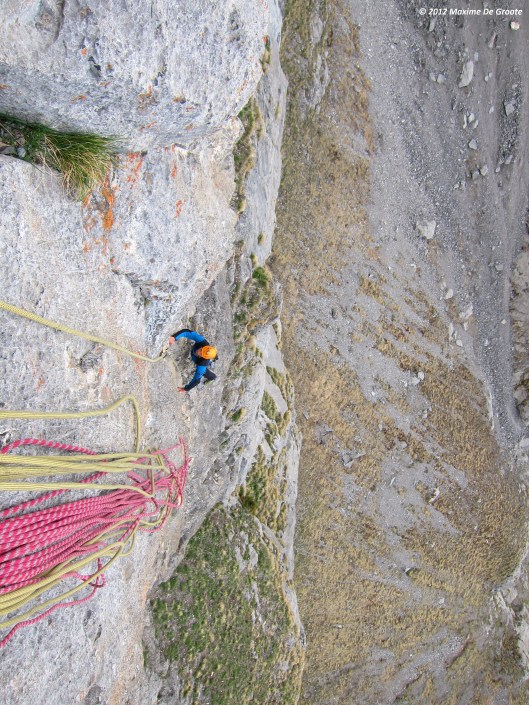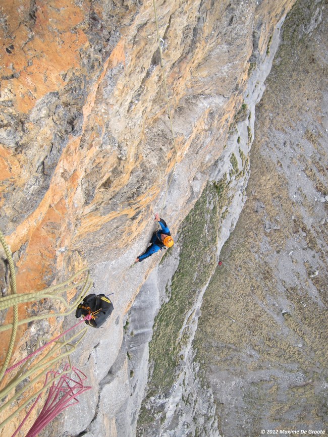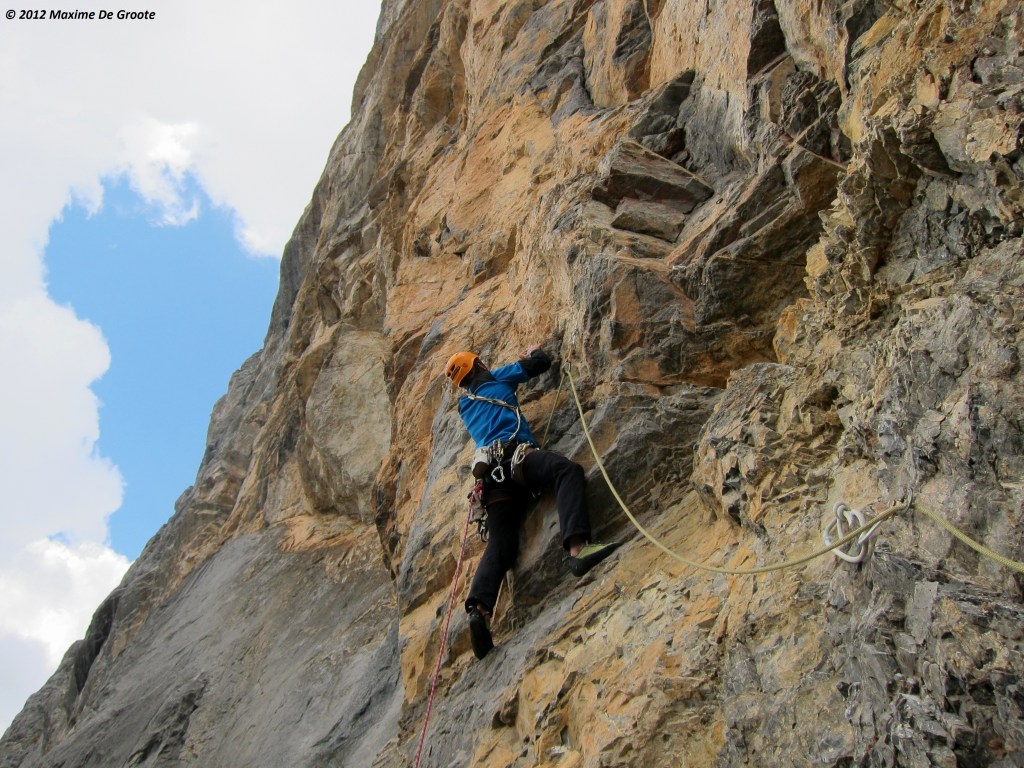 Een kleine maand na het toppen van de route zijn de kleine details ontgaan maar het geheel is zo fantastisch. De ambiance op de relais met steeds veel lucht, veel wind, veel hangen, nooit echt recupereren, lengtes die alsmaar langer worden naarmate we hoger komen in de route. De spanning toen er bewolking opkwam toen we starten en twijfelen of het zou gaan regenen… De 10 eerste pijnlijke hang-relais, de mentaal om door harde passen in geëngageerde passages te gaan, af en toe een val…