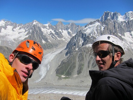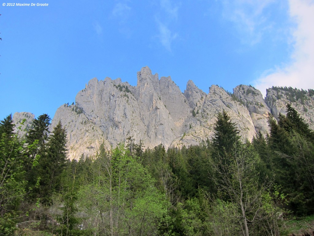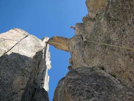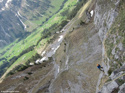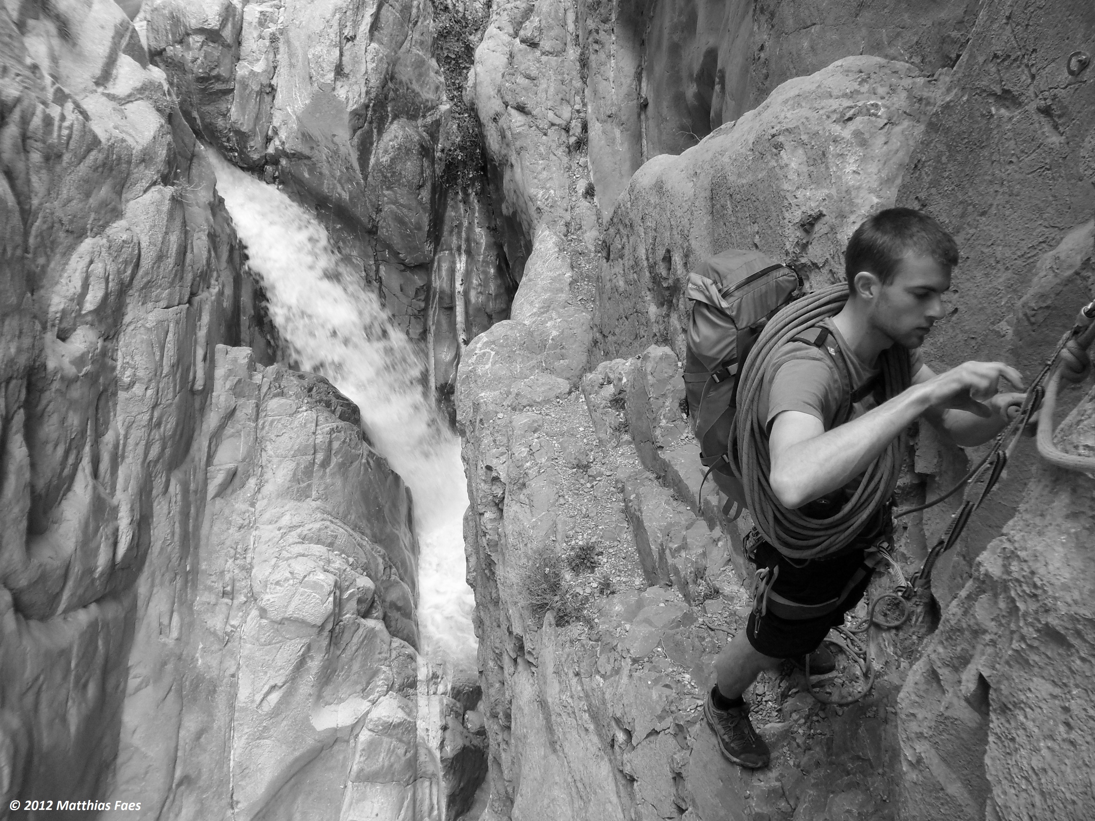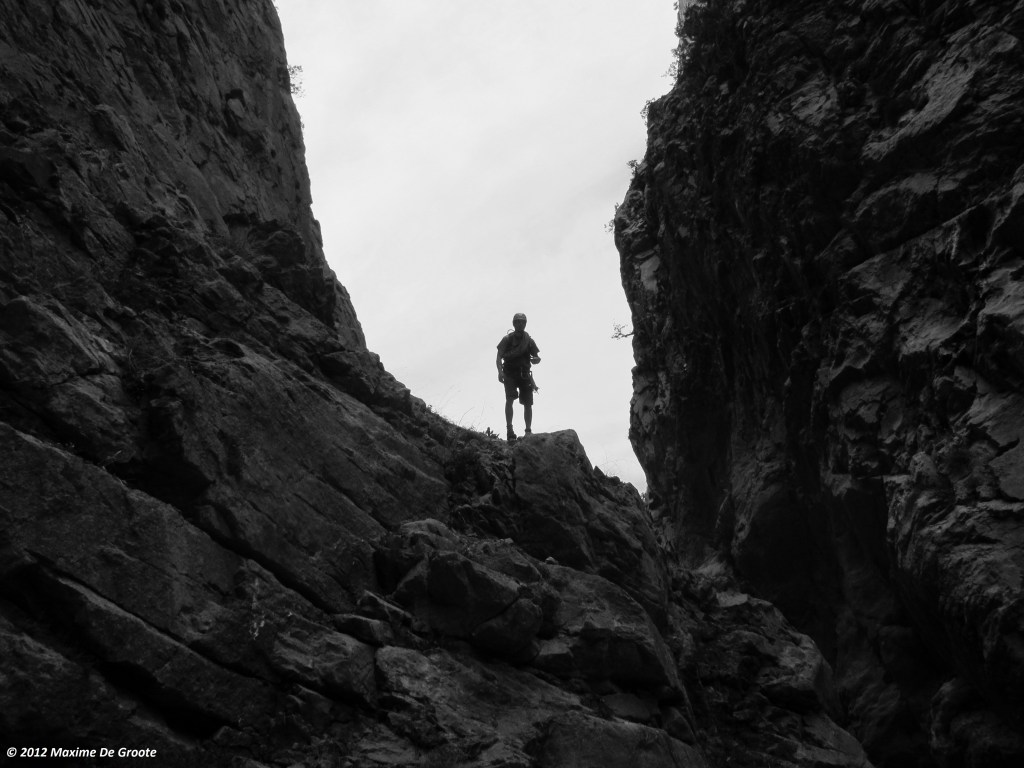 De volgende dag (dinsdag) waren we vroeg op pad: de wekker om half6, een uurtje later vertrokken. De canyon was deels door ons geëquipeerd tot aan the-point-of-no-return. We hadden er beide van wakker gelegen, zenuwachtig over geweest maar op het moment zelf leek het een koud kunstje. Max gaat op de gladde dal-steen staan, knikt naar mij, gooit de touwen over en springt over het water! Zonder een woord tegen elkaar te zeggen volg ik direct: springen, ver springen en zeker niet vallen. Waarschijnlijk was de wil om “Les Rivières Pourpres” (ABO 500m, passen tot 7c, 7a oblig) te doen sterk genoeg. Nog even een 50 meter lange 5c traverseren en verder de canyon door.