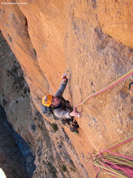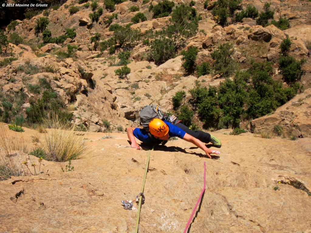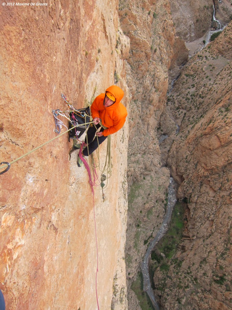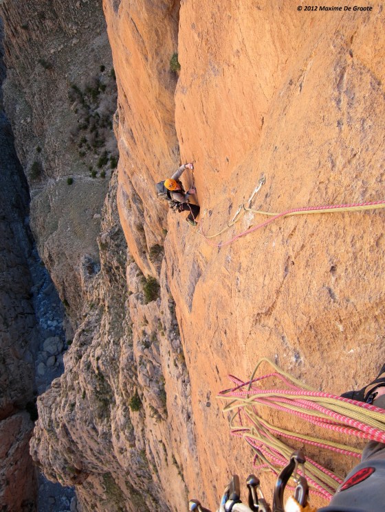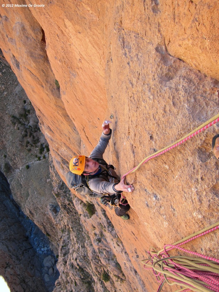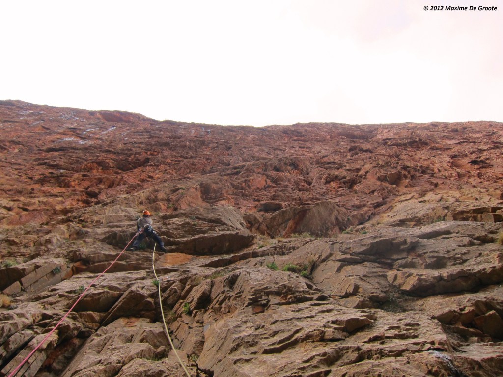 Op zich is “Au nom de la Réforme” geen extreem lange route, jammer, want de rots is compact, recht en magistraal om te klimmen. Max klom de 3de lengte voor, misschien wel de mooiste lengte. Zeer technisch, kleine regletten met enkele geëngageerde passen net onder de relais. De moeilijkheden in deze route waren relatief, het was vooral genieten van de klimmerij. Na een eenvoudigere uitklim hadden we duidelijk nog energie. We ‘repten’ ons tot de top van de Taoujdad, afklimmen, een rappel trekken en terug afklimmen tot de instijg van “Belle et Berbère” op de Paroi des Sources.