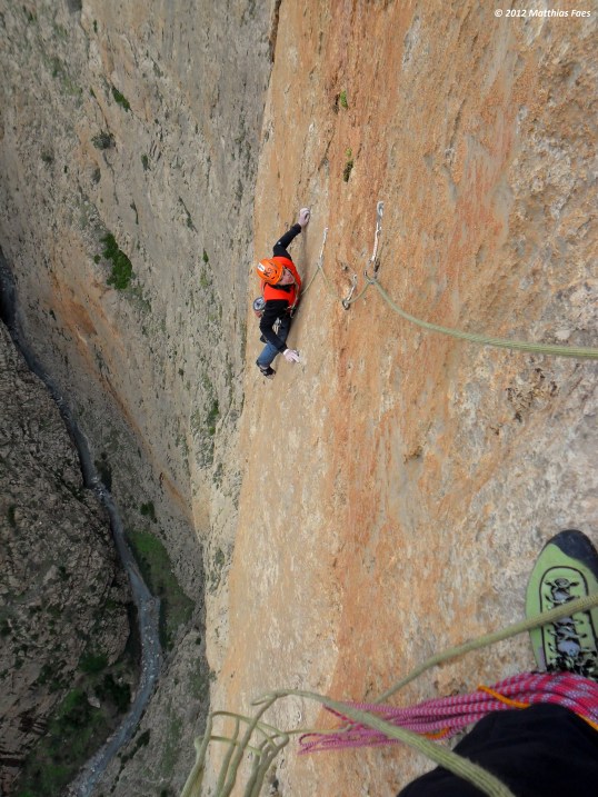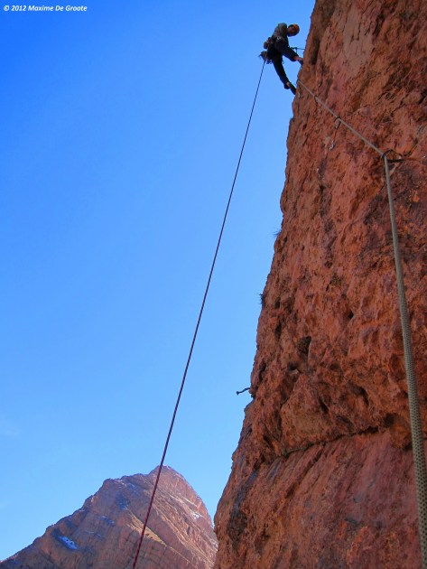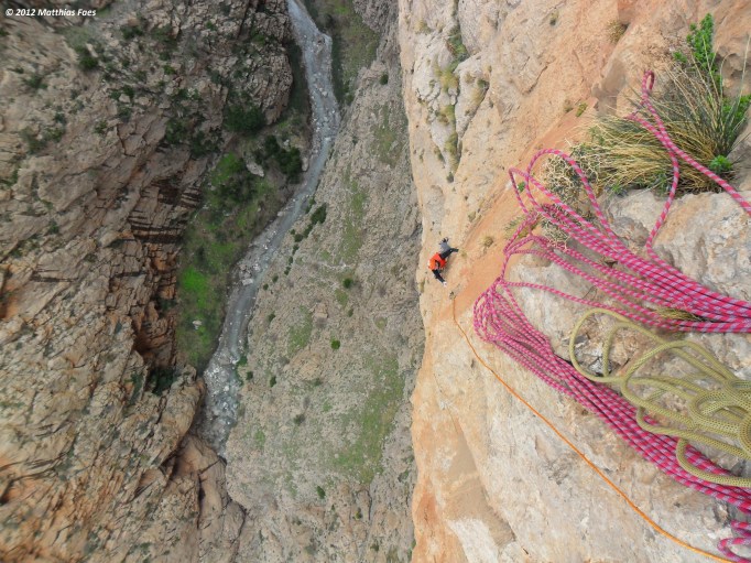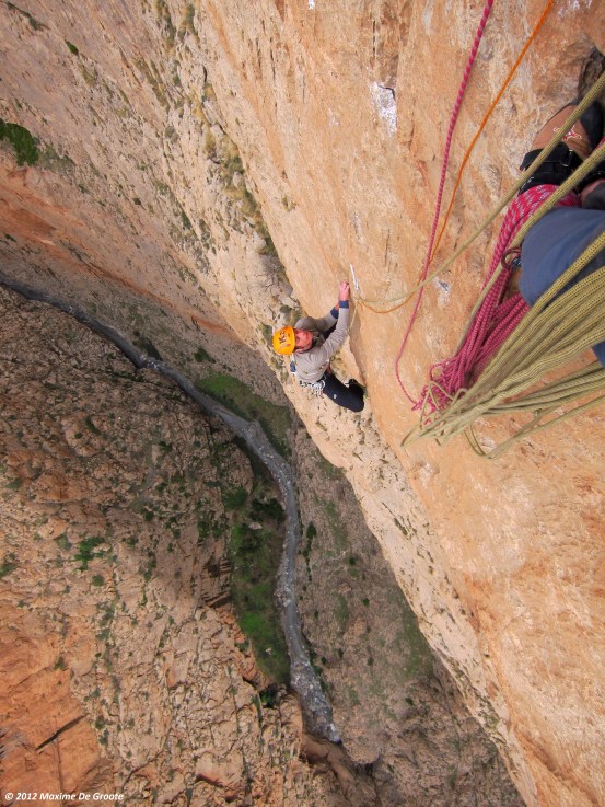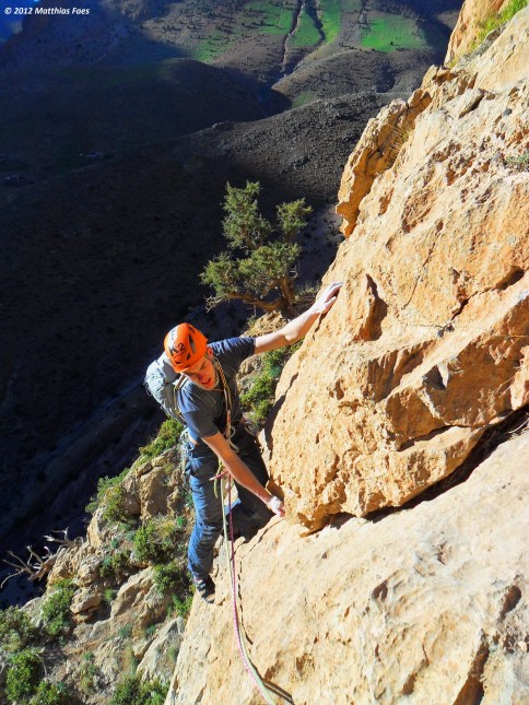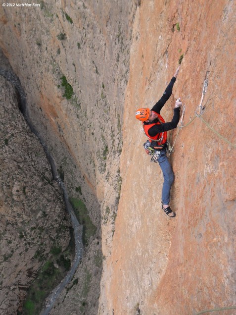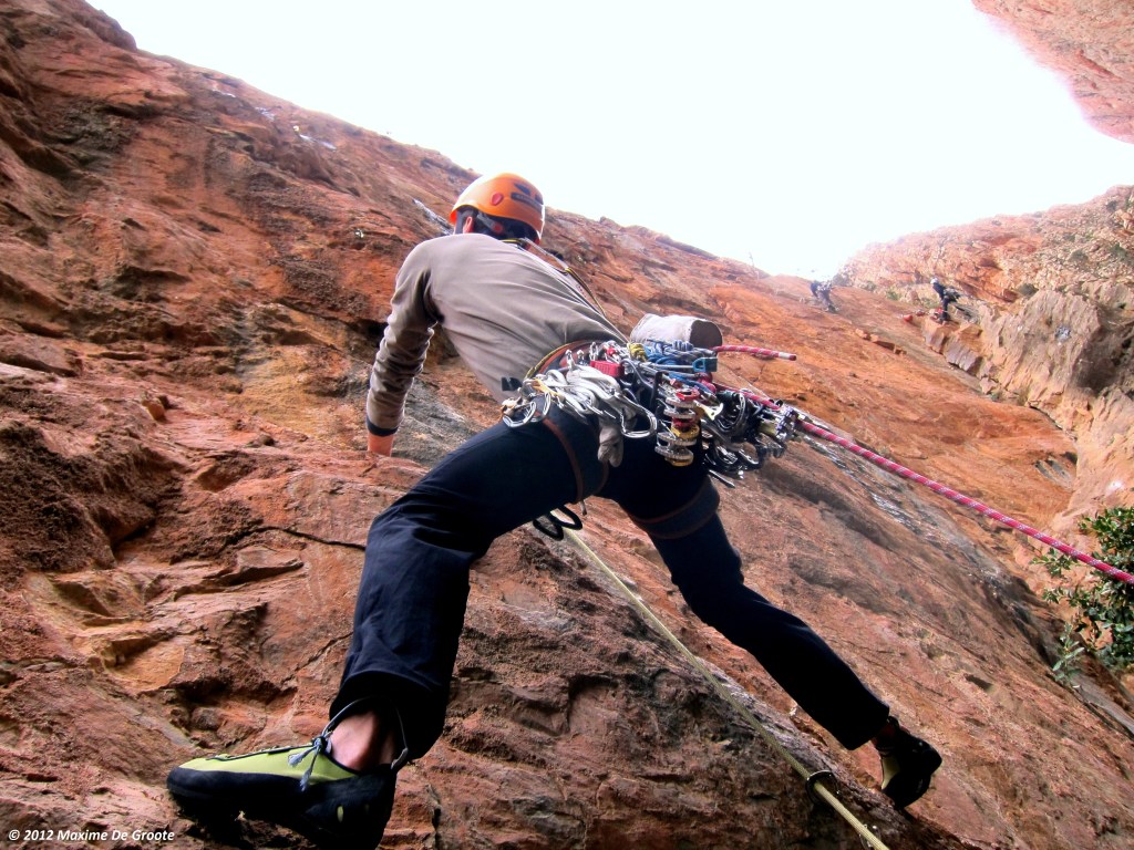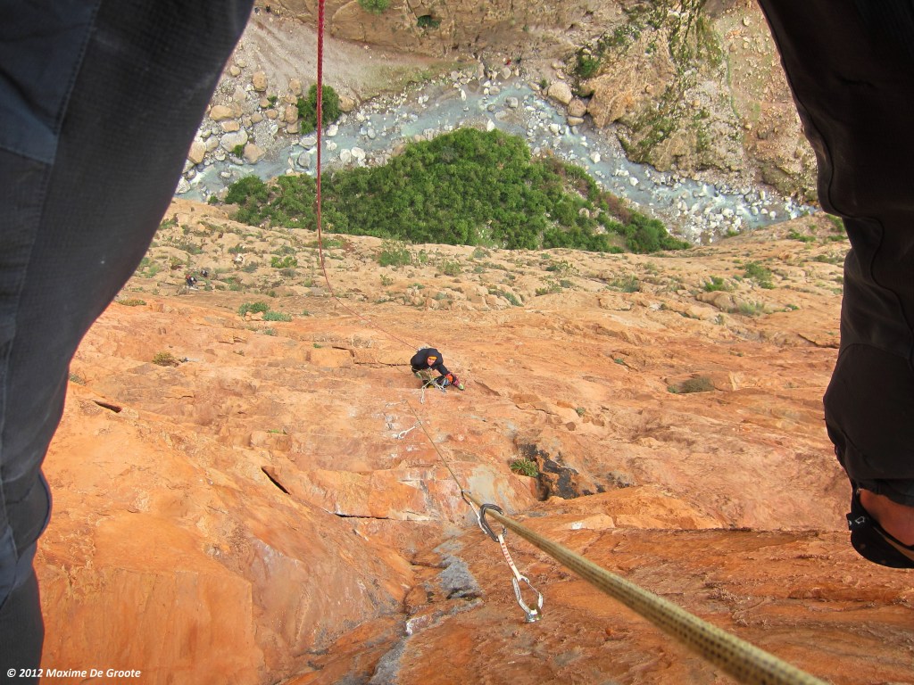 Op zich is “Au nom de la Réforme” geen extreem lange route, jammer, want de rots is compact, recht en magistraal om te klimmen. Max klom de 3de lengte voor, misschien wel de mooiste lengte. Zeer technisch, kleine regletten met enkele geëngageerde passen net onder de relais. De moeilijkheden in deze route waren relatief, het was vooral genieten van de klimmerij. Na een eenvoudigere uitklim hadden we duidelijk nog energie. We ‘repten’ ons tot de top van de Taoujdad, afklimmen, een rappel trekken en terug afklimmen tot de instijg van “Belle et Berbère” op de Paroi des Sources.