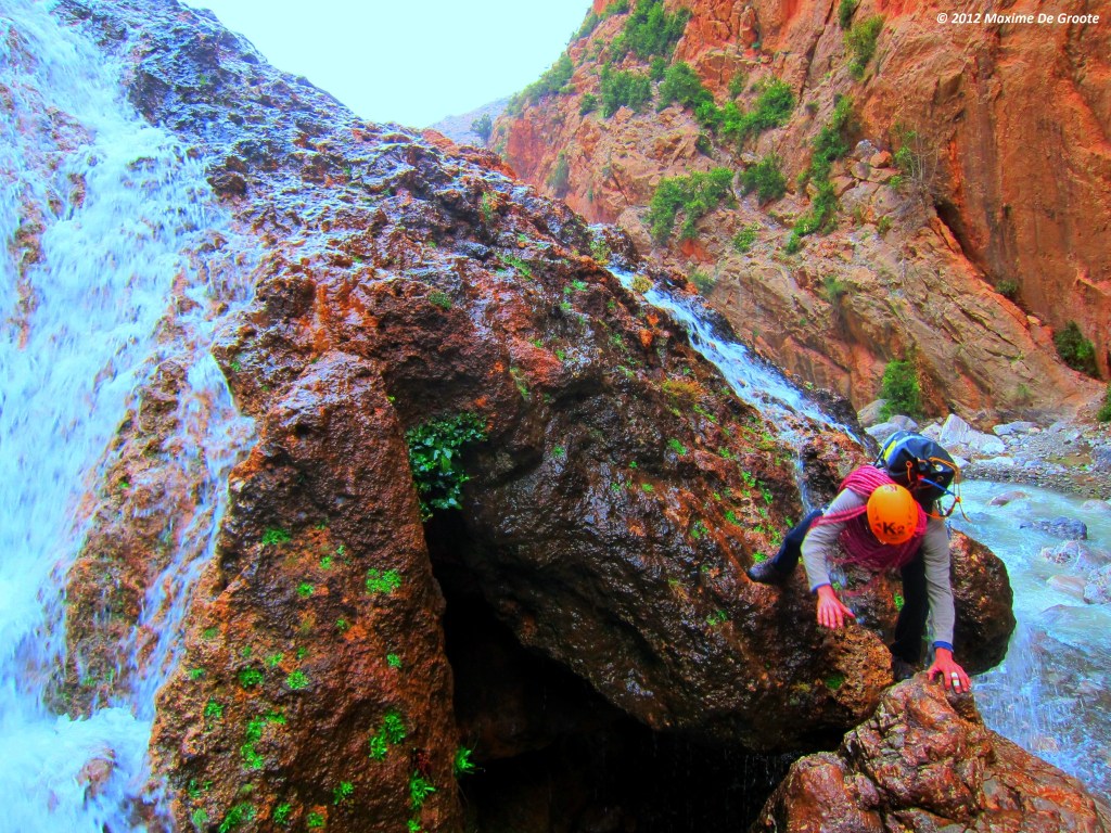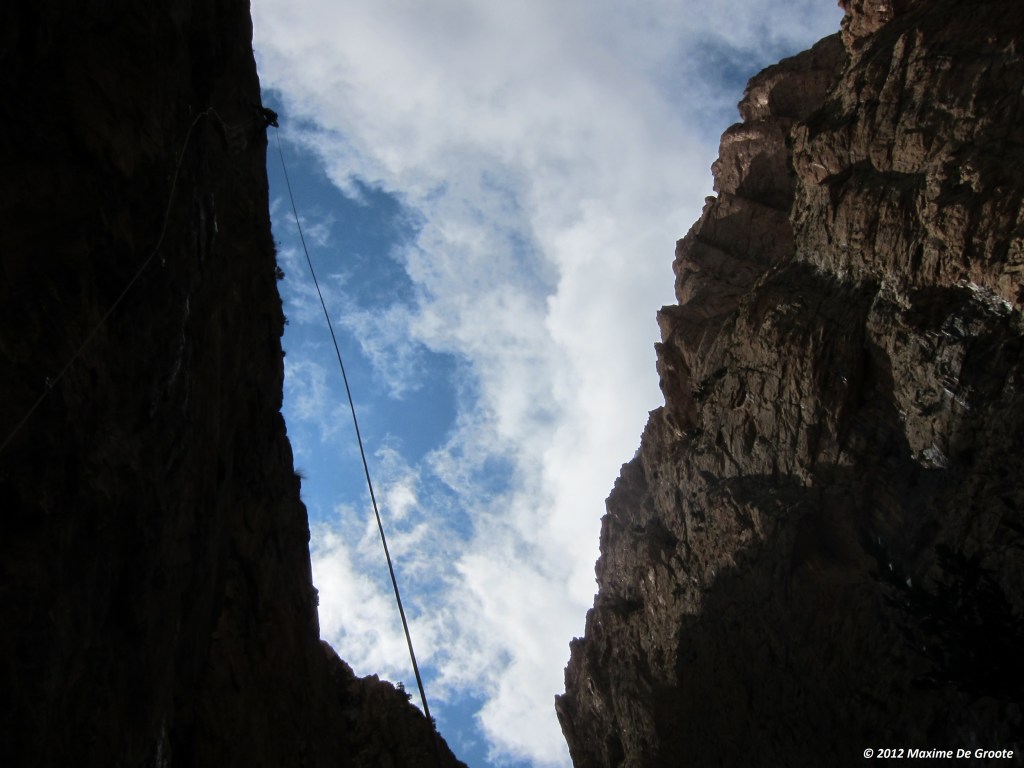 De volgende dag moesten we toch even bekomen vooraleer iets groter aan te vangen. Onze ogen waren sinds begin van de reis gericht op een paar grotere projecten. Het slechte weer bracht onze plannen letterlijk in het water. Maar we begonnen ons toch sterker te voelen en het werd tijd om de canyon te gaan verkennen (de aanloop naar de route “Les Rivières Pourpres”). Door het slechte weer was er dit jaar veel meer water in de canyon en vooraleer dit wegtrok moesten we zeker 2 weken droog weer hebben. Dit hadden we niet, dus dan maar de canyon in met veel water… Stilaan geraakte we vooruit en een stuk hebben we geëquipeerd met een vast touw. Tot aan the-point-of-no-return (een hachelijke oversteek en goed nat gegarandeerd) ging het vlot. Hoe we het vervolg moesten aanvangen was voor ons beiden een raadsel… springen over het water? erin vallen? erdoor wandel? erdoor zwemmen? De zeer sterke stroming deed ons twijfelen en in het water vallen was absoluut geen optie. Na een tijdje twijfelen dan maar terug keren en verder genieten van onze “rustdag”.
