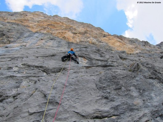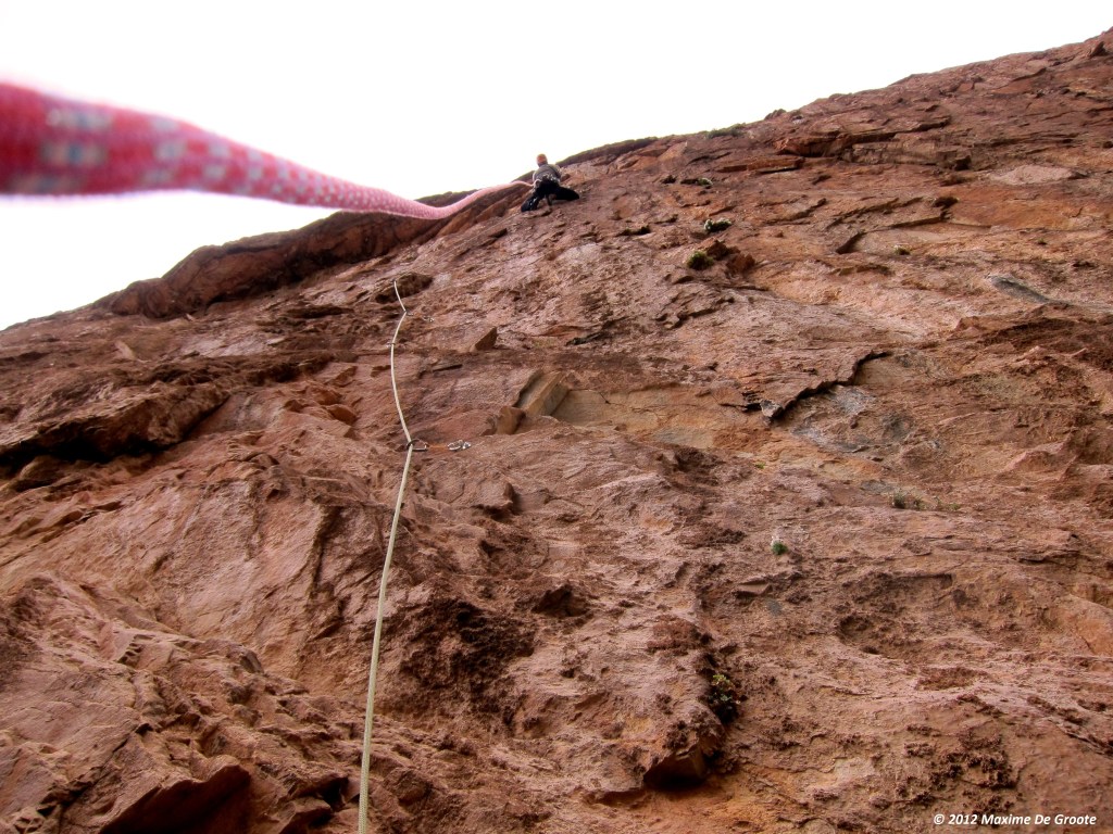 Iets later om 8u, vielen we spreekwoordelijk achterover: we staan onderaan de route! Letterlijk achterover vallen eigenlijk ook: stijl, de eerste 200-tal meters zijn overhangend, dakjes en daken.