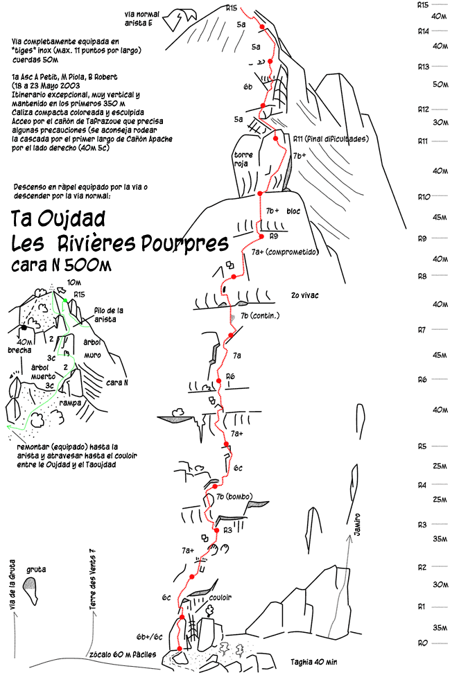 De halve mislukking van de klimroute “Black Wolf” speelde nog door ons hoofd. Vooraleer iets groter te ondernemen wilde we toch eerst nog wat meters klimmen. Zondag zou het dus echt ambitieus worden: iets meer dan 600 meters klimmen. We zouden starten met “Au nom de la Réforme” ED- 300m 6c max (6b+ oblig) op de Taoujdad en vervolgens “Belle et Berbère” TD+ 330m 6b+ max (6a+ oblig) op dal klimmen gequoteerd door monsieur PIOLA!