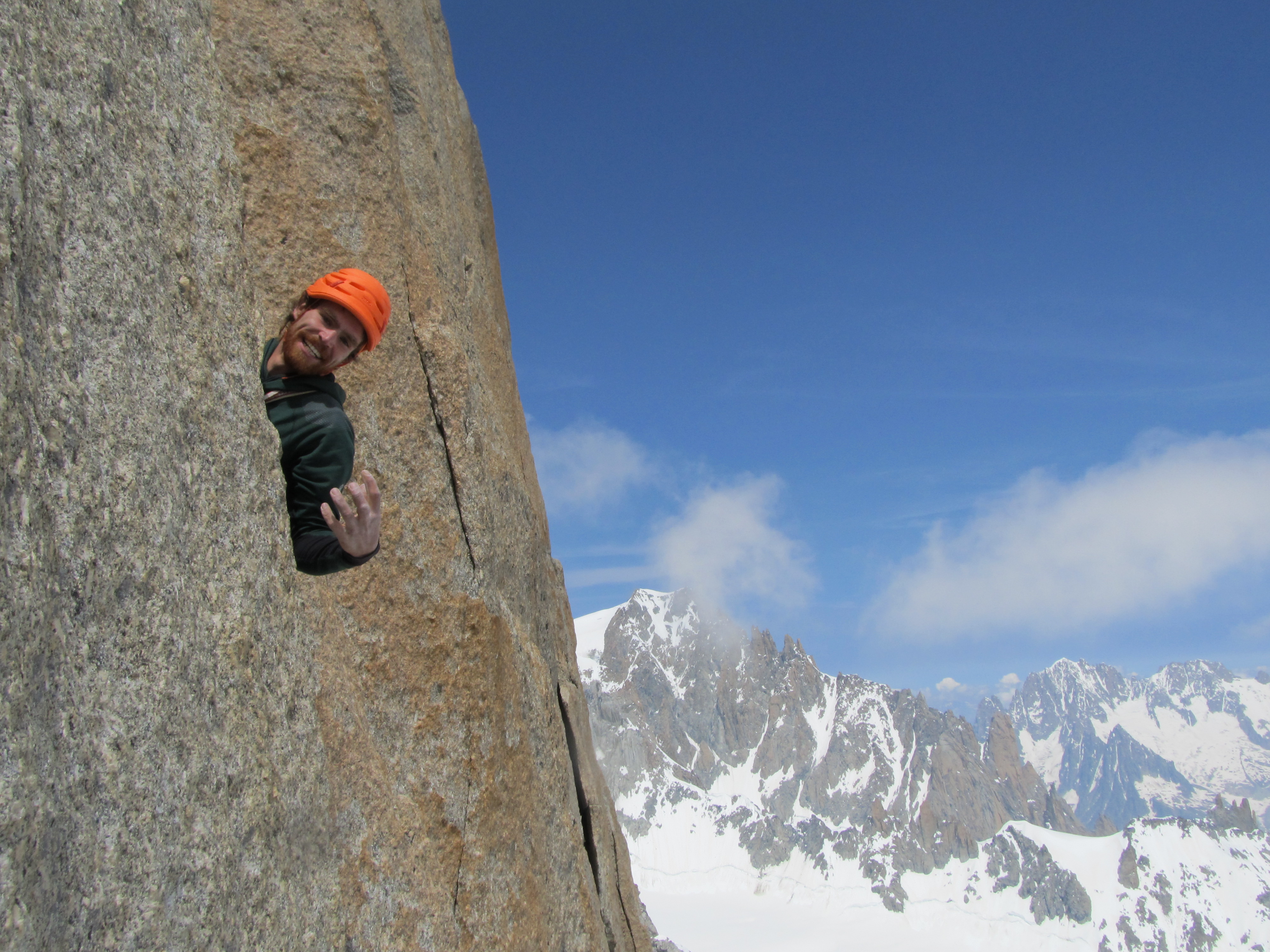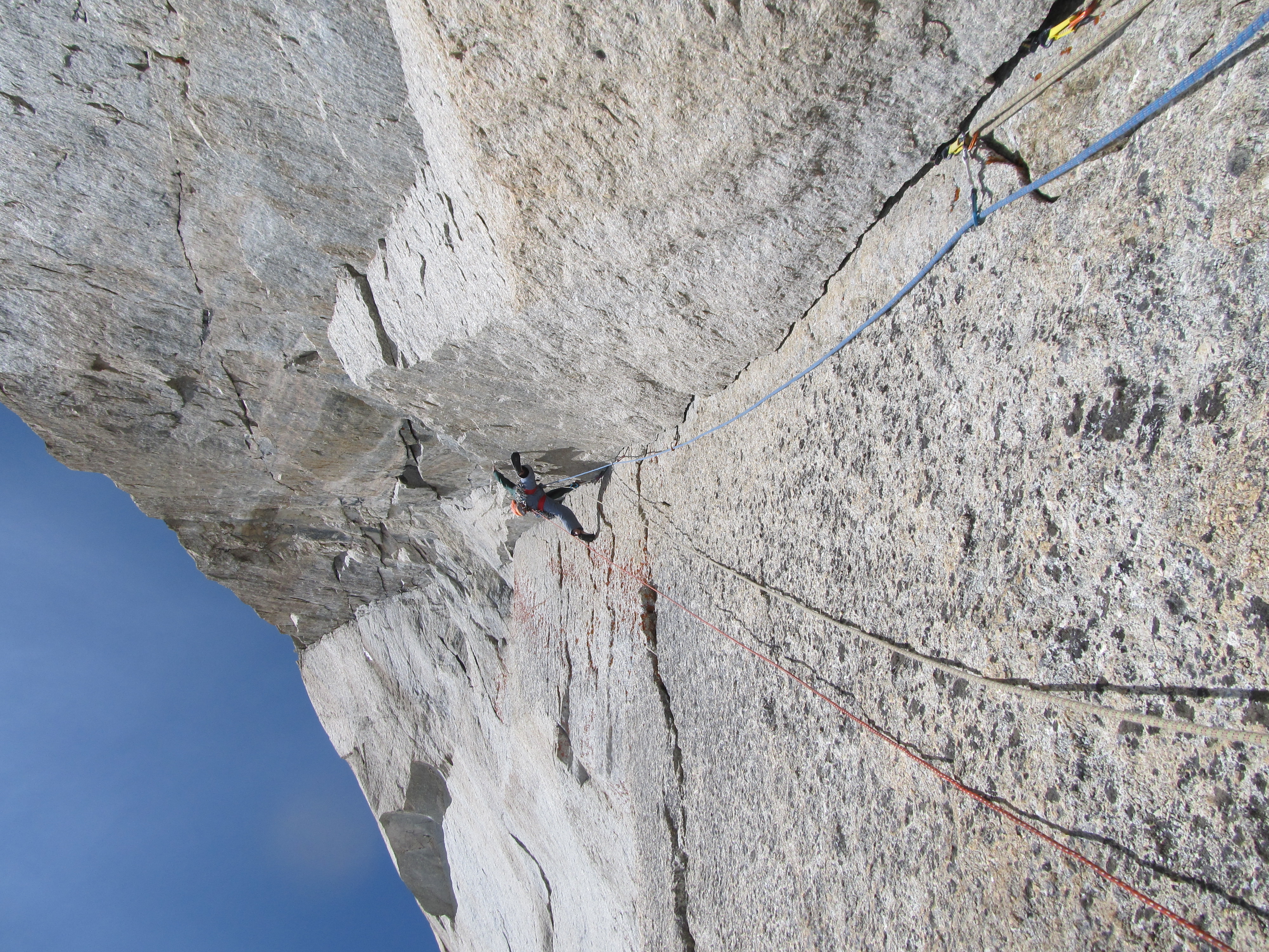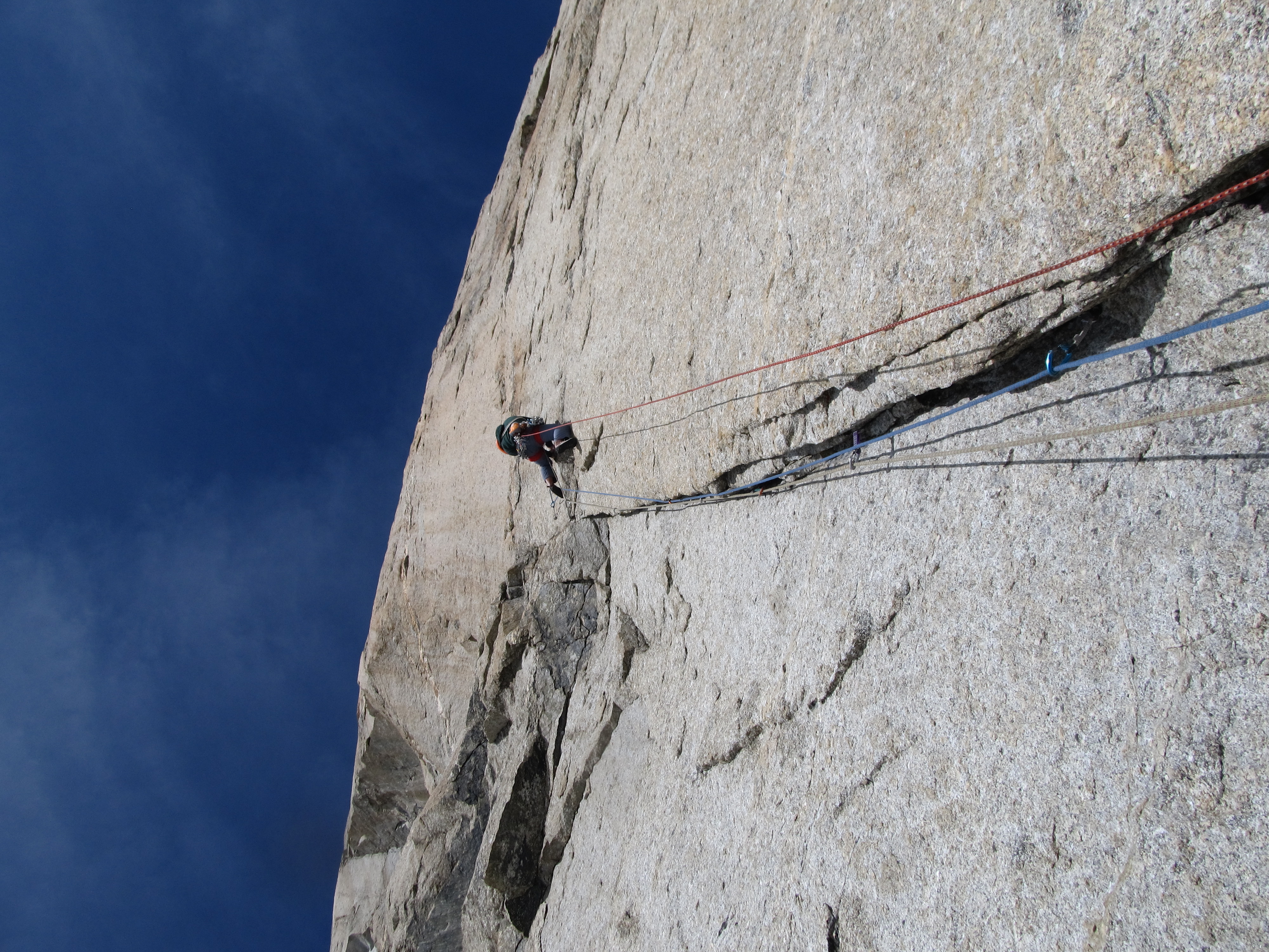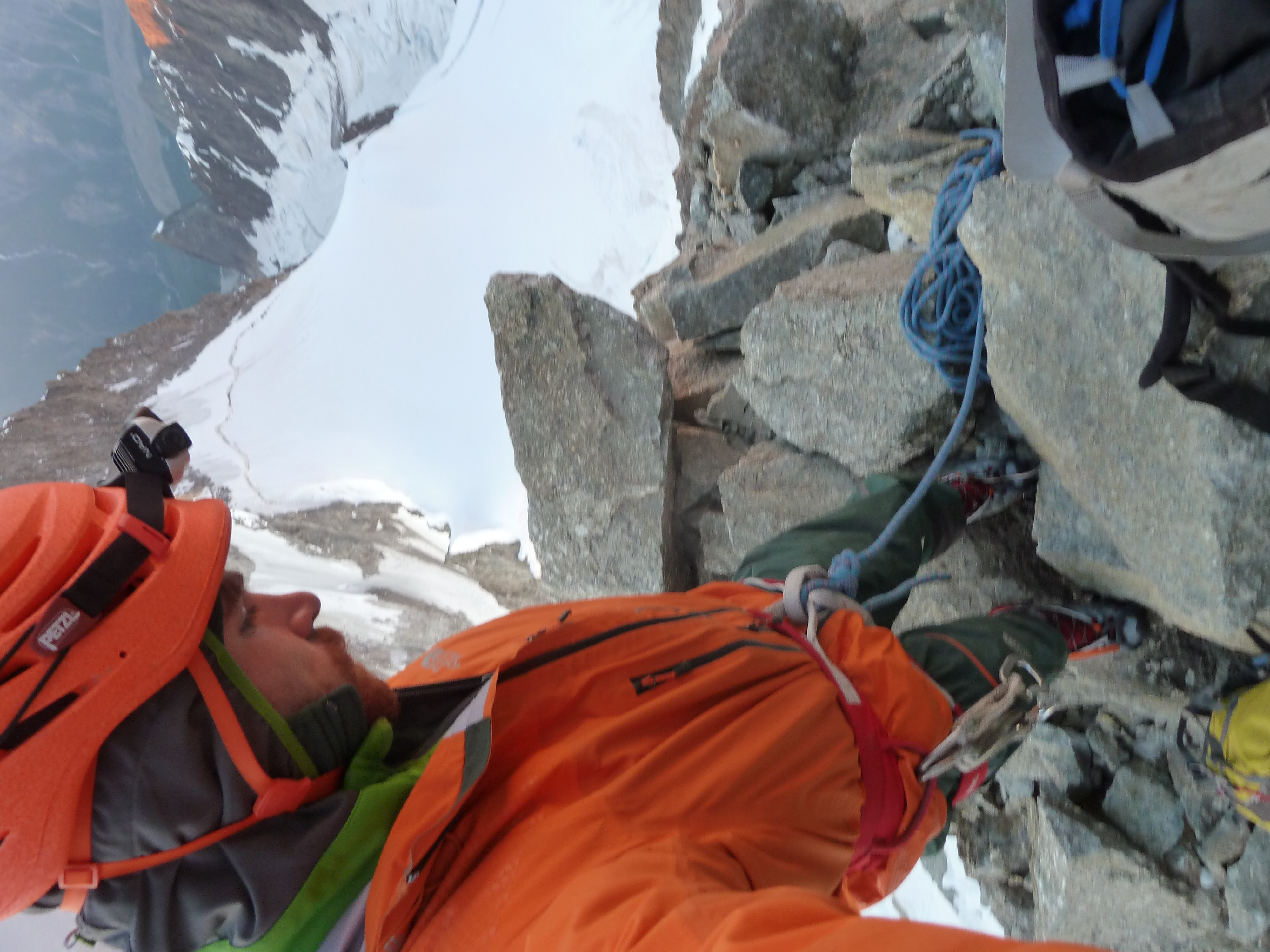 Het klimmen is uiterst technisch, soms dulferen, dan weer de voeten op kleine grepen zetten en af en toe een goede jam. Dat we bijna op 4000m zitten is pas echt duidelijk als we de 7c cruxlengte klimmen. Siebe klimt deze lengte supervlot voor, maar voor mij als naklimmer met rugzak is het serieus zuchten geblazen. Maar het gaat en ook ik klim de lengte vrij.Wat een ambiance ! Een licht overhangende dièdre, 600m leegte onder de voeten en rondom alleen maar bergen. Ik klim nog de 7a dakbarst en nadien gaat de rots meer over in dal, nog zo’n 250m tot de top van de GPA.