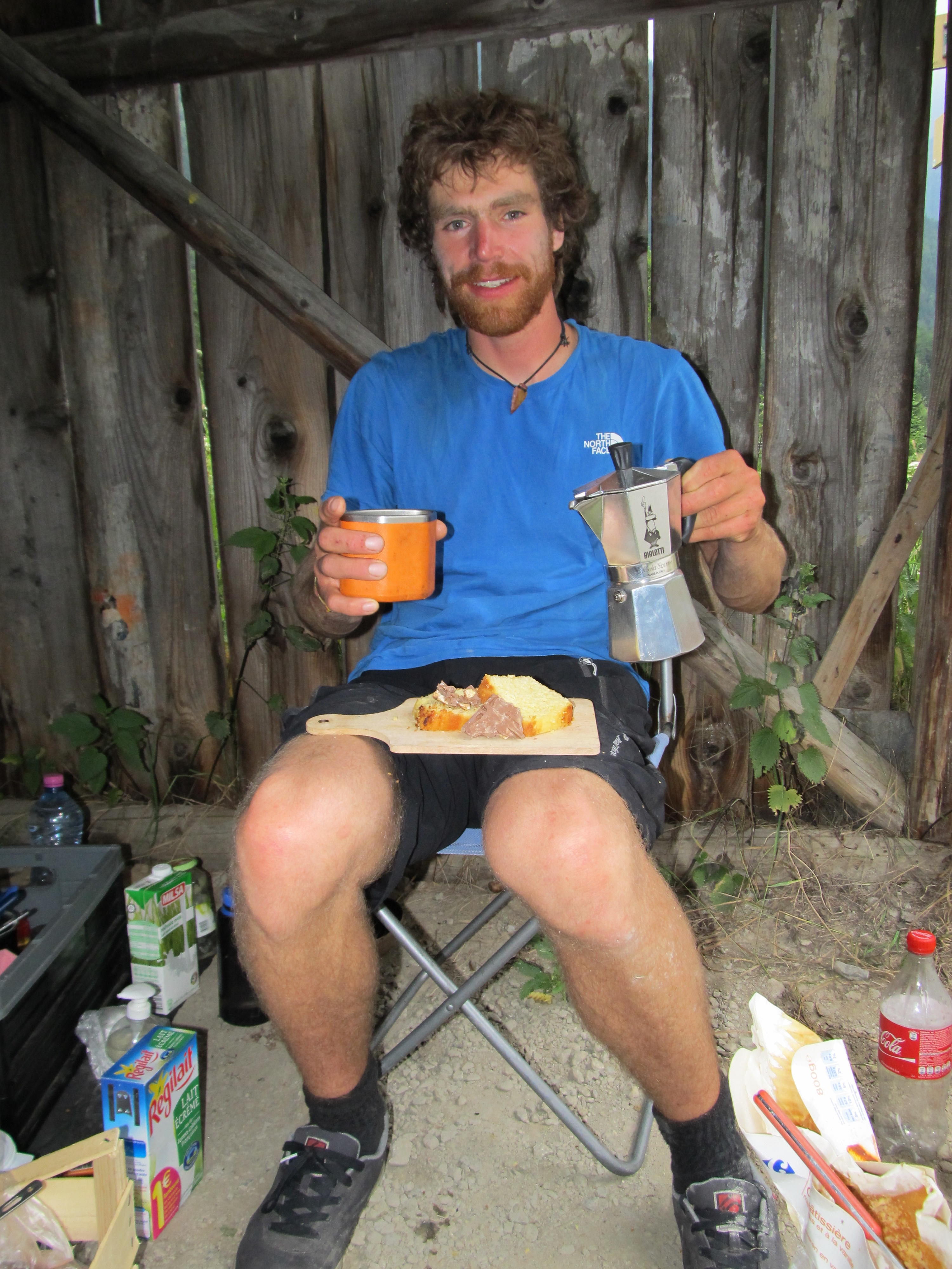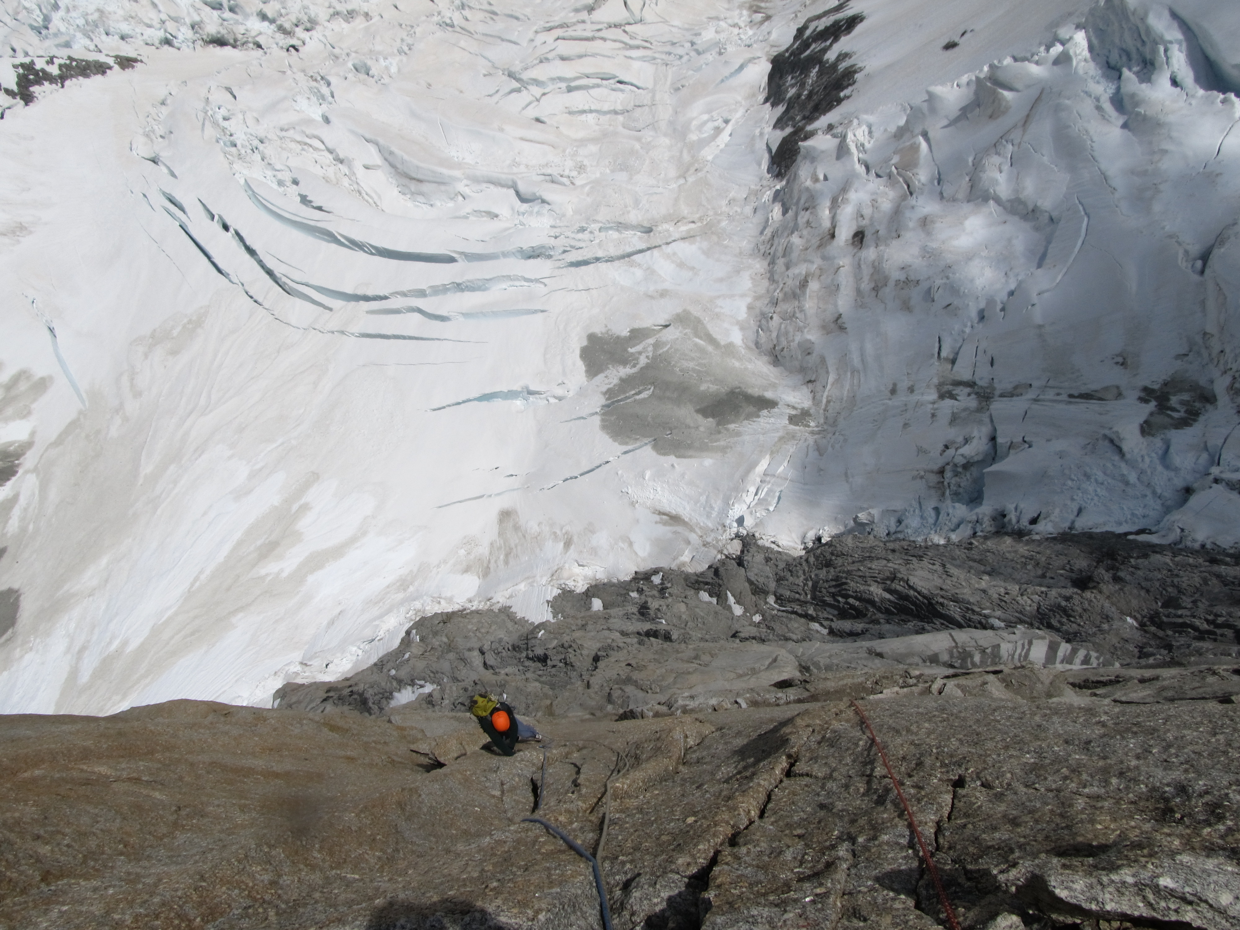 Met alle seracs, trikey rimayes en veel wandelen achter ons kunnen we nu eindelijk aan het echte klimwerk beginnen. 900 m rots doemt voor ons uit. Uit de topo kunnen we niet goed afleiden waar nu juist te beginnen. Uiteindelijk startten we aan het laagst mogelijke punt van heel de wand. Siebe begint en na nog geen 5 meter klimmen is al duidelijk in wat voor terrein we verzeild zijn geraakt : rommelterrein, losse blokken soms “ frigoformaat” groot staan op het punt te vallen. Het klimmen moet heel secuur gebeuren, Siebe bijt de spits af en na 50m stressen maakt hij relais. Pffff zo helemaal tot boven? De 2de lengte is al geen haar beter, de losse blokken zijn nog groter, maar er is een lichtpuntje in de duisternis. Na 50m vind ik een relais. Yessss!!!! Nu is het gewoon 400m recht omhoog tot we een bivakledge tegenkomen. Al is “gewoon” misschien niet het juiste woord. Het is gemakkelijk klimmen maar uiterst tricky. Overal losse stenen en enkele passages waar we compleet de weg kwijt geraken. Om 8 uur s’avonds komen er enkele wolken over de berg, we worden getrakteerd op lichte sneeuwval. Net dan ben ik aan het voorklimmen. Hopend op een bivakplek aan het einde van de lengte. En ja hoor, na 50m vind ik een platform, 2m op 3m perfect om een comfortabele nacht door te brengen met een magnifiek zicht.