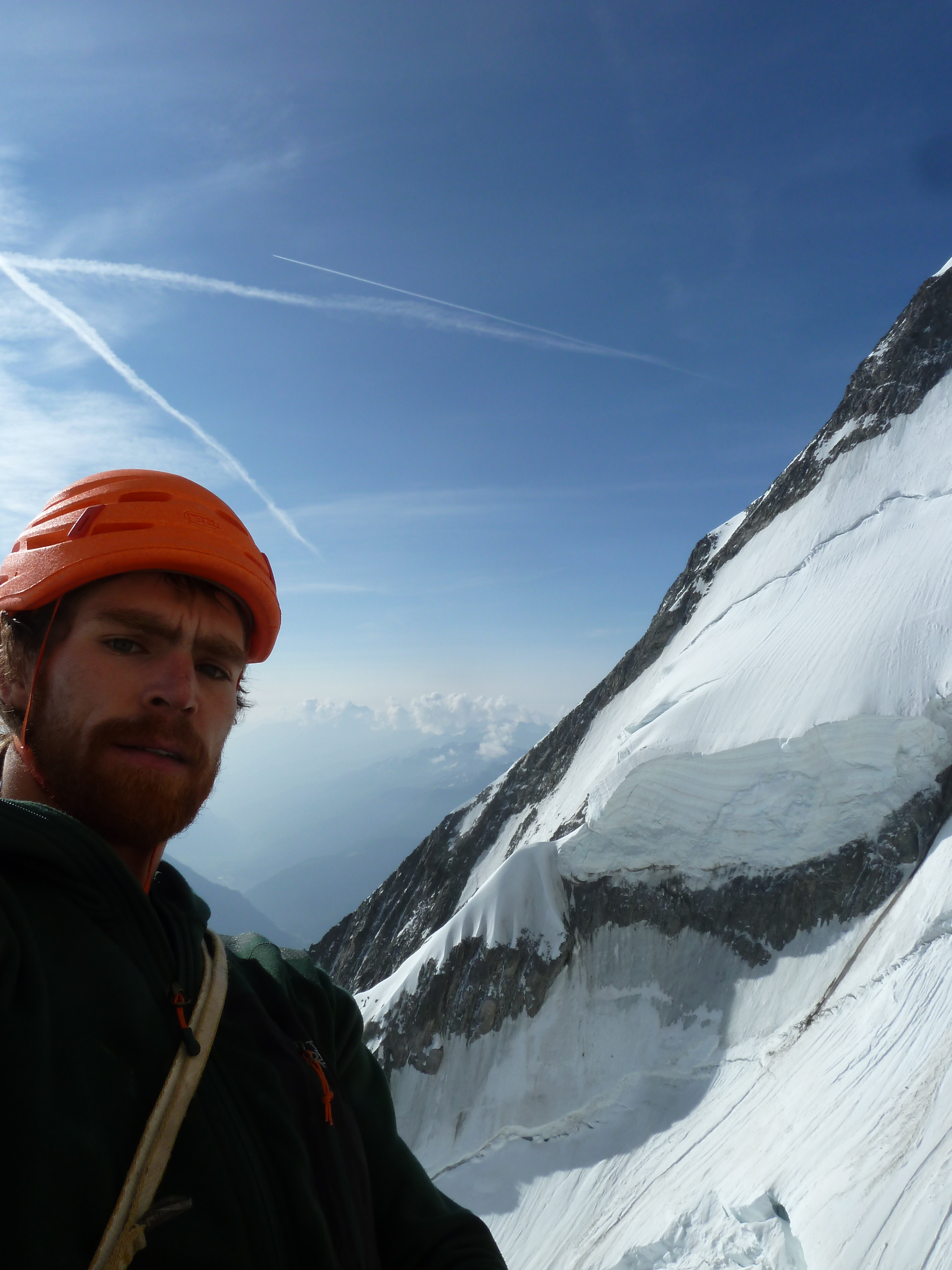 Een perfecte timing van meteo en rustperiode zorgt ervoor dat we zondagochtend de eerste lift van Aiguille du midi naar boven pakken. Doel : aanlopen naar Grand Pilier d’angle en de eerste 400m van Divine Providence klimmen. We hebben alleen het hoogstnodige mee, ons lichaam is fris en we zijn allebei heel hard gefocust. De aanloop op de gletsjer, naar het fourche bivak en terug naar beneden tot Col Moore loopt als een trein. Vanaf hier is het voor echt ! De seracs die aan de zuidwand van de Mont Blanc hangen kijken op ons neer. Jammergenoeg moeten we de gletsjer met alle seracs daarboven oversteken, de omgeving is een tijdbom en er is maar 1 ding dat we kunnen doen om zo snel mogelijk buiten gevaar te zijn : LOPEN!!!!!