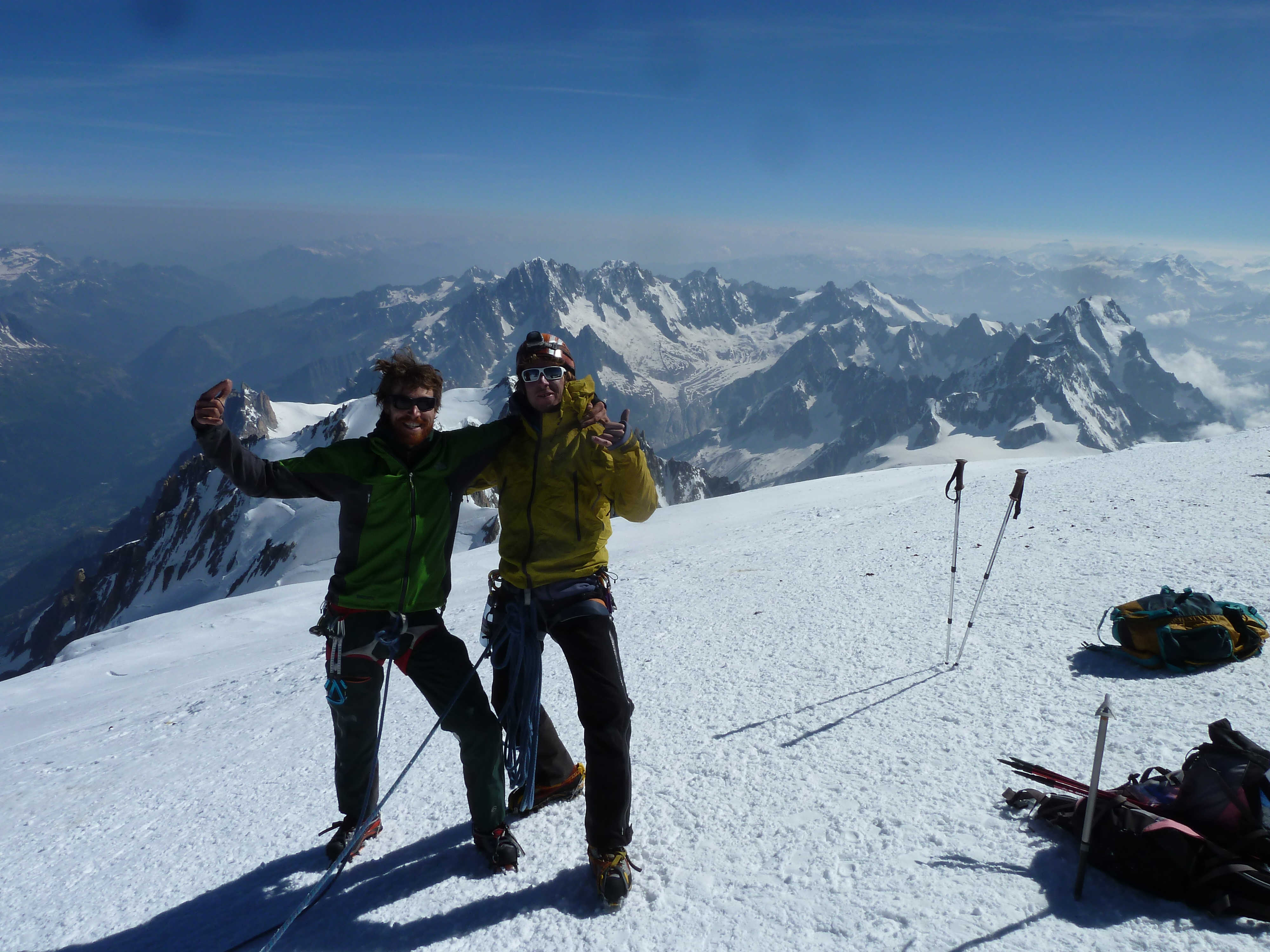 De ochtend nadien hebben we geluk. De koude heeft zijn werk gedaan en de sneeuw die enkele uren daarvoor nog pap was, is nu bevroren. Ondanks onze vermoeidheid is het echt genieten. De sneeuw is hard, we gaan goed vooruit en de uitzichten zijn echt impressionant. Naar het einde toe slabakken we een beetje en op een bepaald moment is het ineens weer “never ending” Tot we om de hoek komen van de rotsgraat, een 60m sneeuwgraat vormt de laatste rechte sprint tot de top van Mont Blanc de Courmayeur. Ik plant mijn ijsbijl in het laatste stukje overhangende sneeuw, zet mijn voeten hoger en jawel : we zijn er ! Wat een vreugde, wat een opluchting, wat een extreem goed topgevoel ! Ik ben zodanig blij dat de laatste helling tot op de Mont Blanc zelfs geen pijn meer doet.