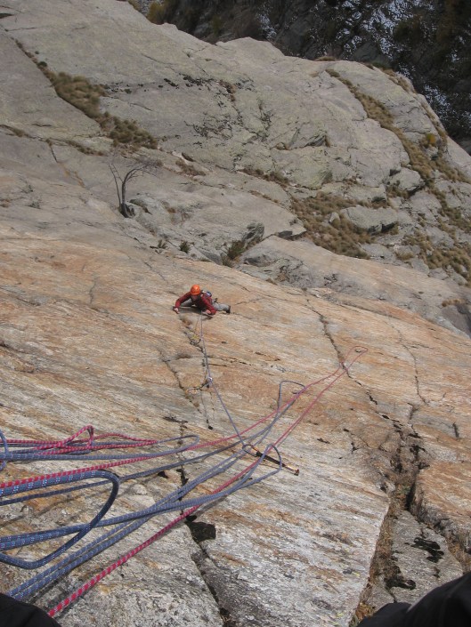 Om al wat te wennen aan de klilmstijl en ethiek in deze vallei, beklimmen we enkele van de klassiekers, waar zowat alle MCers ooit gepasseerd zijn. Door de strenge ethiek in Val di Mello, is er zo goed als geen behaking toegestaan hier. Zelfs op gladde platen, waar het steken van een nutje of een friend onmogelijk is, worden slechts op waanzinnige afstanden wat schaarse “colalipjes” van spits geplaatst. Maar in routes als Luna Nascente, Il Risveglio di Kundalini en Oceano Irrazionale vind je een opeenvolging van perfecte barsten, waar je alle maten van je friends in kwijt kan. Na deze fijne klimdag met eindelijk mooi weer, moet Sam helaas al naar huis en bereidt de rest zich voor op een eerste Bigwall. Het doel is het beklimmen van de Qualido oostwand, die met zijn 700m hoogte niet kan concurreren met El Capitan, maar een goedkoper alternatief hebben we niet. We kiezen voor de routes Melat, Artemisia en Magic Line. We zijn nog met 8 en we maken drie teams. Met wat moeite heb ik net voldoende bigwall-materiaal bijeen kunnen sprokkelen, 3 haulbags, 3 portaledges, touwen, laddertjes, daisy chains, fifi’s,… Maar in drie portaledges kan maar 6 man slapen. Een zoektocht naar nog 2 hangmatten levert niets op. Desondanks stijgen we in, met het weerbericht van de campingbaas: “ten days of perfect weather!”