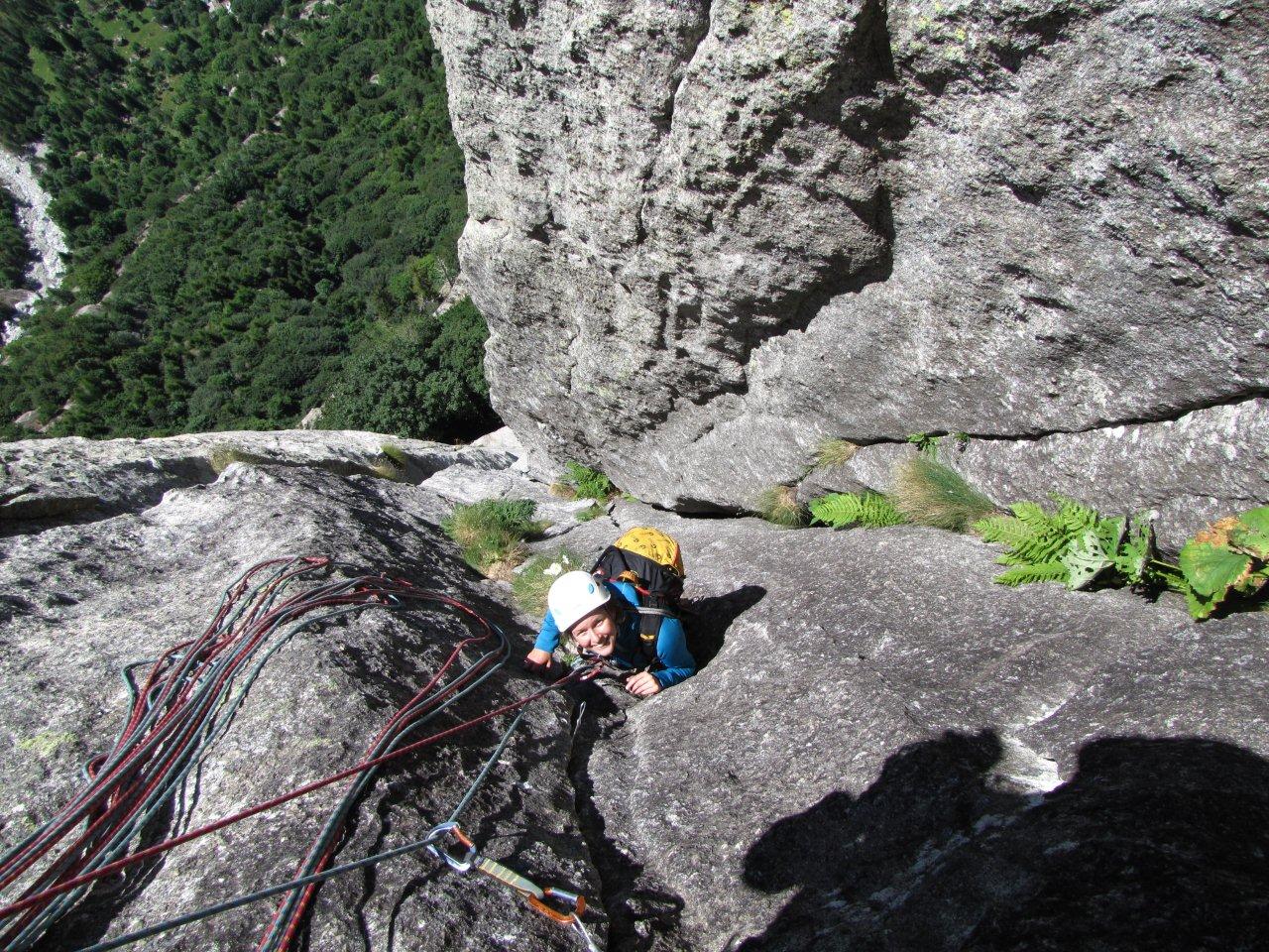 De eerste route die we klimmen is de Via Vinci op deze zuidgraat. Een heerlijke, messcherpe graat over de beste graniet loopt naar punta Angela. Door mist en los gesteente, besluiten we om niet naar de eigenlijke top van de Cengalo te gaan, maar om te rappelen langs de westwand. Daarna het bivakmateriaal ophalen en hop, nog een stevige drie uur stappen naar het Moltesi-Valsechi bivakhutje in de val del Ferro. Voor de volgende dag was er regen voorspeld en we willen dan niet in de open lucht slapen. Moe maar voldaan komen we aan in dit hutje, waar 4 Italiaanse trekkers zorgen voor een vrolijk getater dat ons net iets te lang duurt na het slapen gaan.