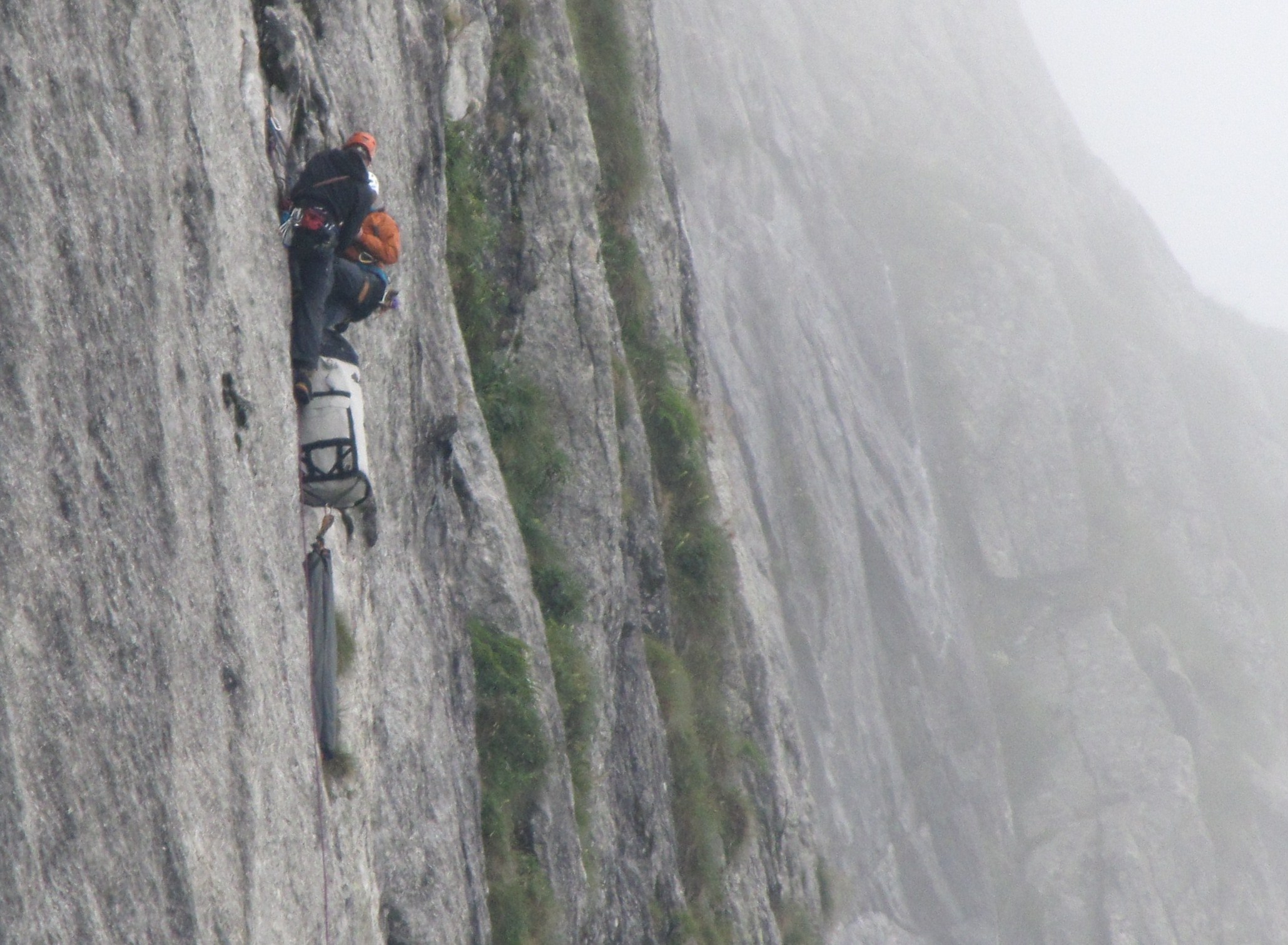 ’s Ochtends zit alles potdicht. Snel klimmen we nog enkele lengtes tot aan de richel, waar de moeilijkheden voorbij zijn en waar enkele derdegraadslengtes naar de top leiden. Maar zover komt het niet, we moeten afdalen want het begint te regenen. Tot zover de 10 dagen perfect weer. Die Italianen toch hé. Afdelen met haulbags in een wand waar de regen over stroomt is geen plezier, maar hard werken en het verstand erbij houden. Doorweekt komen we terug in het hotel Qualido, waar we onze kleren drogen bij een rokend kampvuur. Na nog een gevriesdroogd festijn, dalen we terug af naar de vallei. De bigwallstage zit erop. Marijke en Bram rijden terug naar huis.