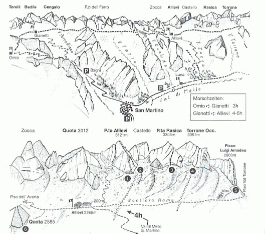 Ik wou altijd al eens een week doorbrengen op “de tweede verdieping” van Val di Mello, wat eigenlijk de Bregaglia heet. Hier loopt de fameuze via Roma, een zware hooggebergte trekking, onderlangs enkele bekende bergen, zoals de Piz Badile, Piz Cengalo en Punta Allievi. Twee hutten, Gianetti en Allievi bieden mogelijkheid tot overnachten en daarnaast nog enkele bivakhutjes. Met z’n zessen kiezen we voor de zero-budget oplossing. We nemen voor een week eten mee en zullen onderweg bivakeren. Het wordt een stevige week, die begint met 1700Hm stijgen naar een bivak onderaan de zuidgraat van Piz Cengalo 3370m.