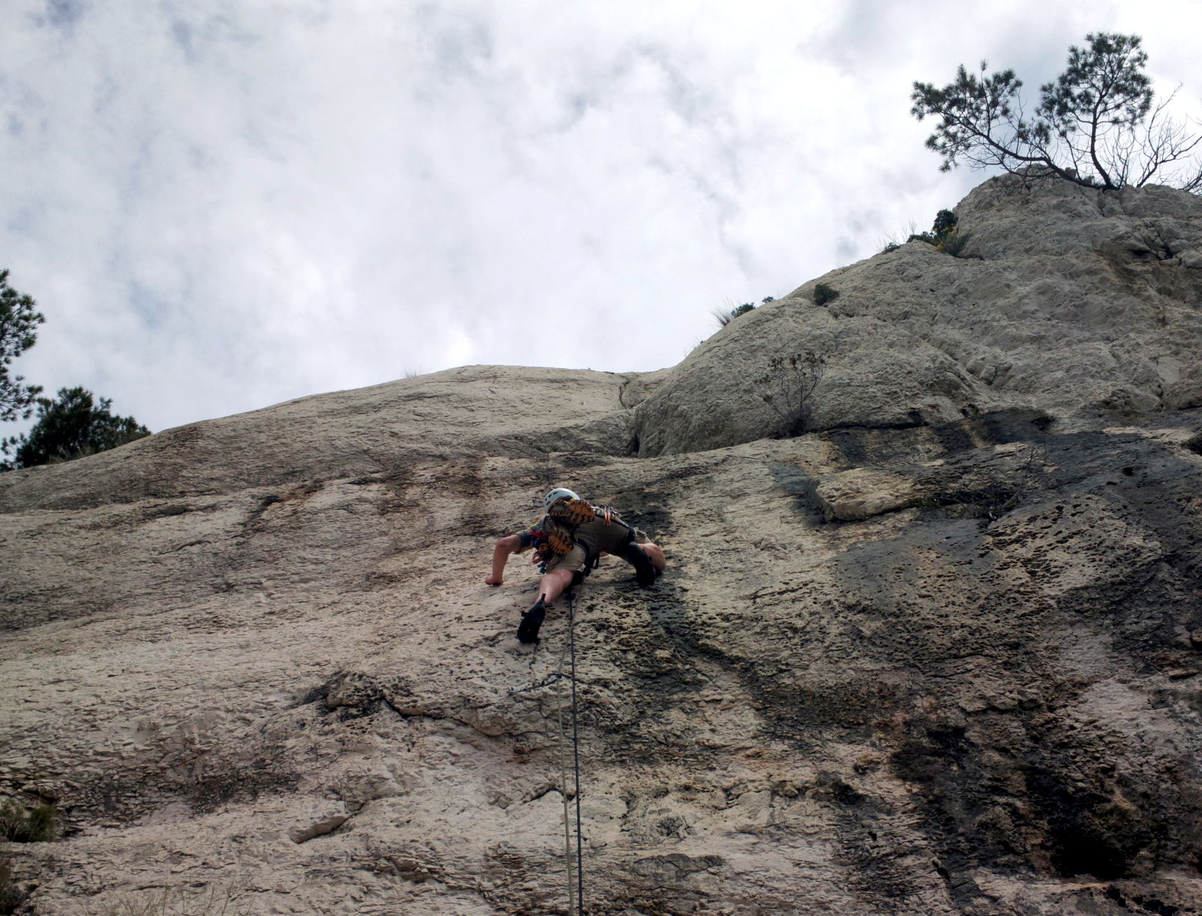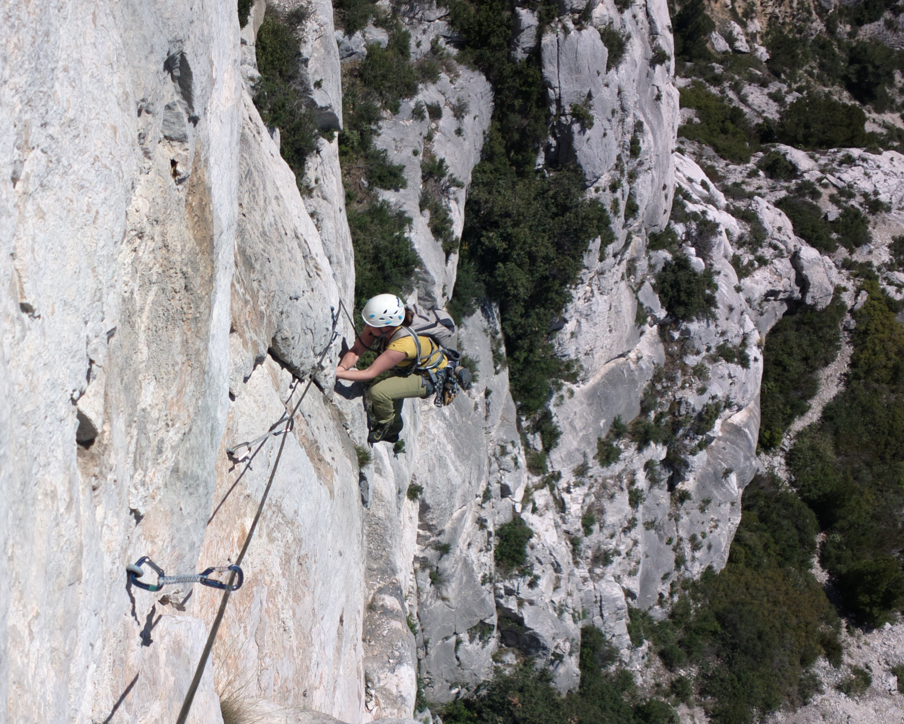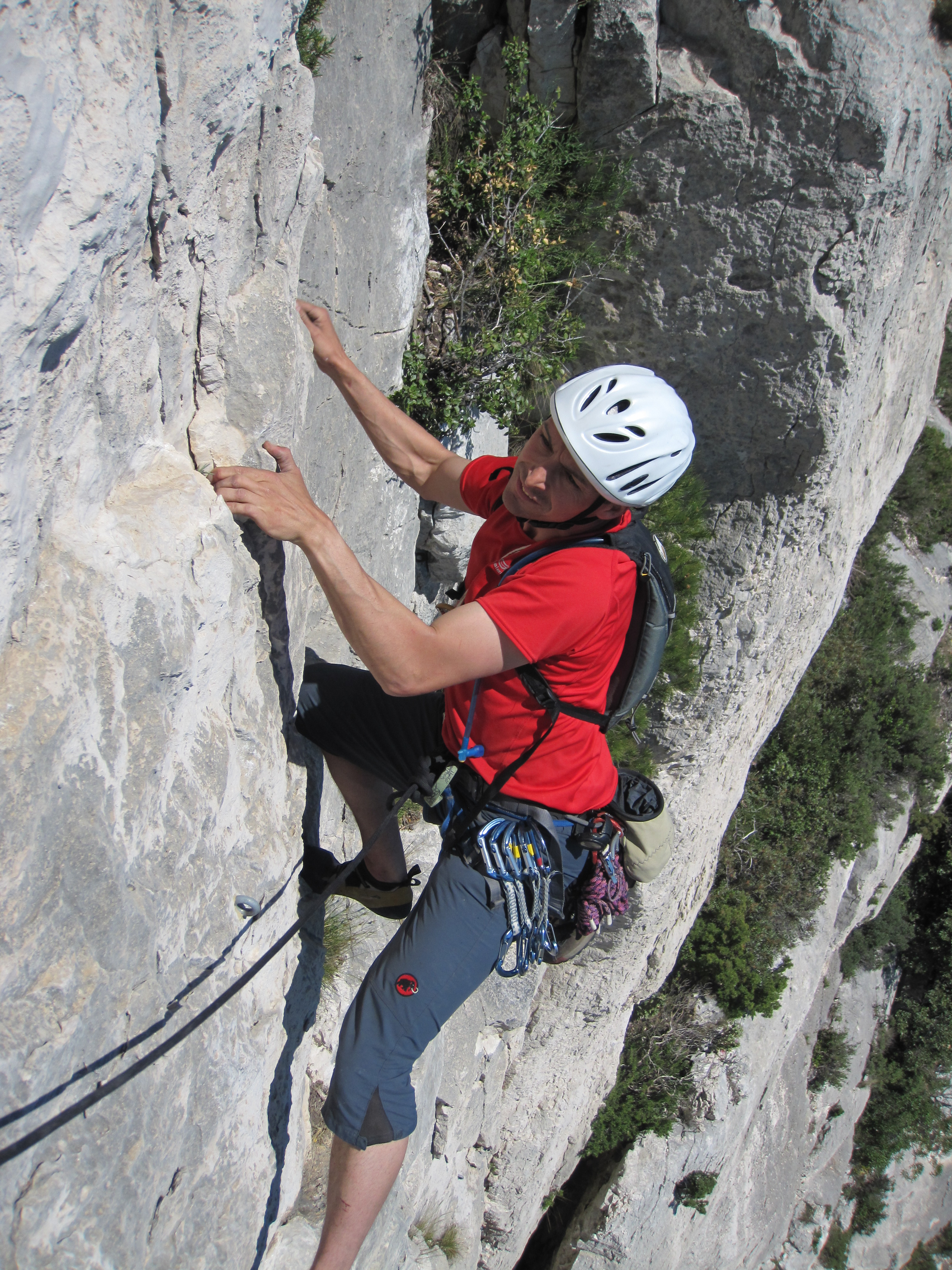 Op dag 2, vrijdag 10 mei was er minder sprake van “a walk in the park”. Deze keer gingen we naar de “Socle de la Candelle”, de onderste sector van een rotsformatie met daarboven de “Grande Candelle”. Beiden zijn verbonden via een korte wandeling. De eerste route van An Laenen en Jeroen, een mooi overhangende 6a uit een combinatie van “Pillier de l’Enclume” en “Civa”, 12L 6c max deed hen meermaals fronsend naar de topo kijken. Desondanks gaf het enkele fotogenieke momentjes in de laatste lengtes. Terwijl An en Jeroen uitgewaaid werden voor de lens van Sanne, zaten Steve, Friedemann en Denis toch iets meer afgeschermd van de wind in de “Armata Calanca”, wat na afloop van de stage tot mooiste route zou verkozen worden. 320 meter goodness verdeeld over 12 lengtes, 6c max. Kristof en Sanne hadden een mooi overzicht vanuit de “Mahavishnu” gecombineerd met “La Centrale”, 8L 6b+ max en Arne, Niels en Sebastiaan kropen in “Les Hommes Volants”, 8L 6c max.. Iedereen maakte die dag kennis met de beruchte mistralwind.