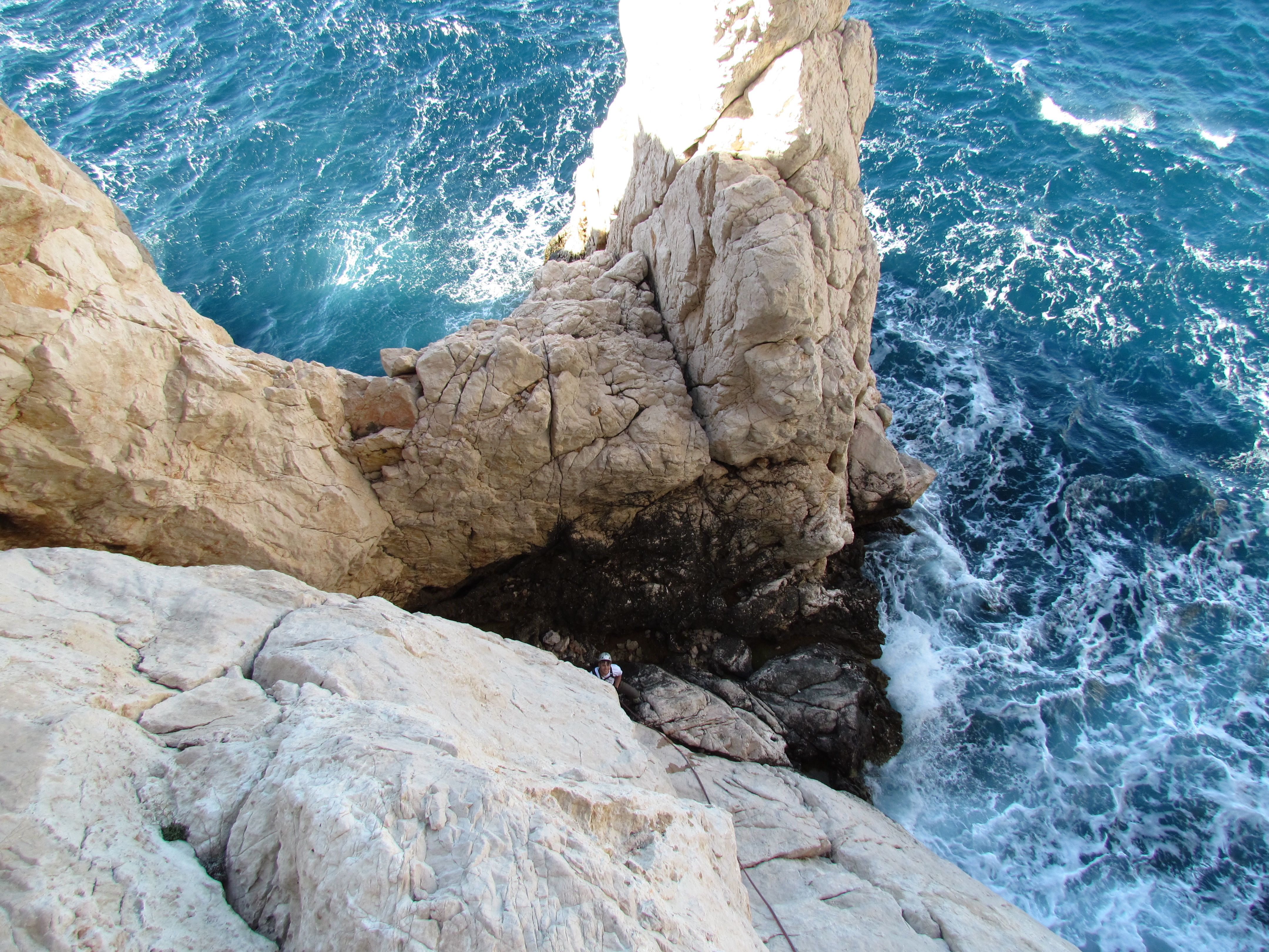 Denis en Sanne hadden geen bezoek in “Le festin de Satan”, 12L 6c max, een route die slechts na een rappel tot vlak boven het water gestart kon worden. De start van de route vinden was niet evident, want je moest op zoek naar de relais om van daar naar de start van je route te rapellen. Ook hier deed de mistralwind bij momenten lastig, het touw werd uitgesmeten en hing plots een paar meter hoger dan van waar je het uitgeworpen had. Ook moest Sanne Denis er in de route even aan herinneren niet aan zijn linkerkant te pissen als de wind zo hevig naar rechts waaide.