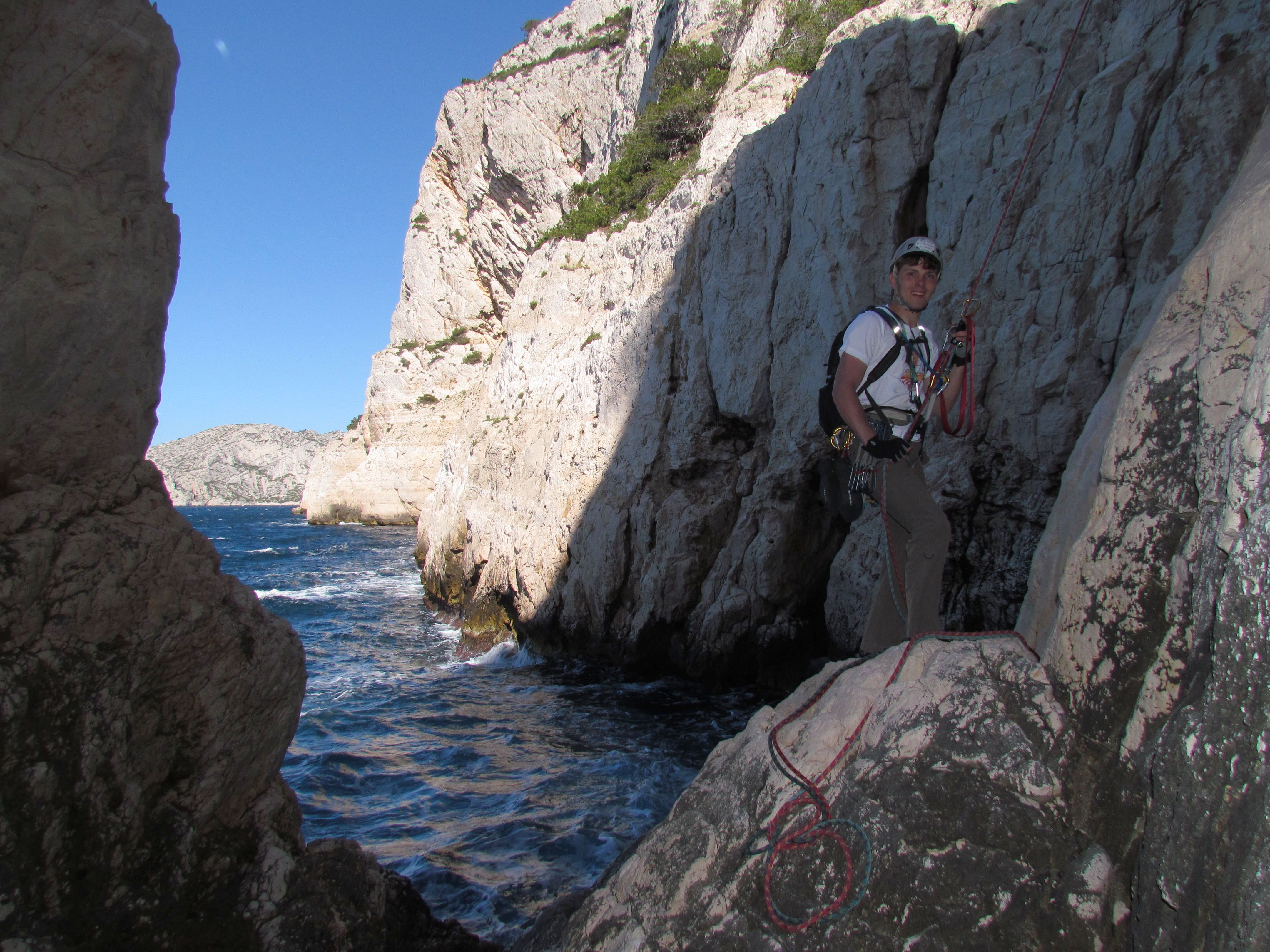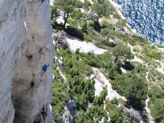 We vertrokken woensdagavond in de gietende regen om donderdagochtend in het zonnetje aan te komen in Camping les Cigales te Cassis. De camping was hopeloos volzet maar Sanne wist nog 2 plaatsjes te versieren voor het MC team. Welke oneerbare voorstellen hij daarvoor heeft moeten doen is tot op heden een militair geheim gebleven. Het opbouwen van de kampplaats gebeurde met een bijna griezelige efficiëntie, al mocht het van Sanne allemaal nog wat sneller. Door de onverwachte wijziging van klimgebied, van Presles naar de Calanques werden plannen B, C en D last-minute toegelicht. Die eerste dag zouden we iets kort klimmen, we hadden net de hele nacht doorgereden en wat tijd verloren op de camping met de campingplaatsen te regelen en de tenten op te zetten. Enkele uren later stonden we onderaan plan C en konden we eindelijk beginnen waarvoor we kwamen: klimmen. “10 heures moins le quart pour le Grec” (6b/6c/6b) was naar de mening van Sebastiaan een beetje slap gequoteerd maar desondanks hebben we aangenaam kunnen kennismaken met de heerlijk ruwe rots en lekker scherpe regletjes, uitgecorrodeerd door waterdruppels die zo typisch zijn aan de streek. Andere touwcordées klommen “Le Droit de Rêver” (3L, 6b max), “Six à Nous Trois” (4L, 6a max) en “Voie du Sommet Nord” (4L, 6b max). Allemaal tof, al zijn ze wat kort, behalve die laatste waarin Steve en Niels plots (ondanks wat de topo zei) voor onbehaakt terrein stonden en Niels als voorklimmer zijn lengtes mocht afzekeren en relais maken op de weinige nuts die hij gelukkig toch mee had.