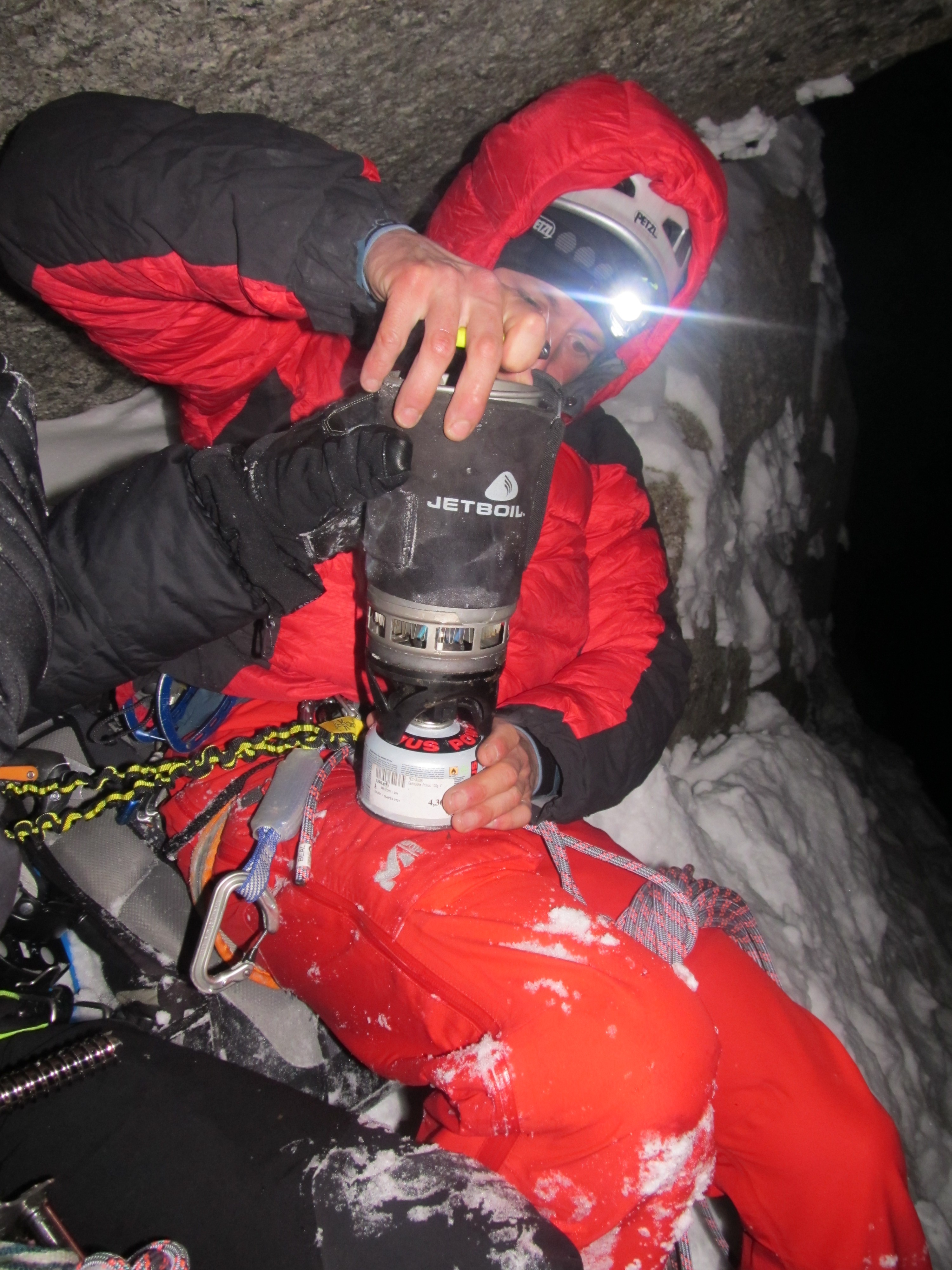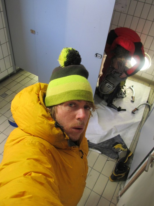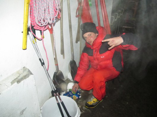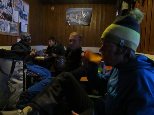 Dit keer moesten we niet buiten op de grond slapen, maar konden we een verwarmde kamer delen met 2 fransmannen van de GEAN(groupe excellence alpinisme). Hun plan was om 3 dagen de Drus in te kruipen en een route te proberen die slechts zelden herhaald is. Een verwarmde omgeving kan blijkbaar wonderen verrichten. Het opstaan ging geweldig vlot en voor een keer moest ik niet eerst 15 keer op de snooze knop drukken alvorens uit die slaapzak te kruipen.