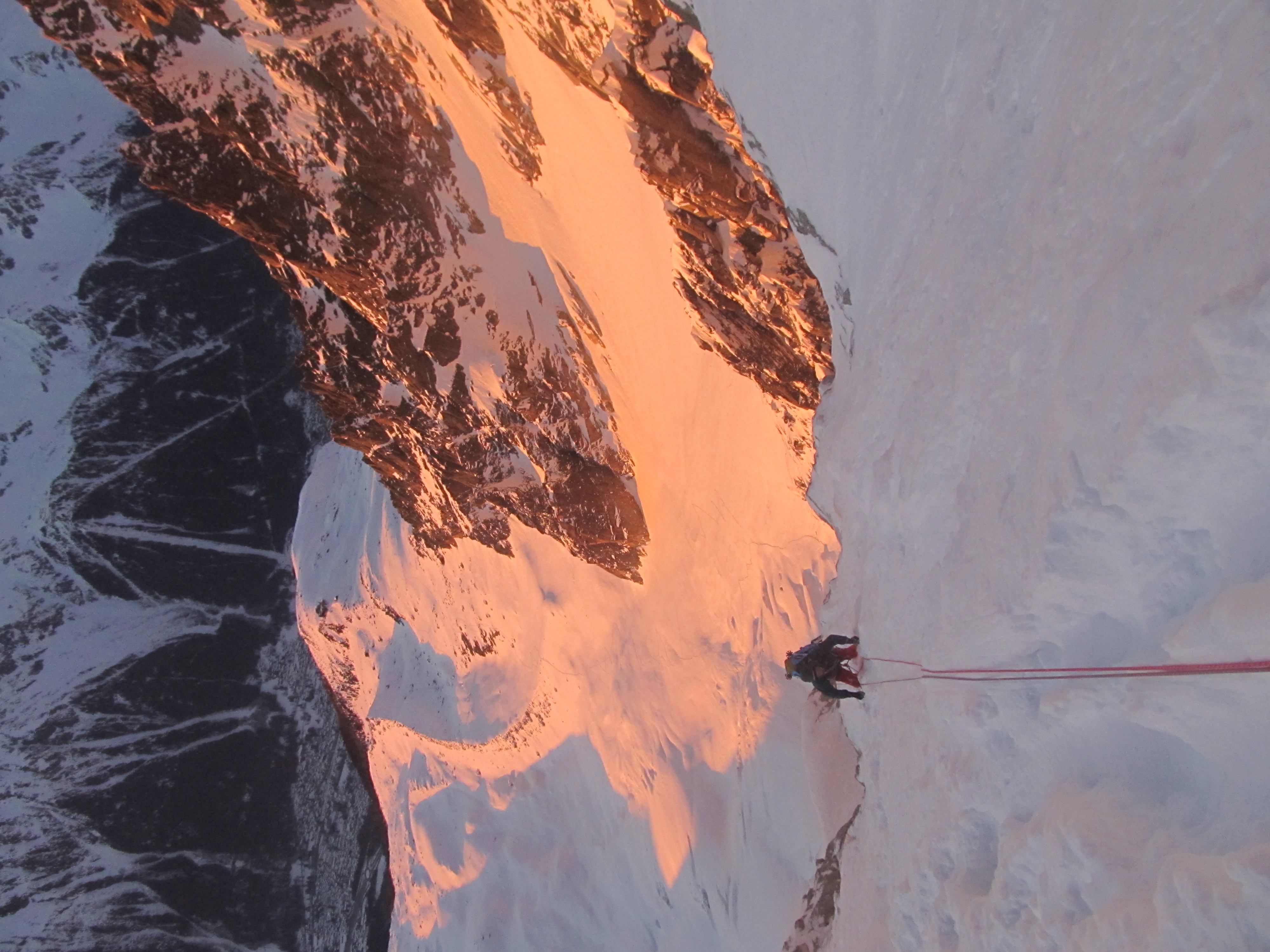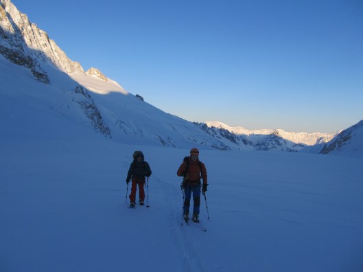 Dankzij de goede navigatieskills van Renaud konden we feilloos een weg banen doorheen de crevassen en waren we tamelijk snel beneden op de glestjer.” Putain c’est horrible ce vent” hoorde ik Renaud nog roepen. Een aangekondigde noordenwind blies harder dan verwacht, en ondanks het stijgen naar het begin van de route kregen zowel Renaud als ik het niet warm. Tim VH Daarintegen was goed aan het zweten omdat de vellen van zijn approche ski’s niet meer plakten.
