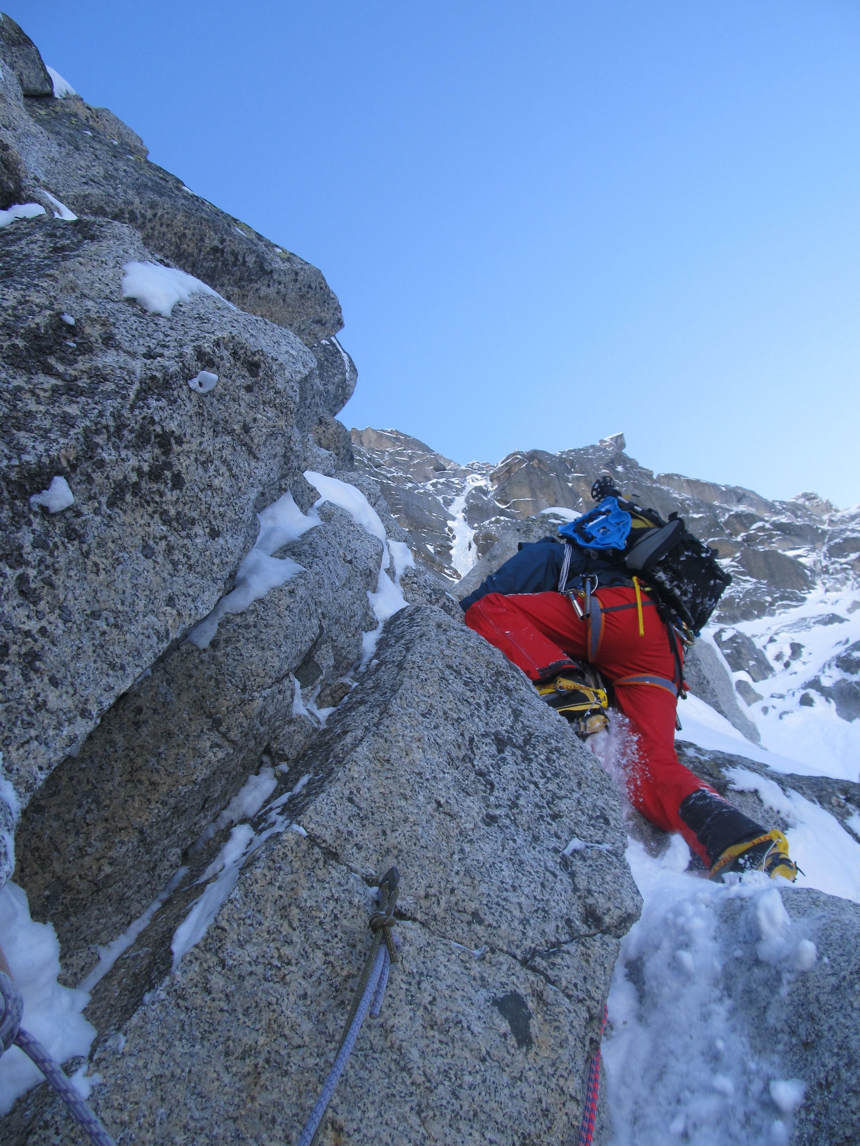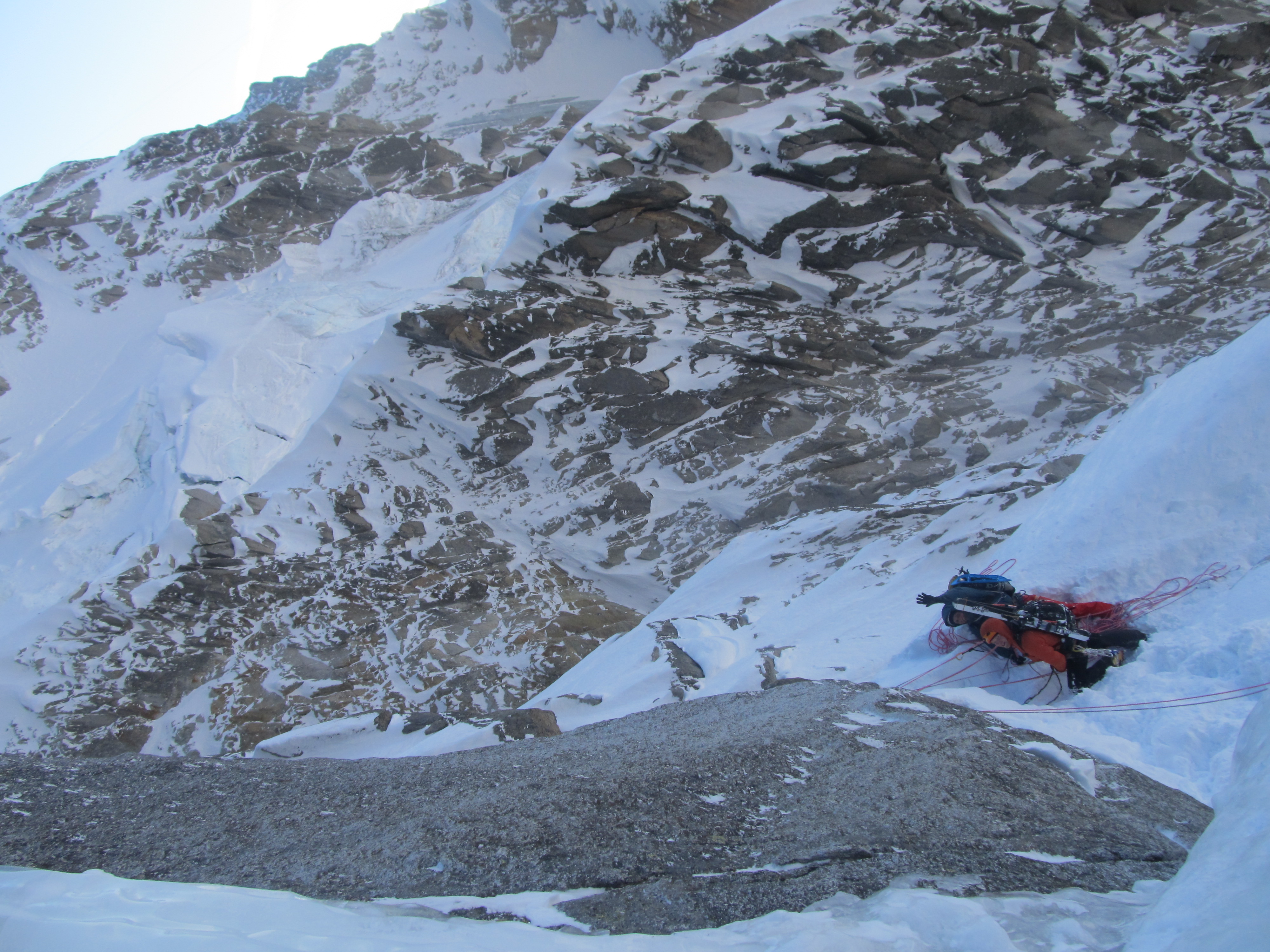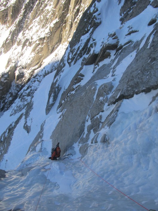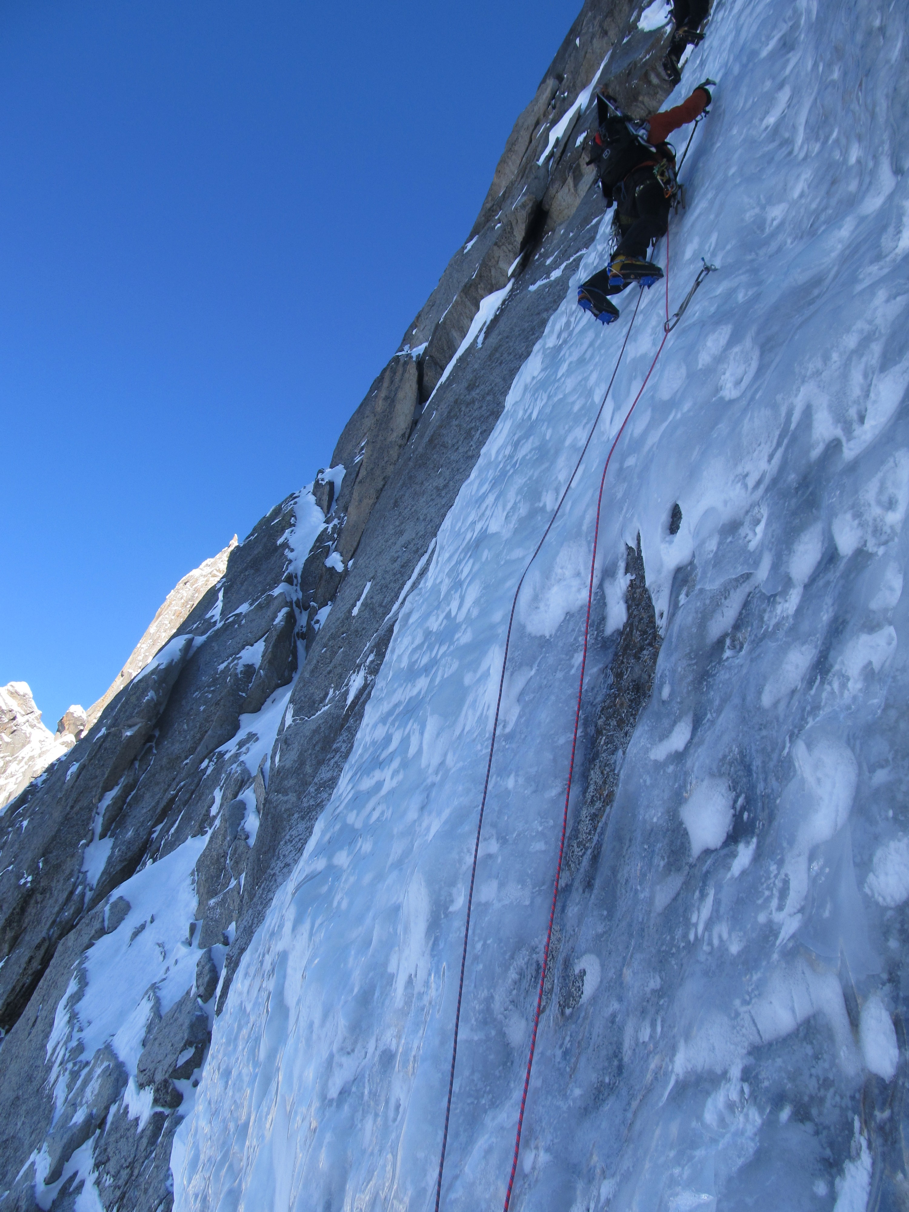 Wij schoten deze keer wel goed op en ondanks de grote hoeveelheid sneeuw geraakten we vlot tot onderaan de crux. Ik stelde Tim VH voor om deze lengte voor te klimmen, zo kon hij zijn nieuwe bijlen eens degelijk inwijden. Maar 10 meter ver in deze lengte sloeg de verzuring toe in Tim zijn kuiten en geraakte hij niet meer verder…en toen was het aan mij om voor te klimmen Op bepaalde stukken was het ijs echt loodrecht, door de koude was het bikkelhard en de ski’s op mijn rug trokken mij naar achter. Ik heb echt moeten vechten en volgens mij is deze lengte eerder 5+ waard i.p.v de 4+ quotatie die de topo aangeeft.