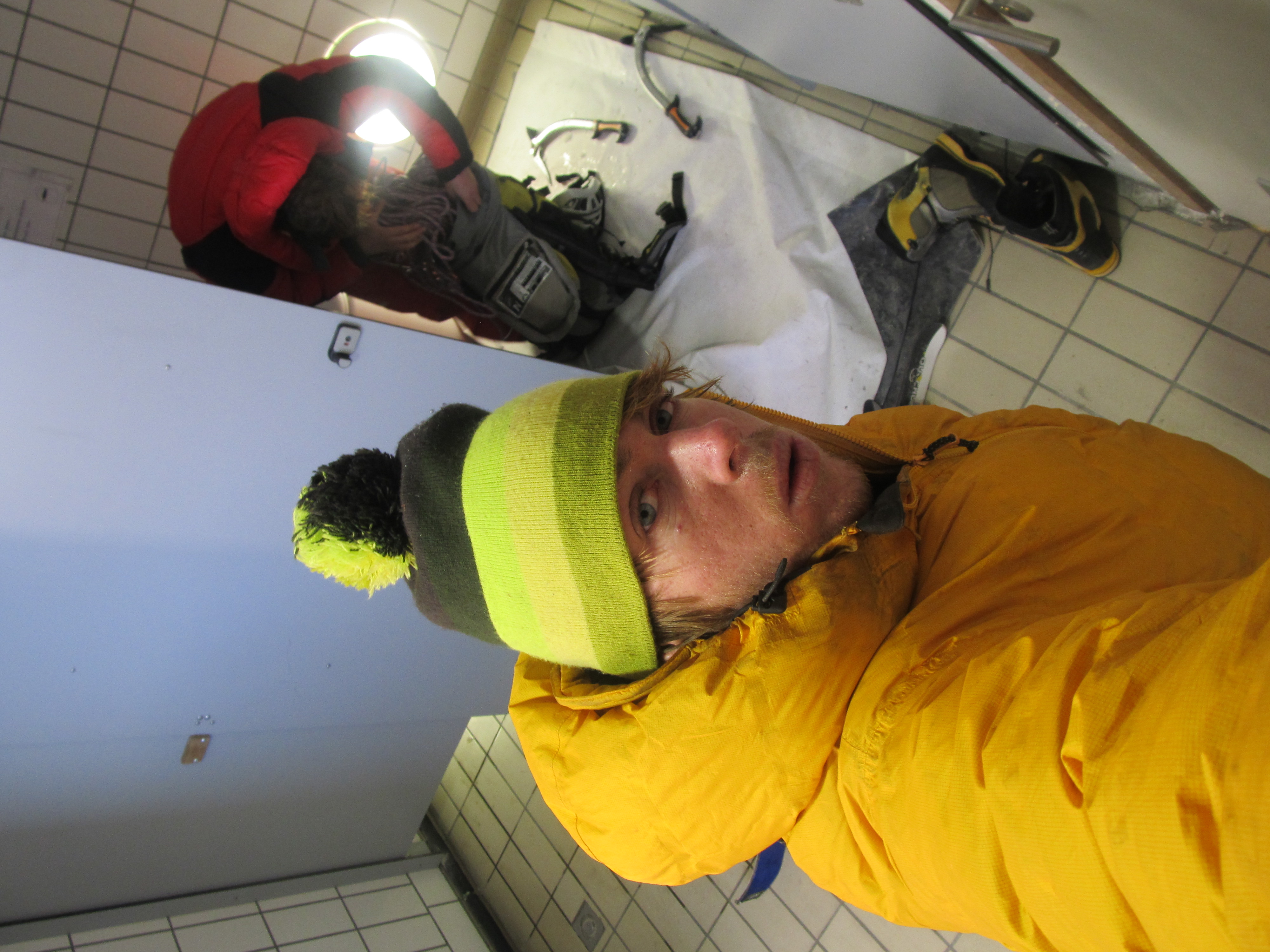 Erna kwamen nog 3 gemakkelijkere lengtes ijs en met af en toe nogal heftige spindrift werden de condities alsmaar extremer. Net voor het laatste sneeuwveld werd het donker. Normaal was het vanaf dan gewoon sneeuw tot aan de brèche. Maar niet overal lag de sneeuw even dik, en er kwamen ook al eens ijs en rots te voorschijn. In goede omstandigheden ga je op zo’n sneeuwveld gewoon solo. Maar met deze condities en een toegenomen vermoeidheid besloten we om toch maar enkele lengtes af te zekeren. Uiteindelijk kwamen we tegen middernacht volledig afgepeigerd toe op de midi-plan graat en toen begon de lange lijdenstocht terug naar het liftstation. Nog eens 5 uur later arriveerden we op de plaats waar warmte en veiligheid elkaar verenigen “de toiletten van Aiguille du midi”