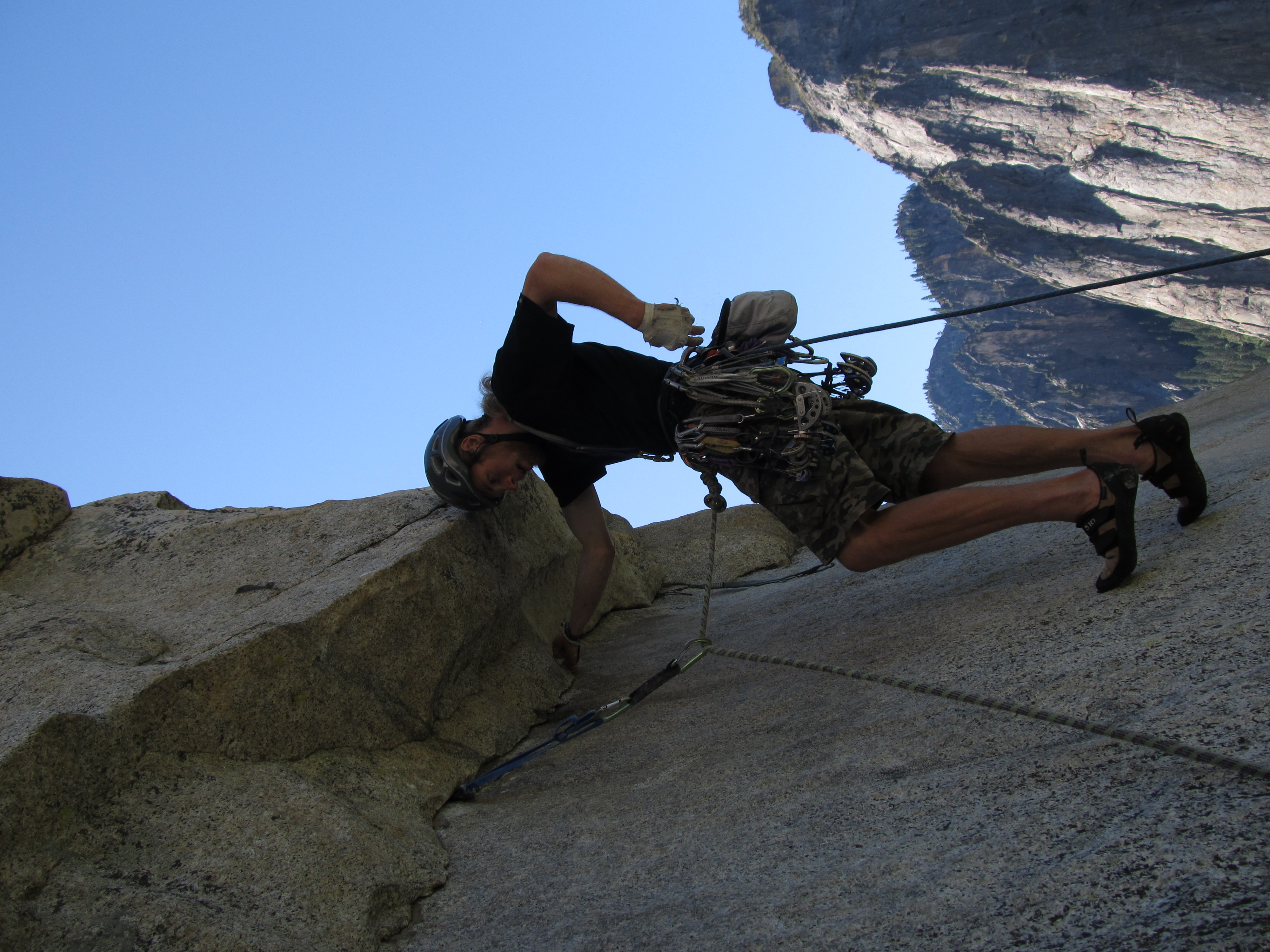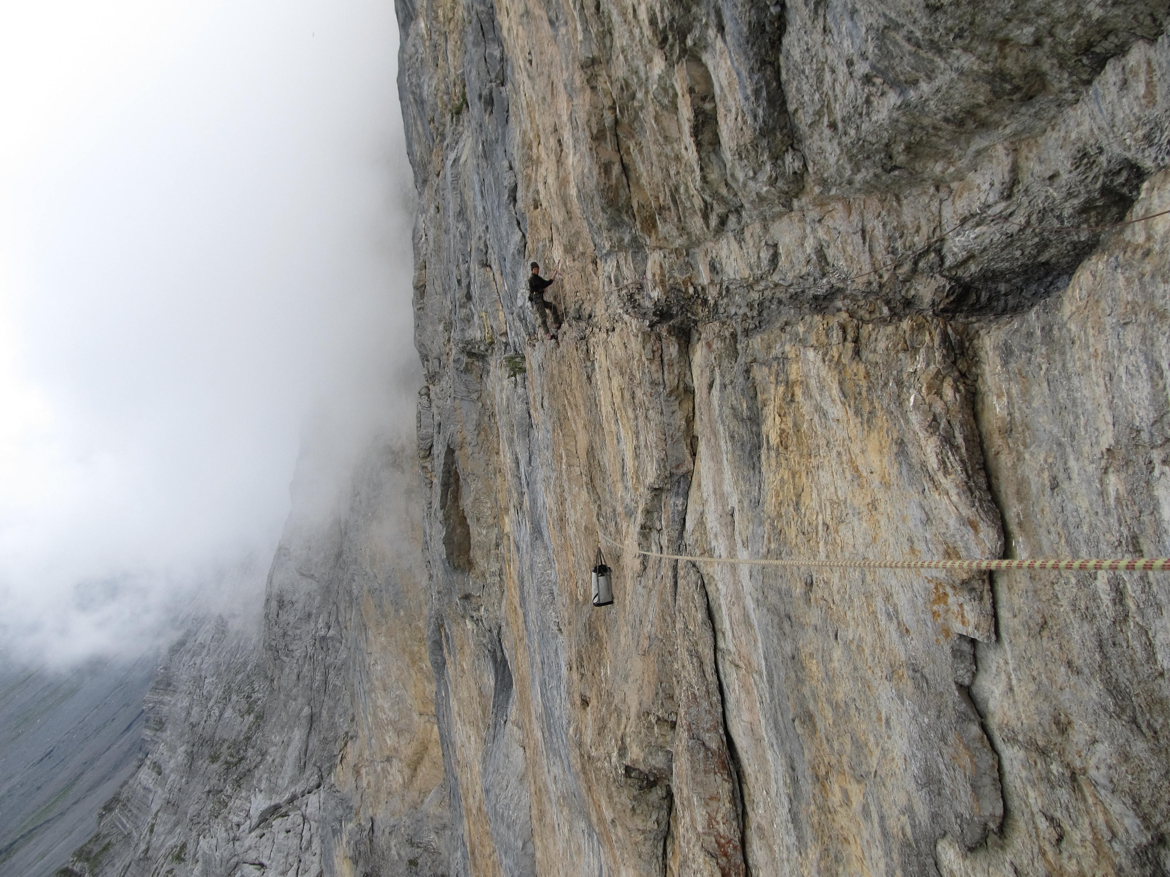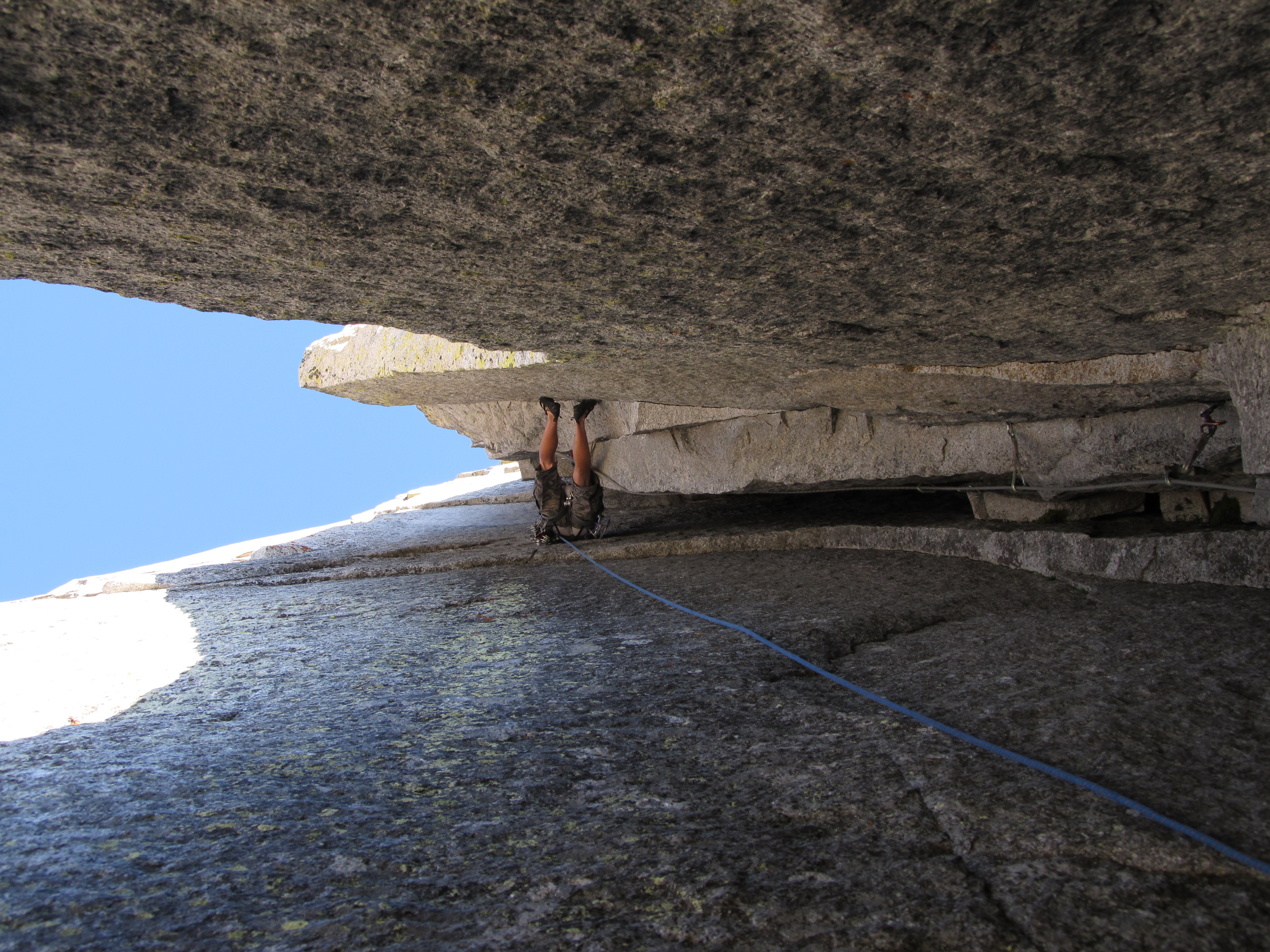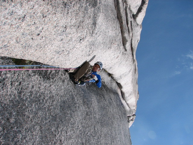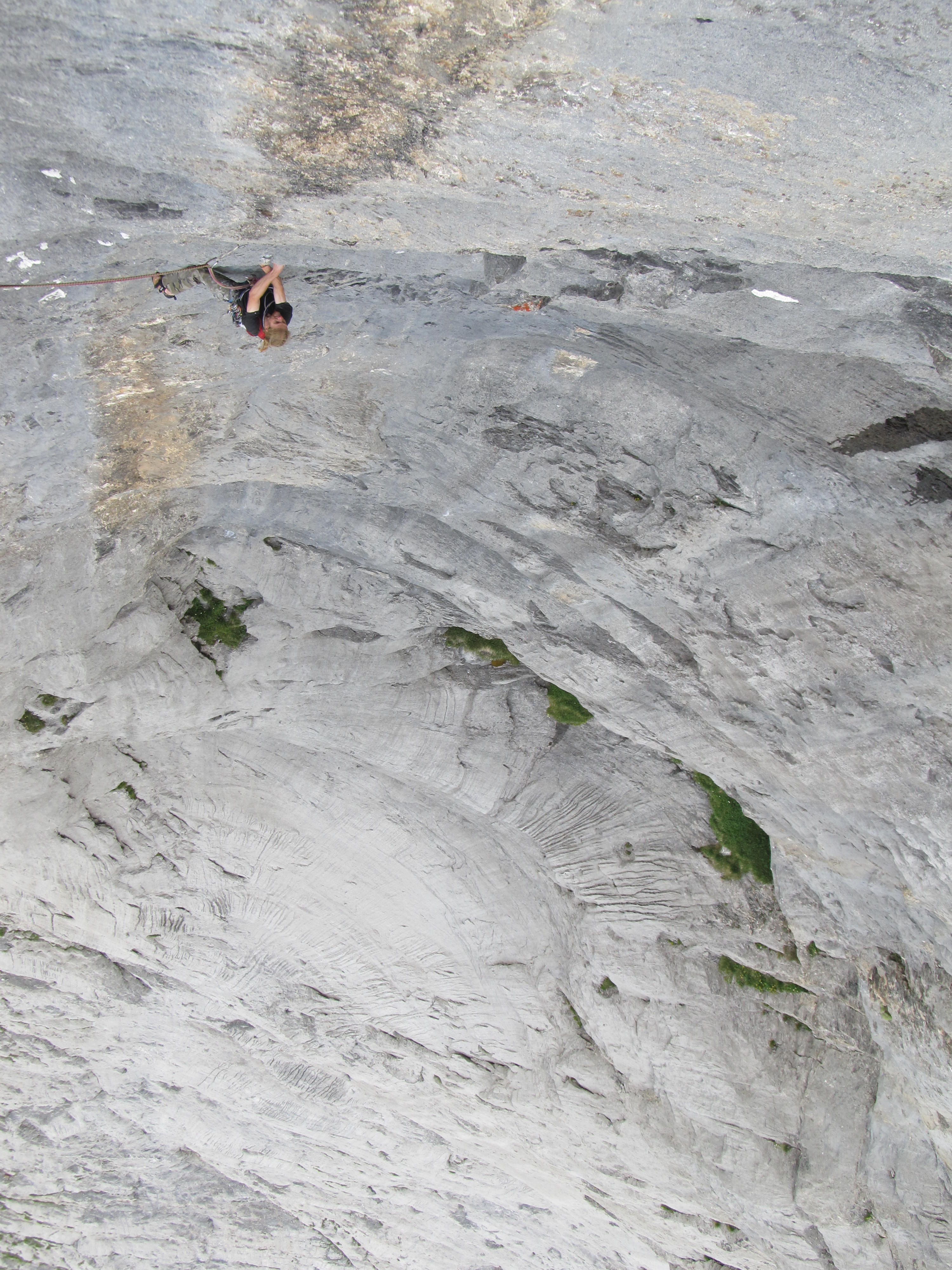 Na de twee 7b lengtes kwamen we aan een 6a+ traverseé naar links. Met losse rotsen en veel gaz onder het gat waren we blij dat na 25 meter”nastyness” deze lengte achter de rug was. Daar stonden we dan, in het midden van de wand, met nog de 2 moeilijkste 7c+ lengtes voor de boeg. Het was al laat, iets te laat eigenlijk om nog door te gaan maar ik besloot toch om nog eens te gaan voelen in de eerste 7c+. Uiteindelijk is het niet meer geworden dan voelen want we konden niet zeggen dat er van klimmen echt sprake was. Ik kwam niet verder dan de 3de haak, daar hielden de grepen op en zag ik geen doorgang meer….”Sam, wilde gij eens proberen vroeg ik nog” waarop Sam antwoorde : Nope niet te veel goesting en het is misschien beter om naar beneden te gaan. Met die wijze woorden werd de afdaling ingezet, en zo moesten we toch nog eens onze ballen groot maken om de vuile 6a+ lengte te overwinnen.