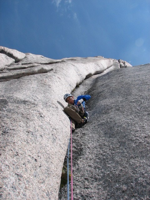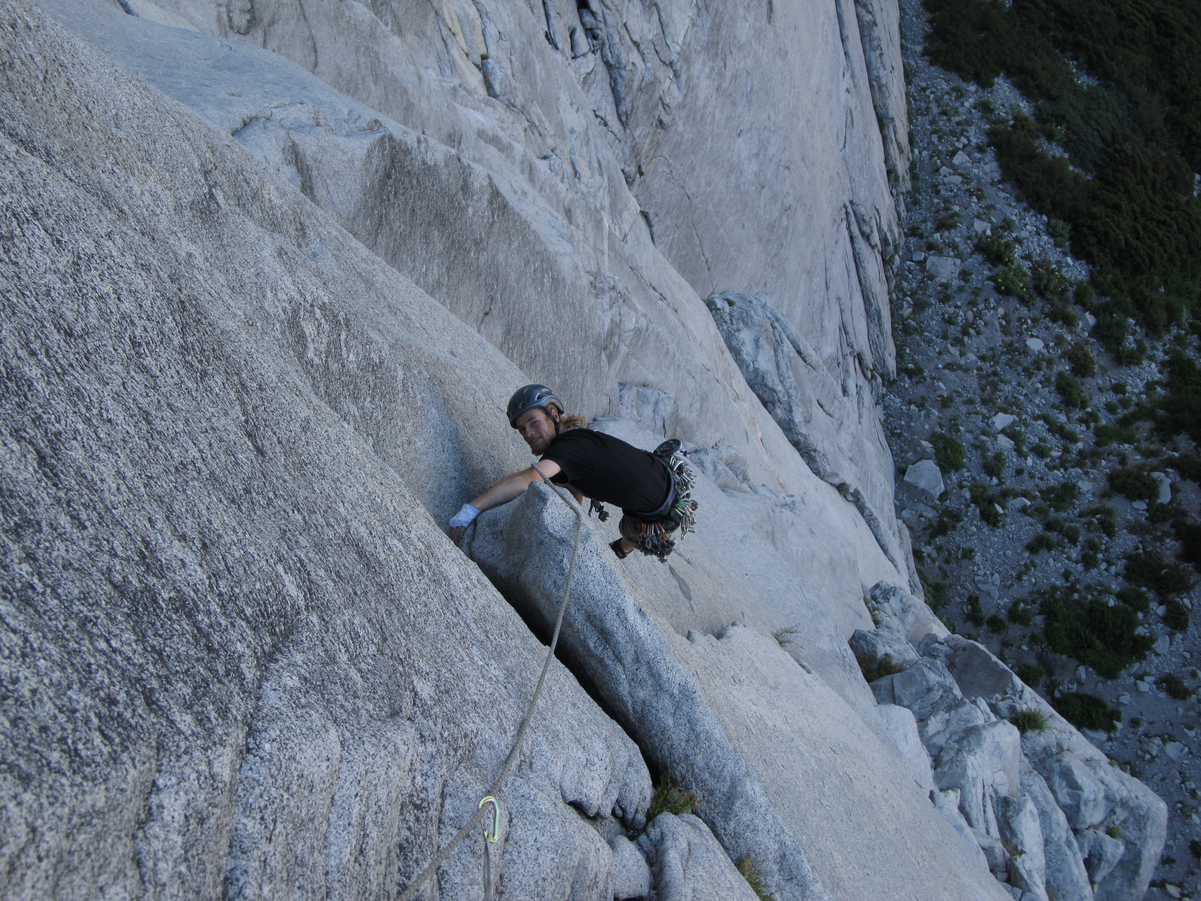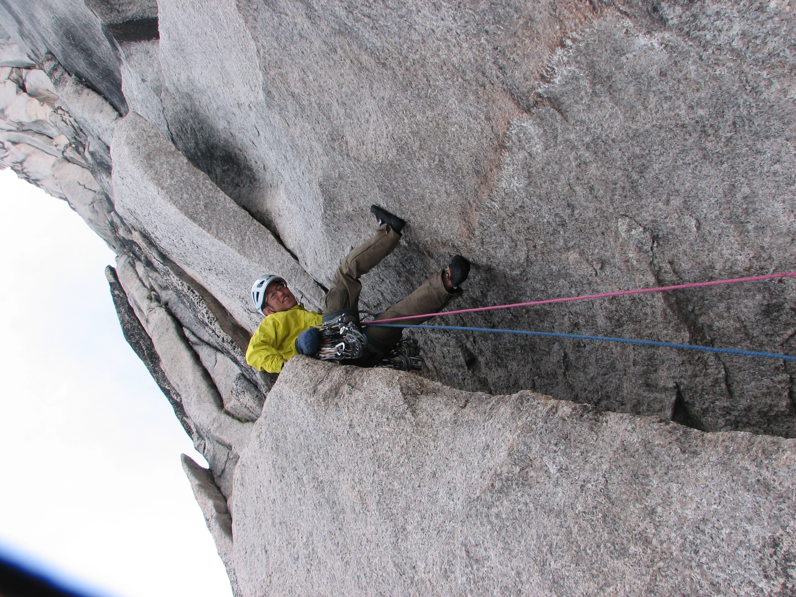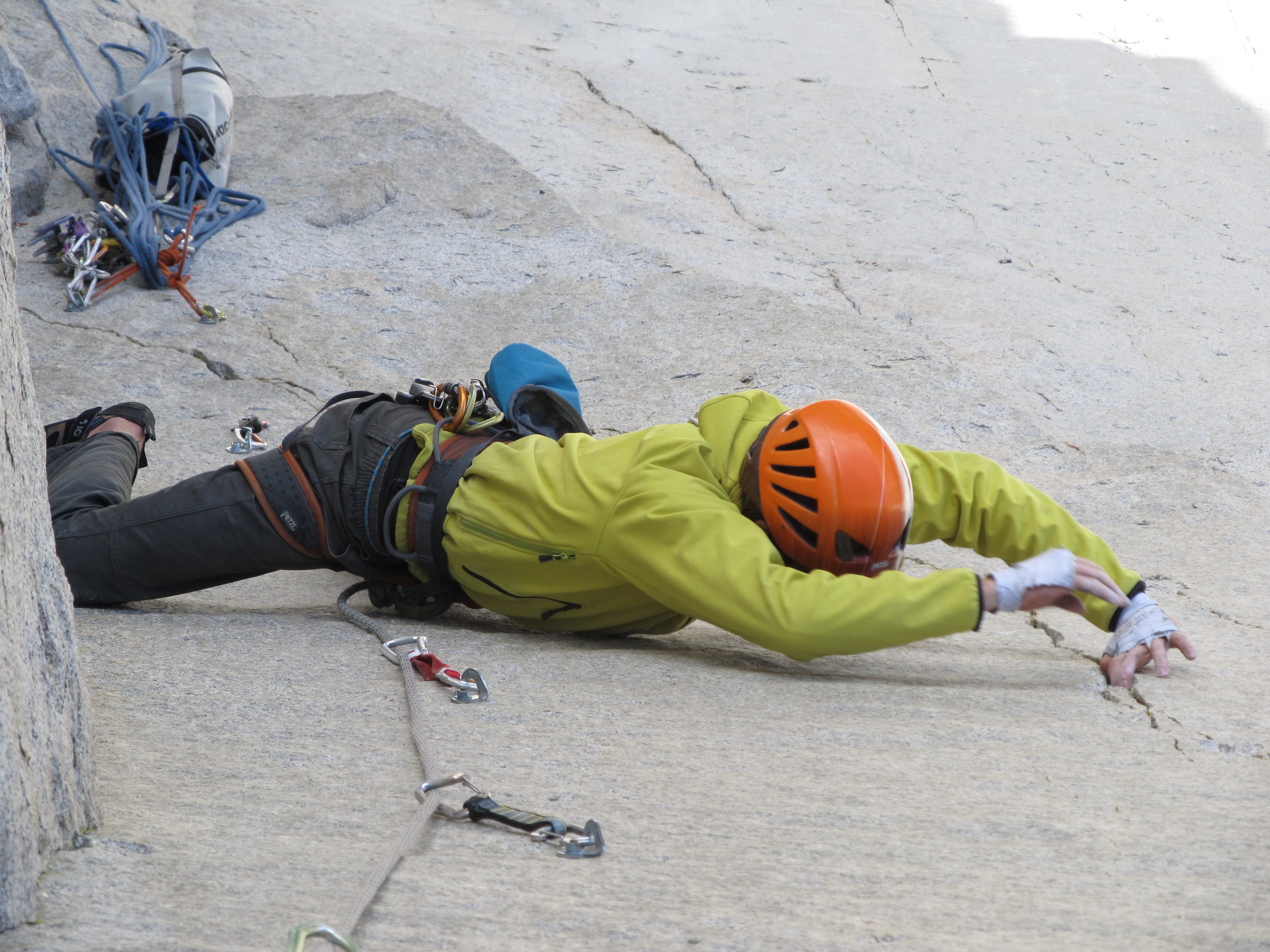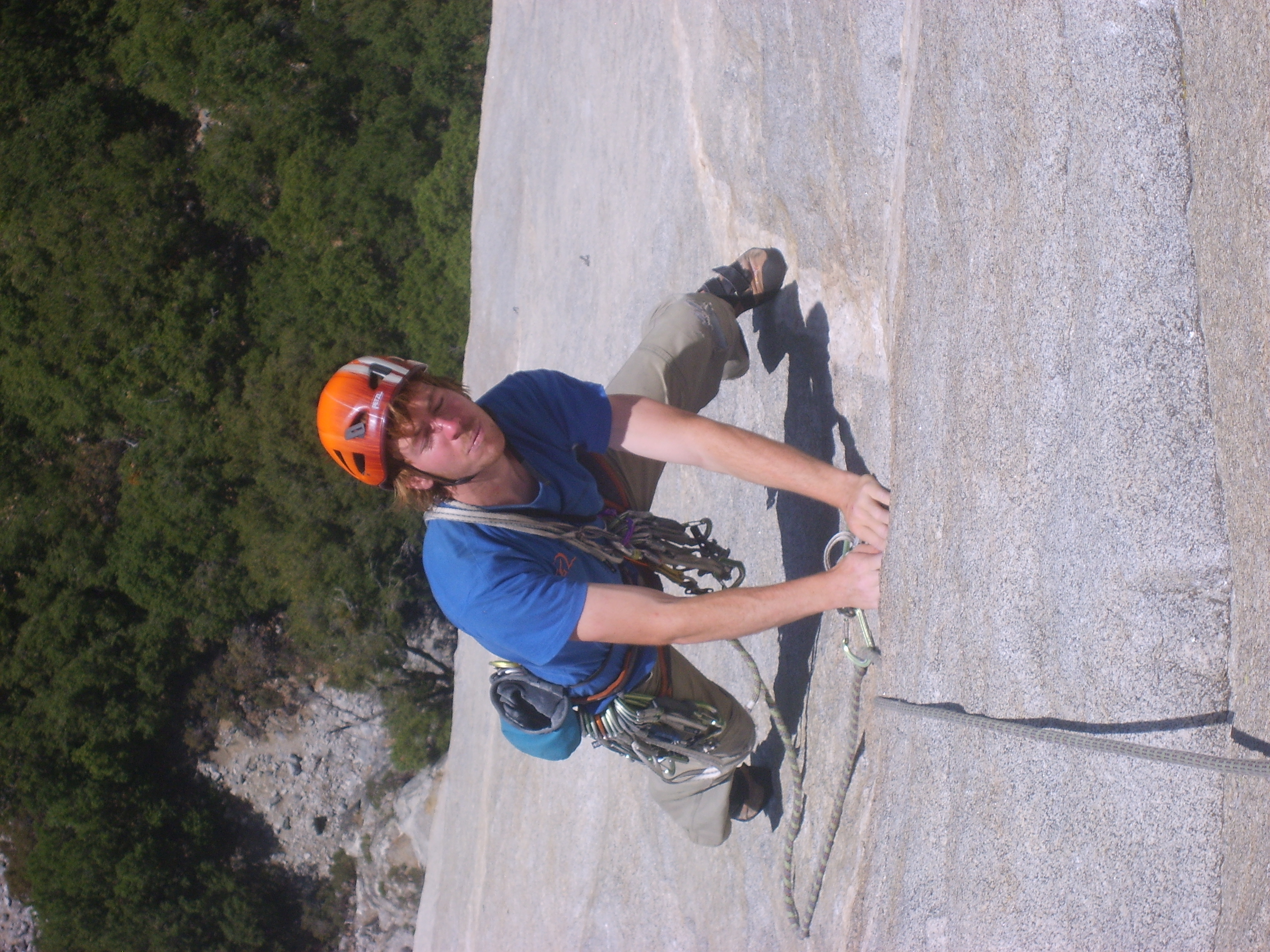 Na de twee 7b lengtes kwamen we aan een 6a+ traverseé naar links. Met losse rotsen en veel gaz onder het gat waren we blij dat na 25 meter”nastyness” deze lengte achter de rug was. Daar stonden we dan, in het midden van de wand, met nog de 2 moeilijkste 7c+ lengtes voor de boeg. Het was al laat, iets te laat eigenlijk om nog door te gaan maar ik besloot toch om nog eens te gaan voelen in de eerste 7c+. Uiteindelijk is het niet meer geworden dan voelen want we konden niet zeggen dat er van klimmen echt sprake was. Ik kwam niet verder dan de 3de haak, daar hielden de grepen op en zag ik geen doorgang meer….”Sam, wilde gij eens proberen vroeg ik nog” waarop Sam antwoorde : Nope niet te veel goesting en het is misschien beter om naar beneden te gaan. Met die wijze woorden werd de afdaling ingezet, en zo moesten we toch nog eens onze ballen groot maken om de vuile 6a+ lengte te overwinnen.