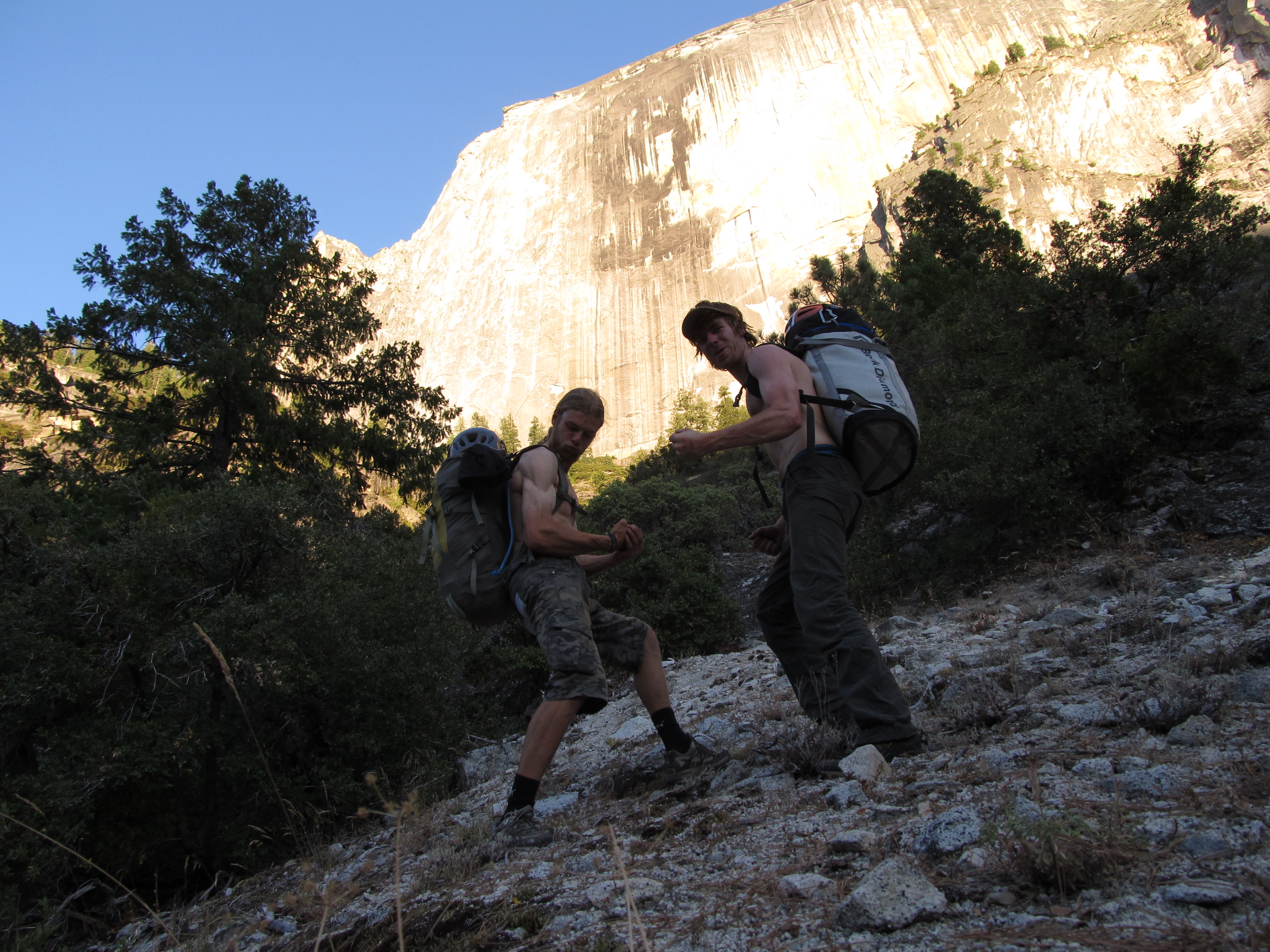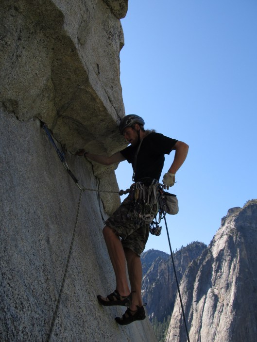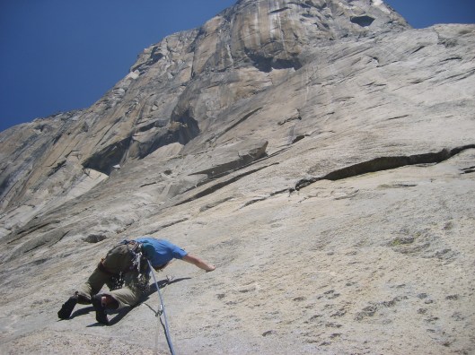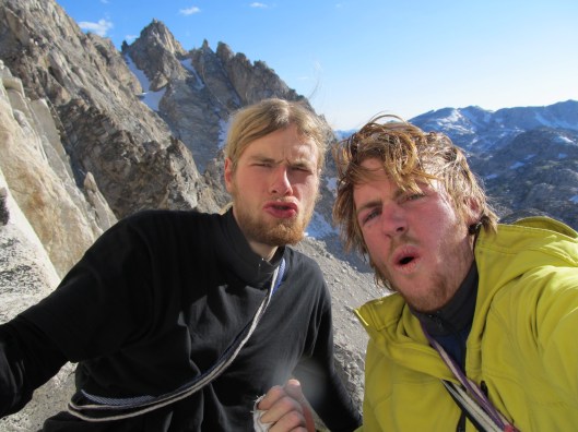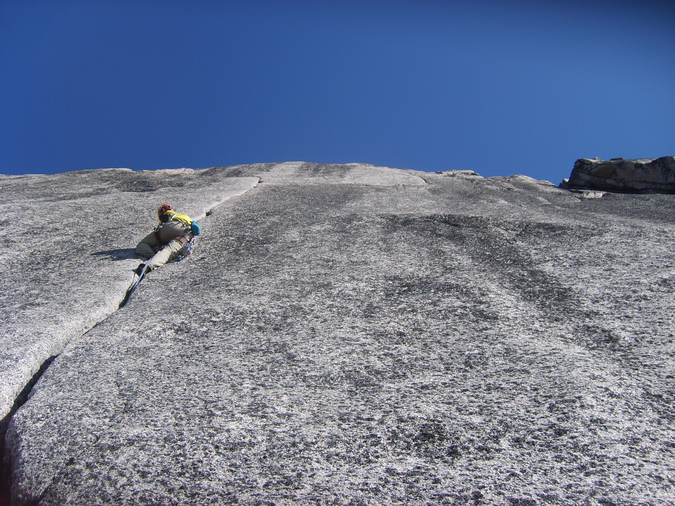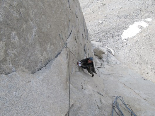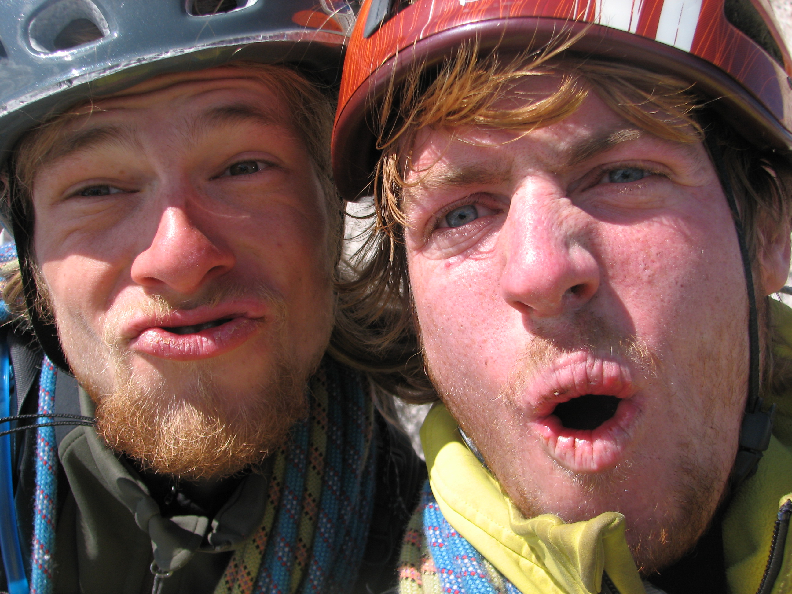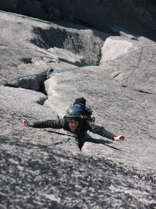 Na de twee 7b lengtes kwamen we aan een 6a+ traverseé naar links. Met losse rotsen en veel gaz onder het gat waren we blij dat na 25 meter”nastyness” deze lengte achter de rug was. Daar stonden we dan, in het midden van de wand, met nog de 2 moeilijkste 7c+ lengtes voor de boeg. Het was al laat, iets te laat eigenlijk om nog door te gaan maar ik besloot toch om nog eens te gaan voelen in de eerste 7c+. Uiteindelijk is het niet meer geworden dan voelen want we konden niet zeggen dat er van klimmen echt sprake was. Ik kwam niet verder dan de 3de haak, daar hielden de grepen op en zag ik geen doorgang meer….”Sam, wilde gij eens proberen vroeg ik nog” waarop Sam antwoorde : Nope niet te veel goesting en het is misschien beter om naar beneden te gaan. Met die wijze woorden werd de afdaling ingezet, en zo moesten we toch nog eens onze ballen groot maken om de vuile 6a+ lengte te overwinnen.