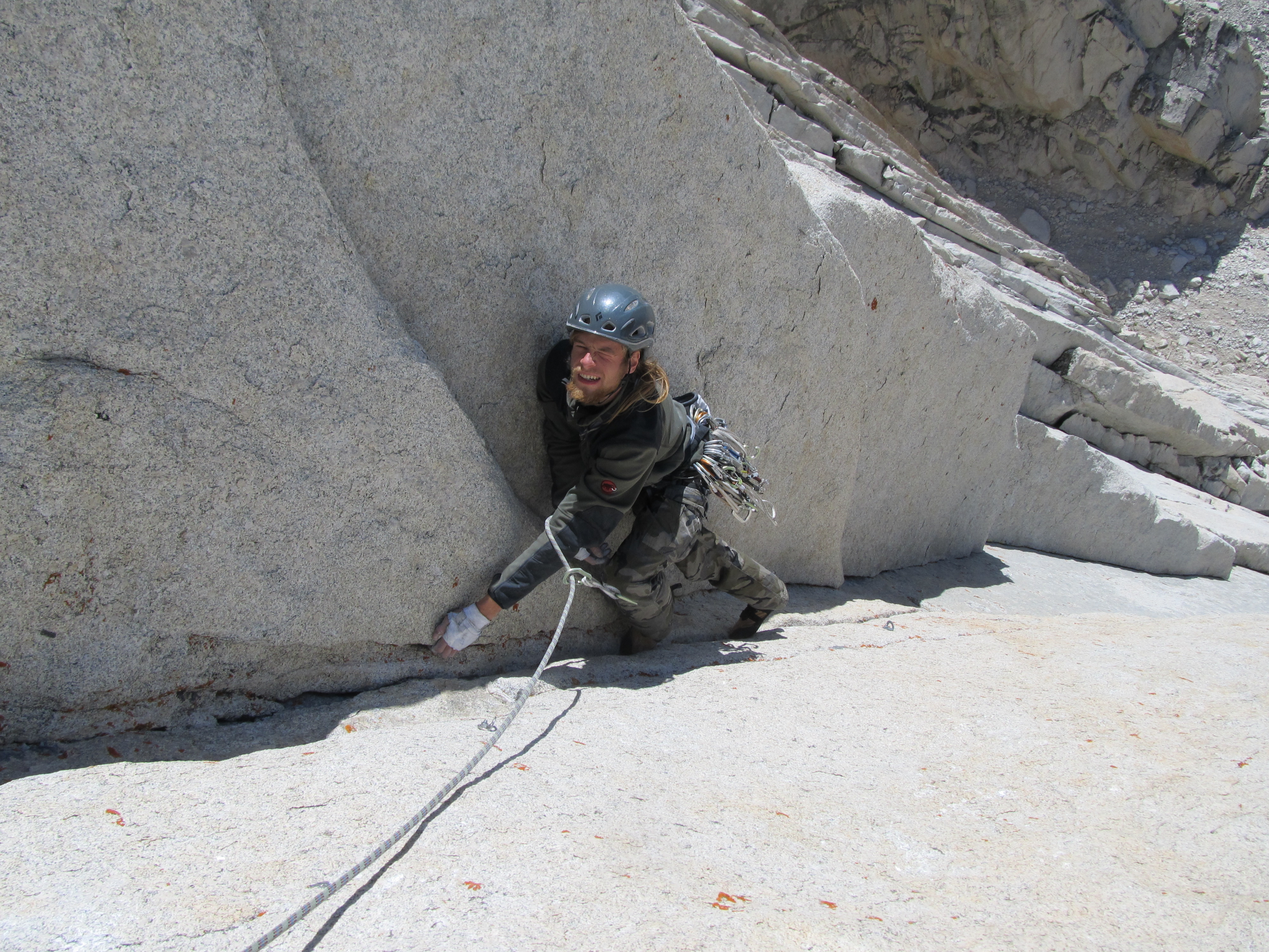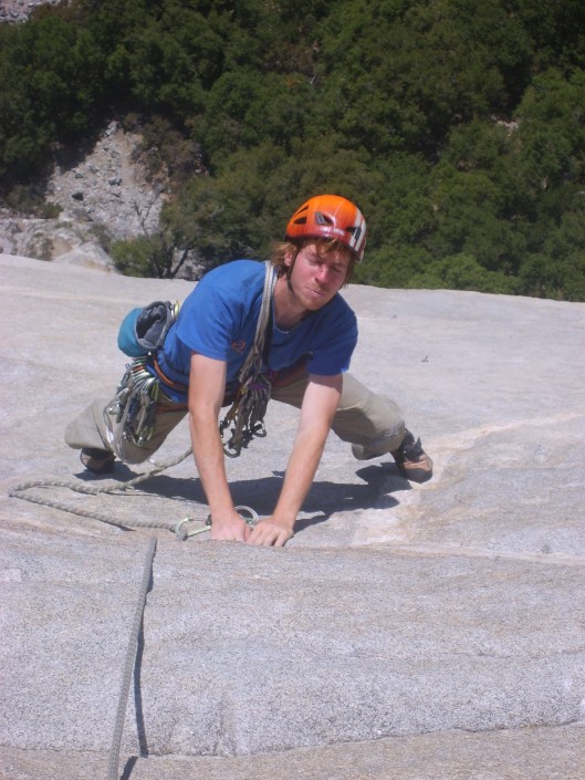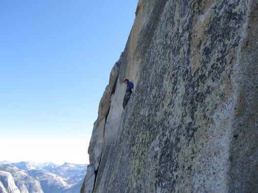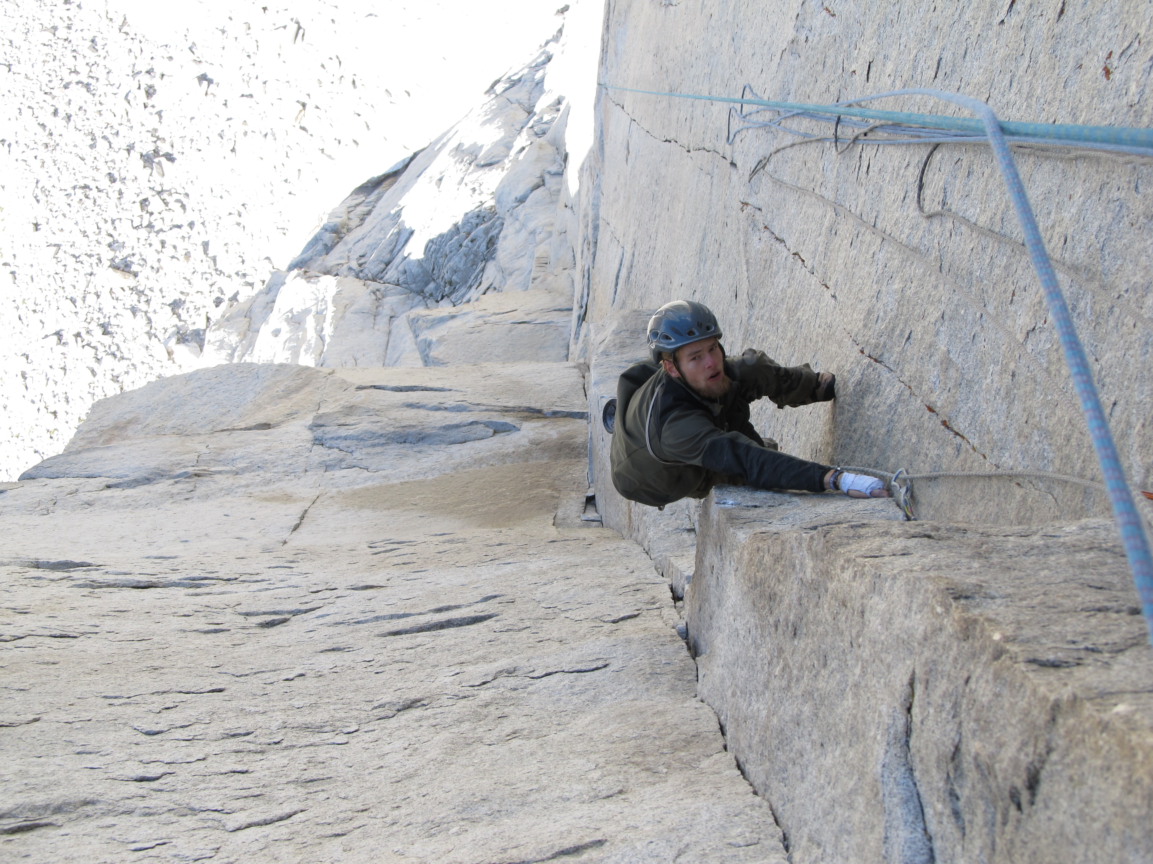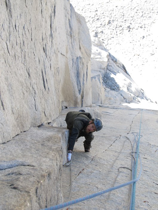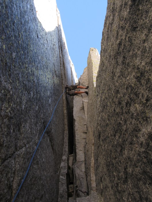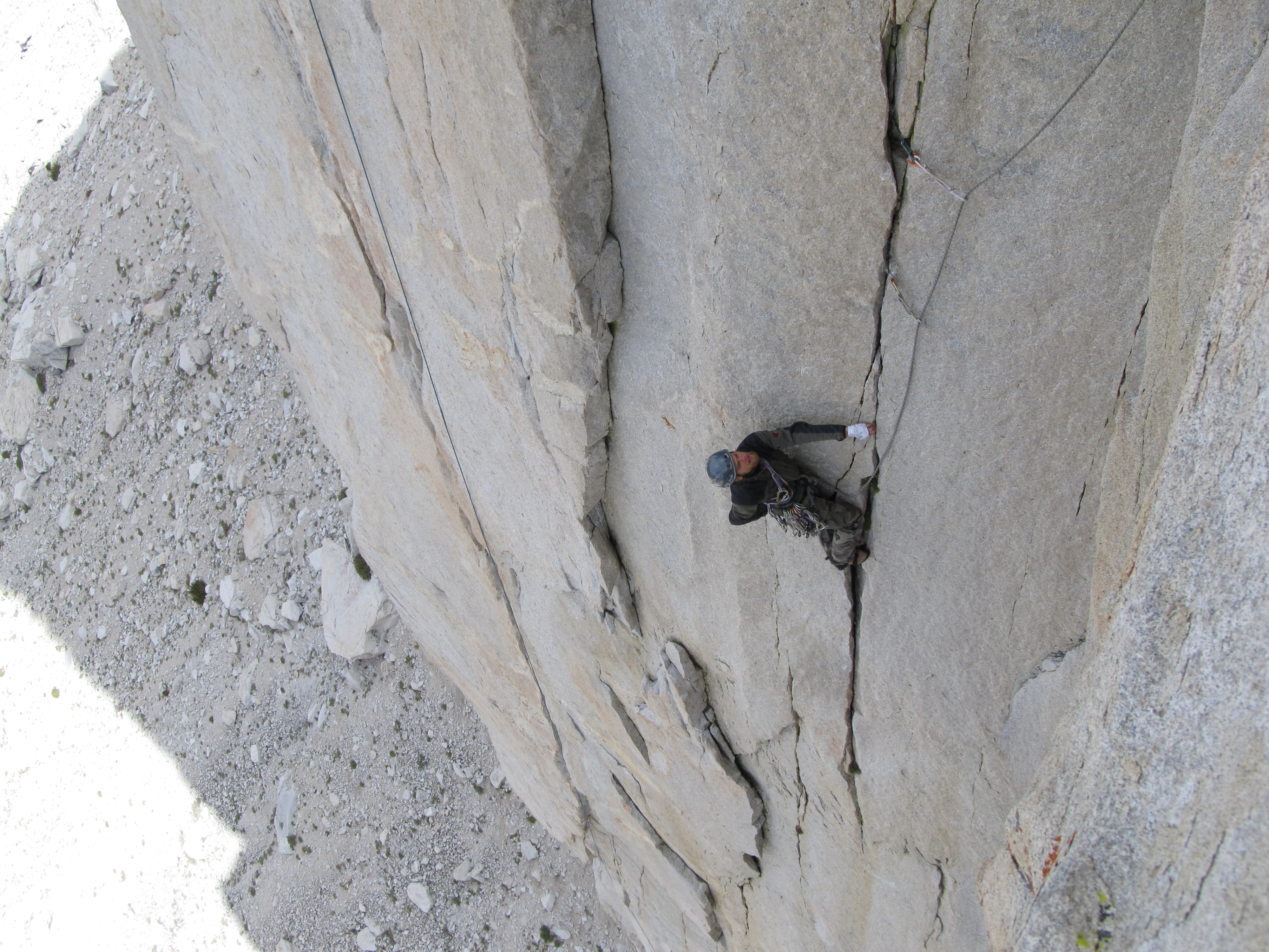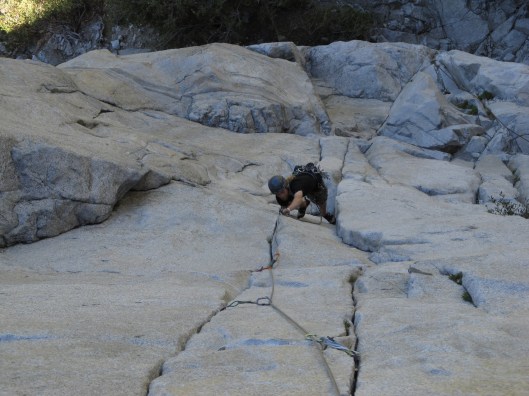Na de twee 7b lengtes kwamen we aan een 6a+ traverseé naar links. Met losse rotsen en veel gaz onder het gat waren we blij dat na 25 meter”nastyness” deze lengte achter de rug was. Daar stonden we dan, in het midden van de wand, met nog de 2 moeilijkste 7c+ lengtes voor de boeg. Het was al laat, iets te laat eigenlijk om nog door te gaan maar ik besloot toch om nog eens te gaan voelen in de eerste 7c+. Uiteindelijk is het niet meer geworden dan voelen want we konden niet zeggen dat er van klimmen echt sprake was. Ik kwam niet verder dan de 3de haak, daar hielden de grepen op en zag ik geen doorgang meer….”Sam, wilde gij eens proberen vroeg ik nog” waarop Sam antwoorde : Nope niet te veel goesting en het is misschien beter om naar beneden te gaan. Met die wijze woorden werd de afdaling ingezet, en zo moesten we toch nog eens onze ballen groot maken om de vuile 6a+ lengte te overwinnen.