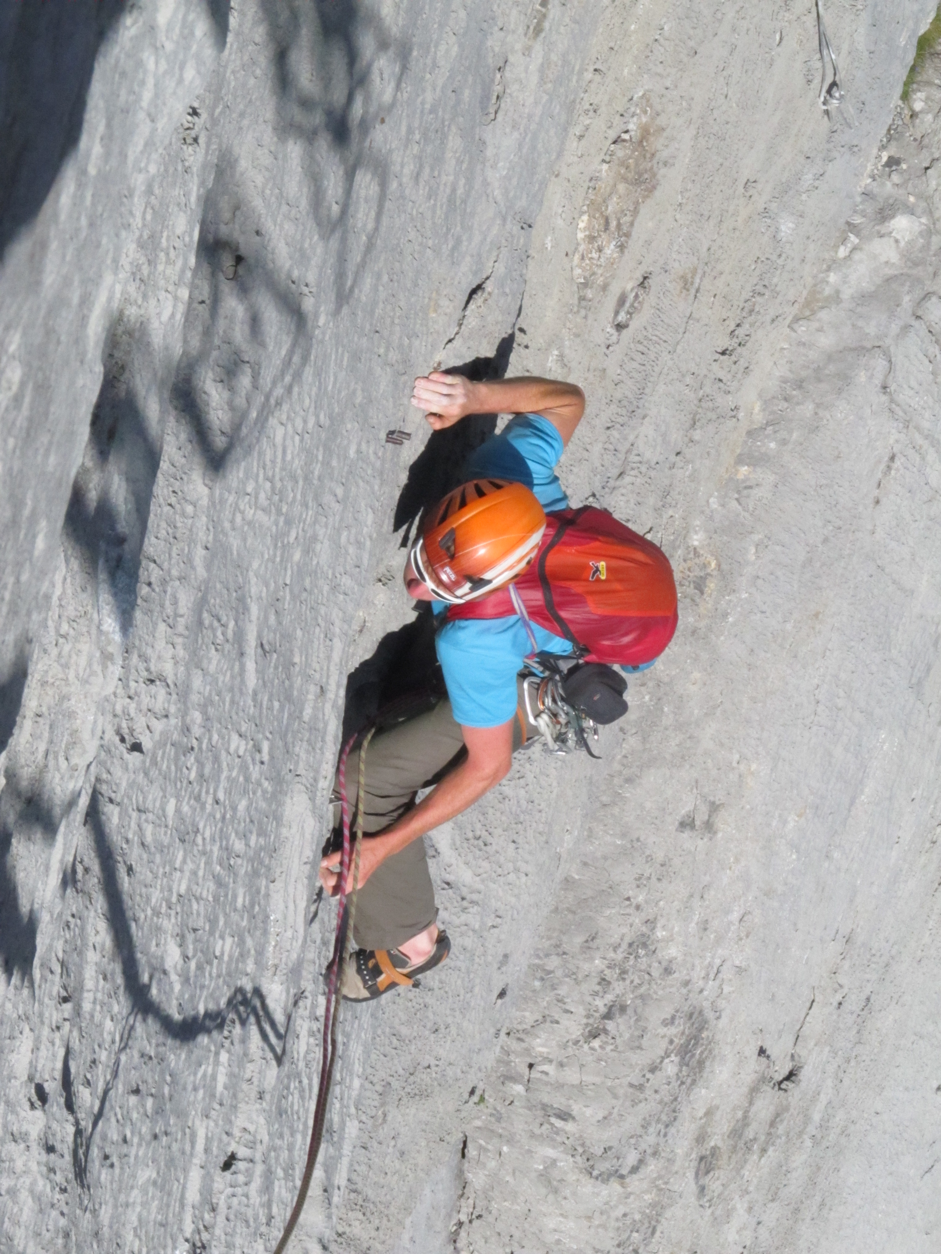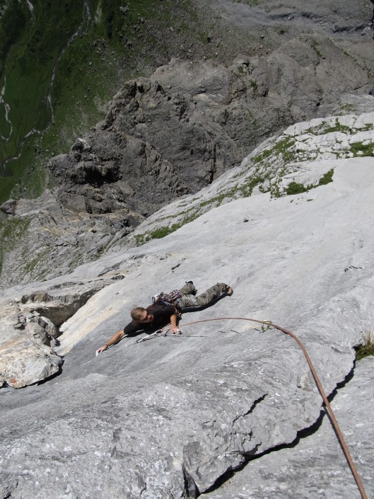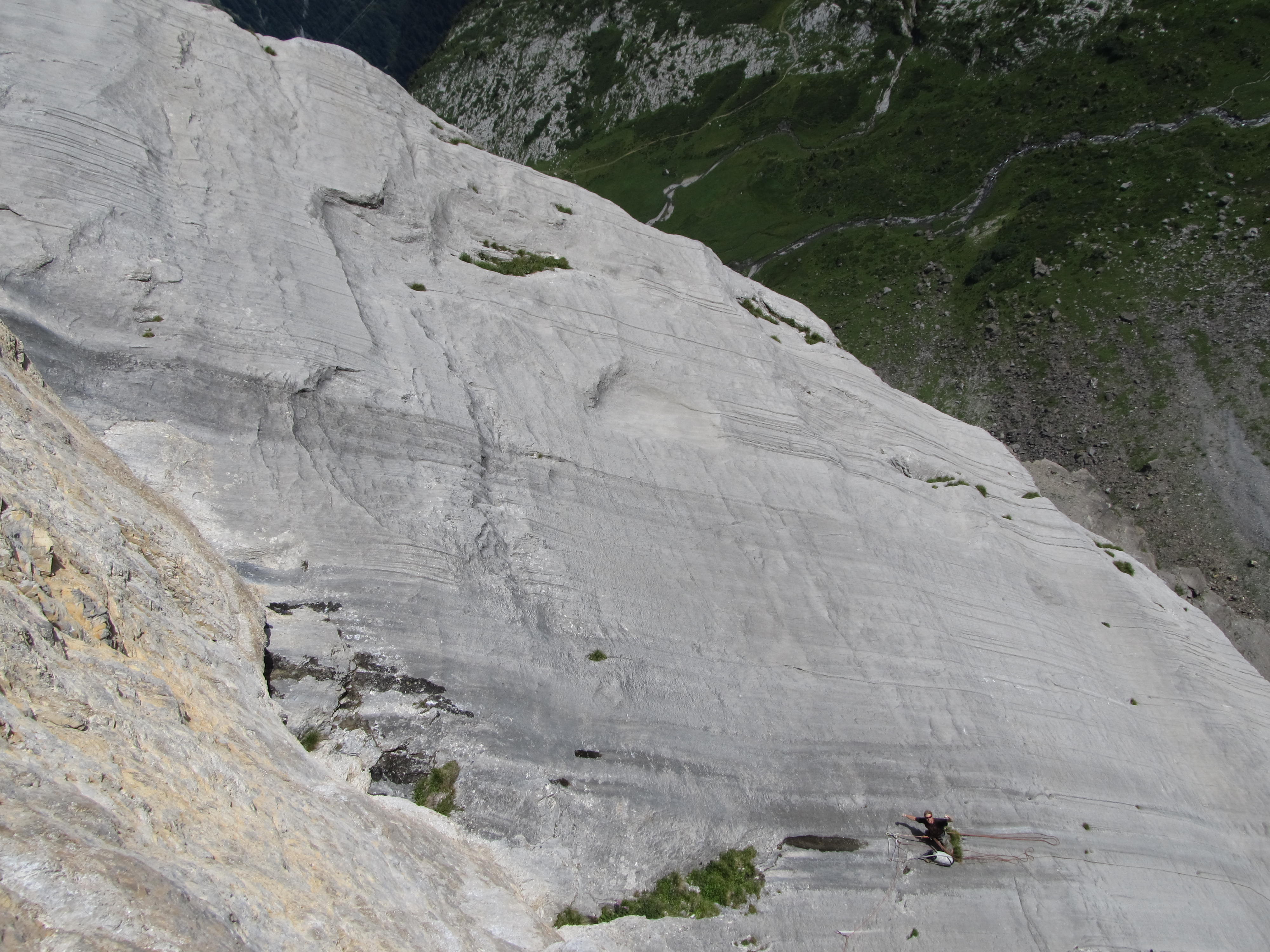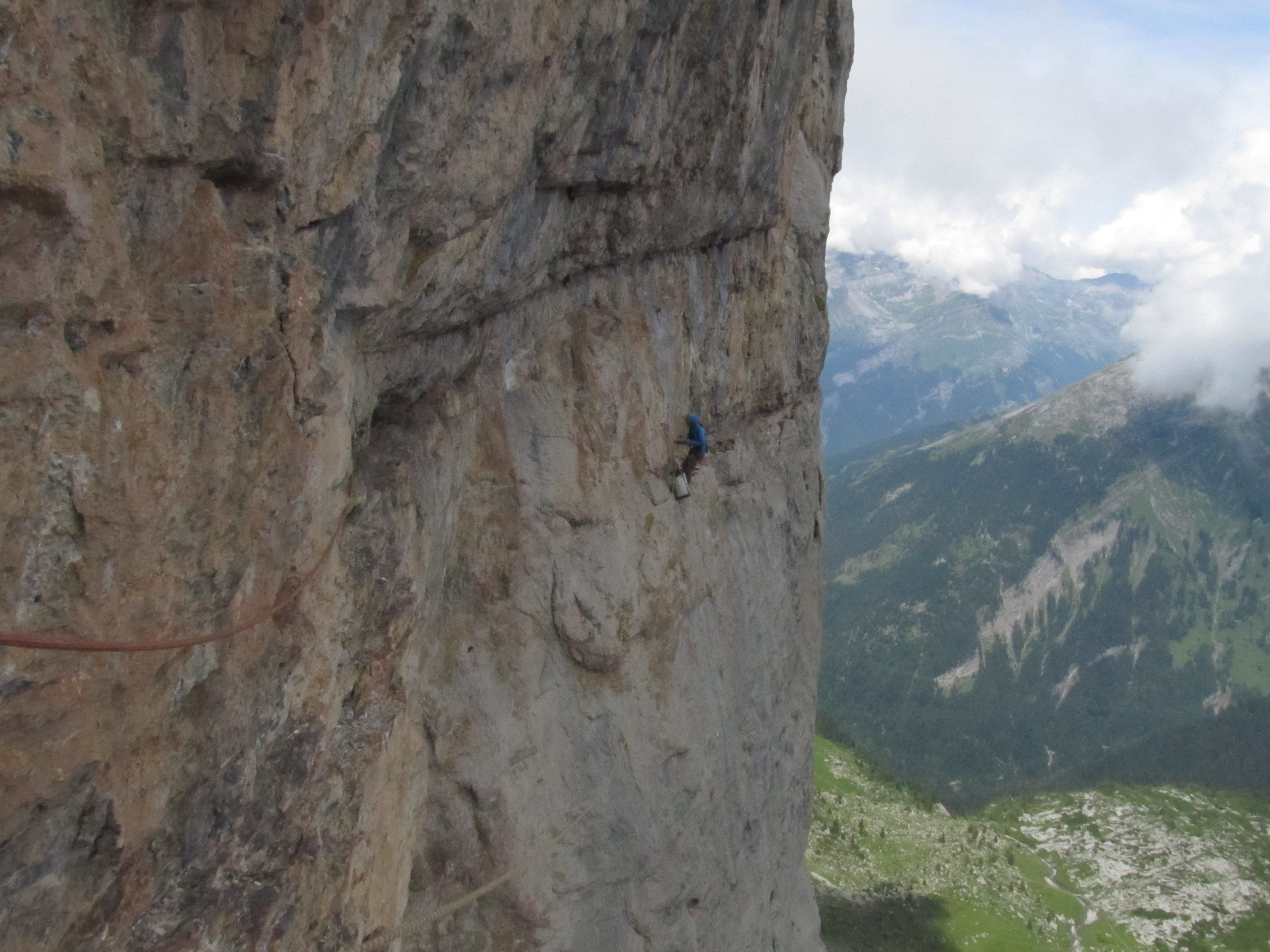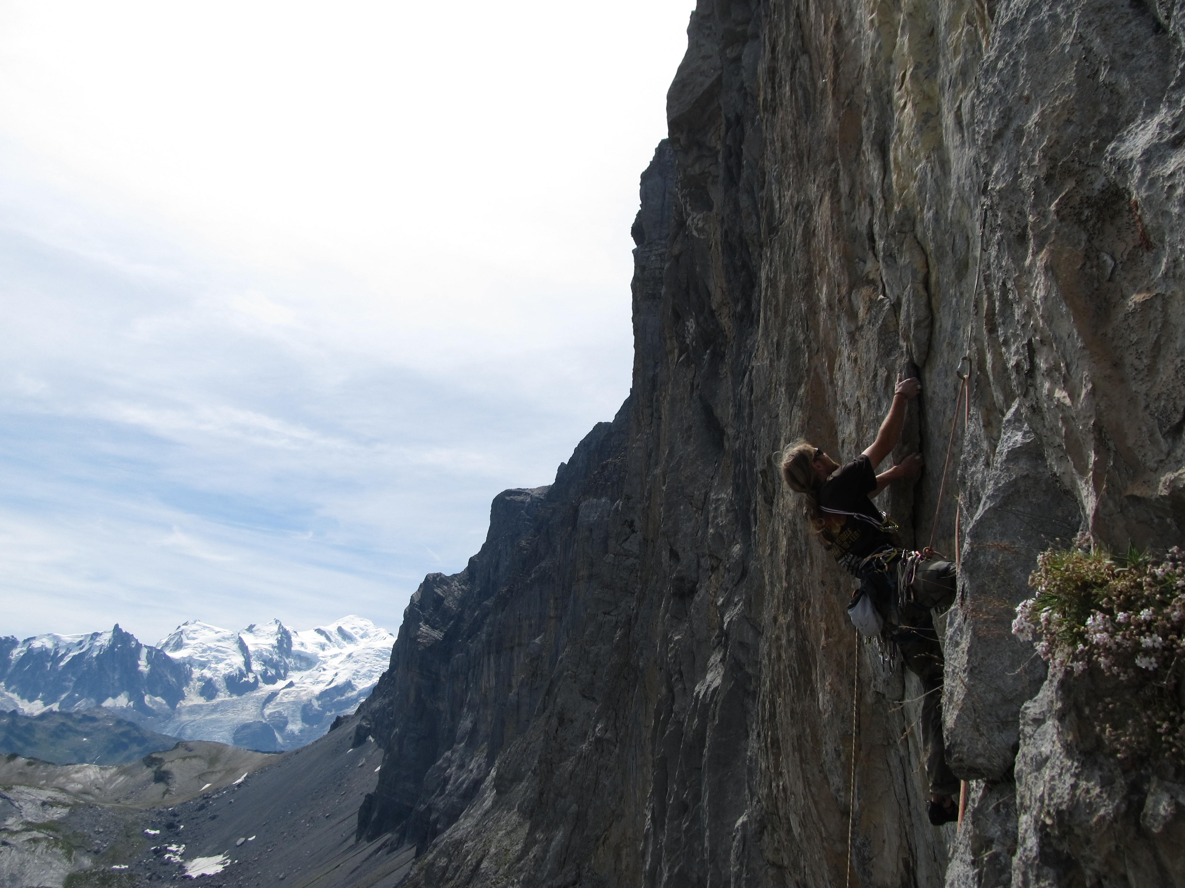 Jammergenoeg staat de wand op een sokkel van 150m losse brolrots. Na veel kreffelen en krochten stonden we er na een uur bovenop. Het was al snel duidelijk dat dit niet zomaar een gewone kalkwand is om even op te komen sportklimmen….Neen het is echt wel een serieuse onderneming en met de losse brol en de complexe approche en de mont blanc op de achtergrond, is er meer spraken van een alpiene course. Om 9.30 stonden we dan eindelijk onderaan de wand en aan de juiste route. Eerst even opgewarmd met een 6b+ en daarna was het al direct pattaten geven in de eerste 7b+. Hier vielen zowel Sam als ik op dezelfde delicate cruxpassage. Deze lengte werd gevold door een technische 7a op dal, daarna kwam nog een 6b+(brol) en 2 prachtige 7b’s.