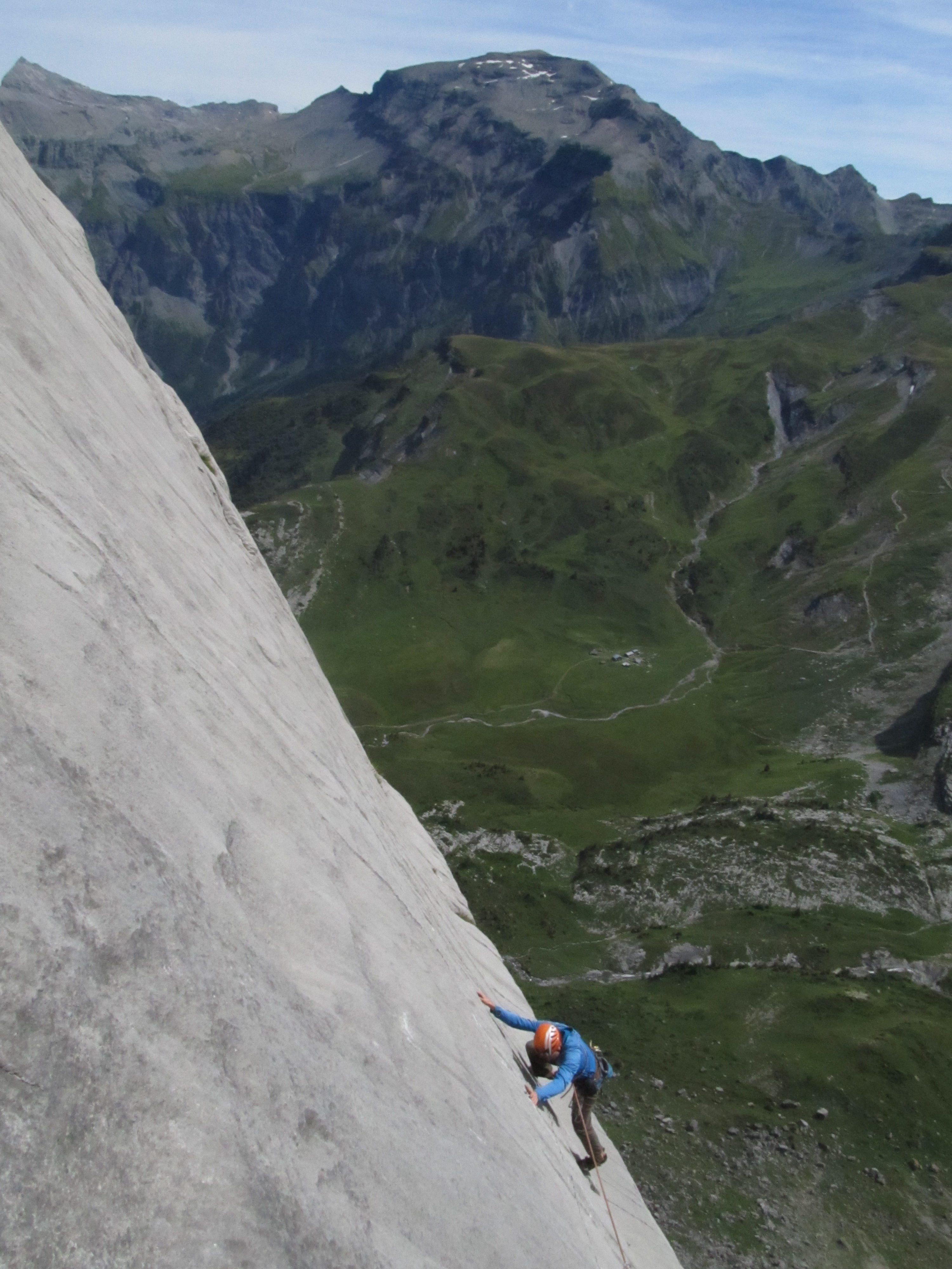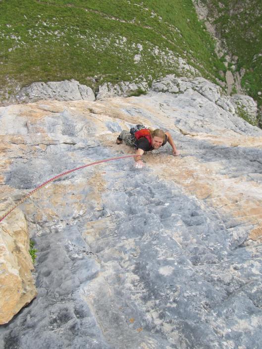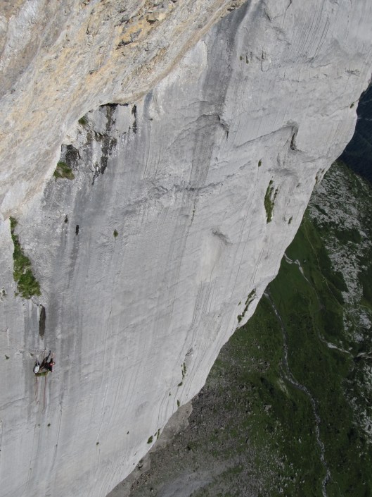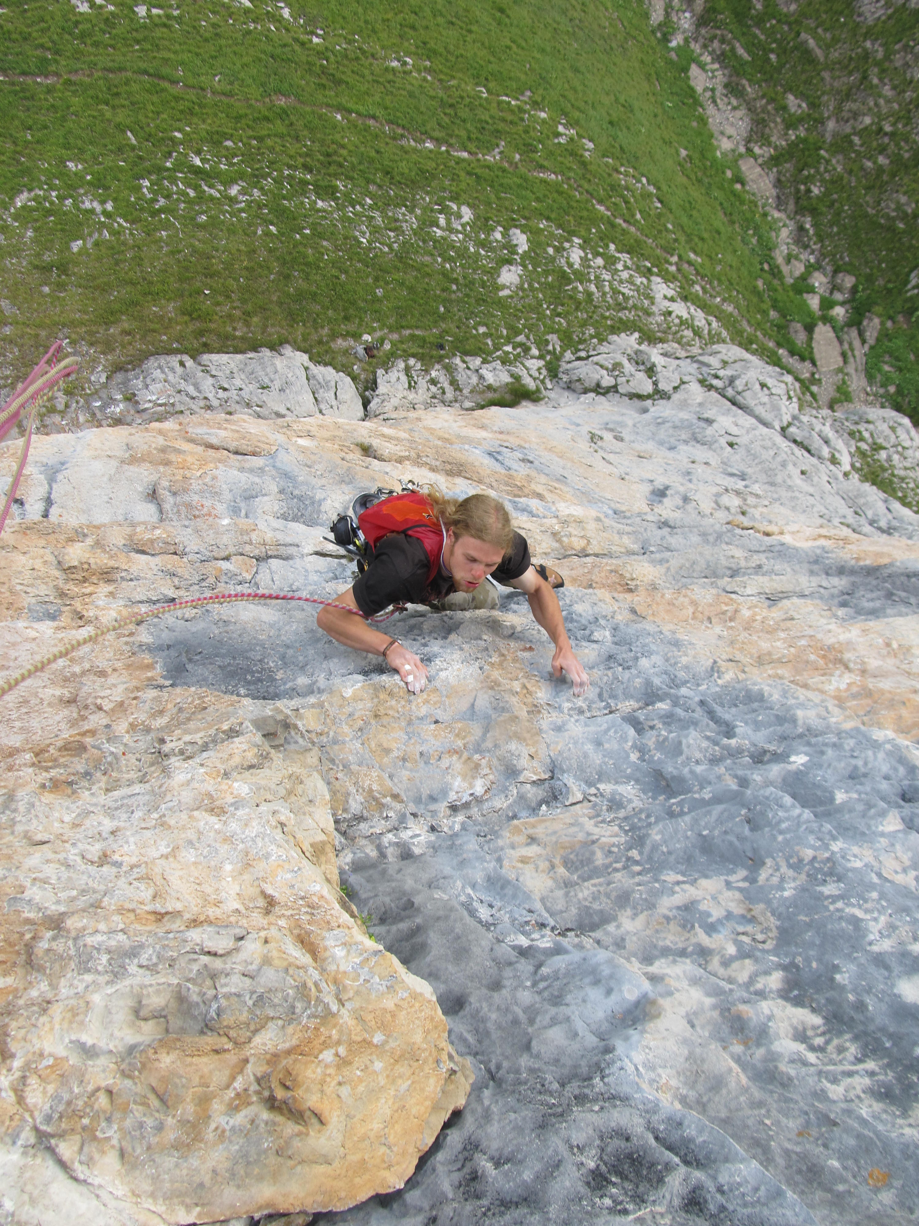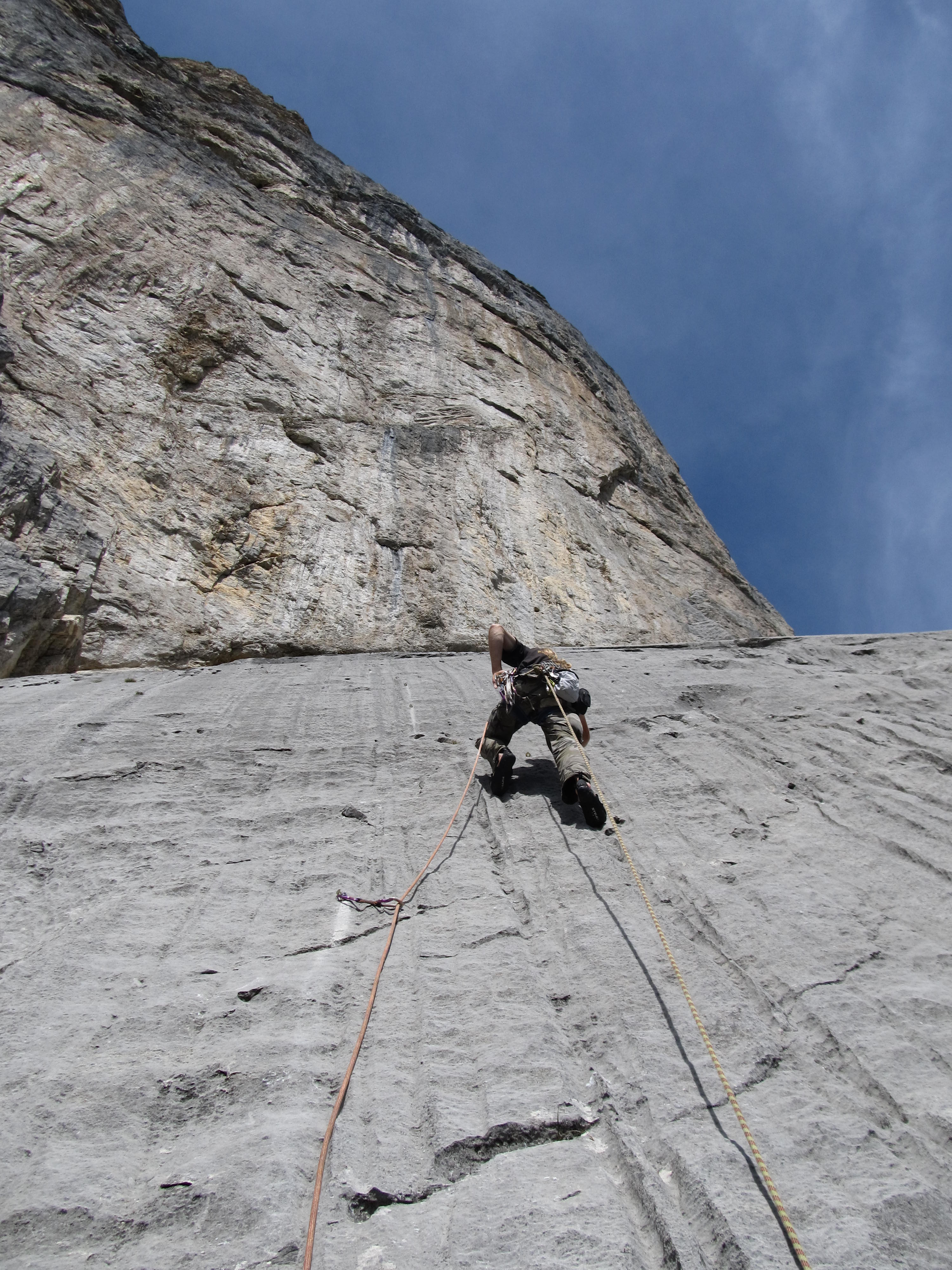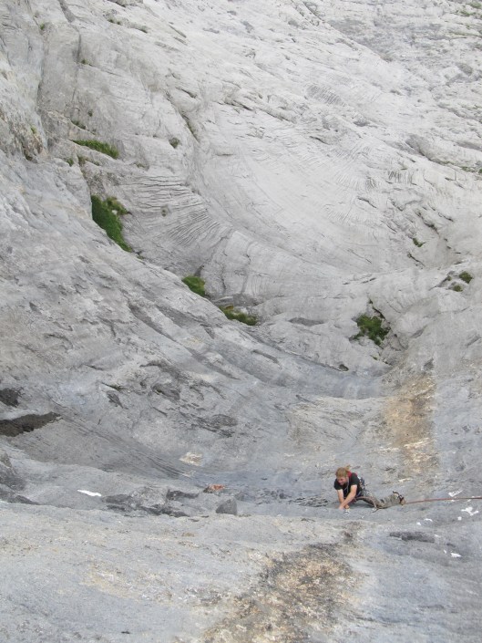 Jammergenoeg staat de wand op een sokkel van 150m losse brolrots. Na veel kreffelen en krochten stonden we er na een uur bovenop. Het was al snel duidelijk dat dit niet zomaar een gewone kalkwand is om even op te komen sportklimmen….Neen het is echt wel een serieuse onderneming en met de losse brol en de complexe approche en de mont blanc op de achtergrond, is er meer spraken van een alpiene course. Om 9.30 stonden we dan eindelijk onderaan de wand en aan de juiste route. Eerst even opgewarmd met een 6b+ en daarna was het al direct pattaten geven in de eerste 7b+. Hier vielen zowel Sam als ik op dezelfde delicate cruxpassage. Deze lengte werd gevold door een technische 7a op dal, daarna kwam nog een 6b+(brol) en 2 prachtige 7b’s.