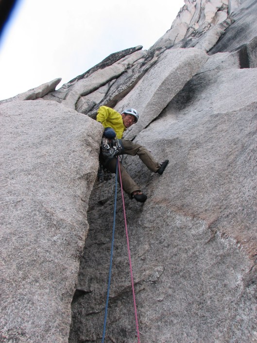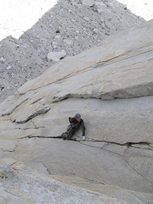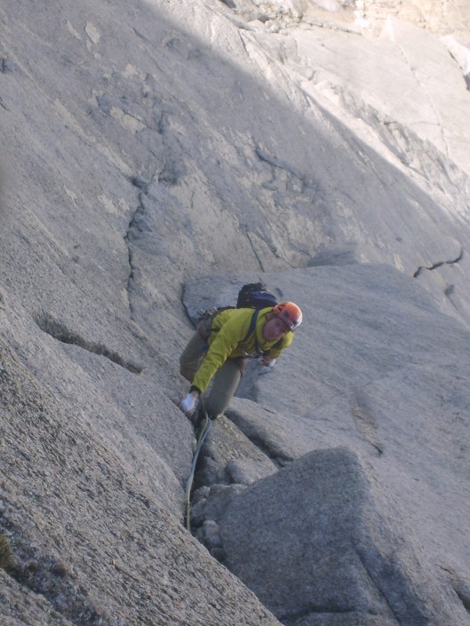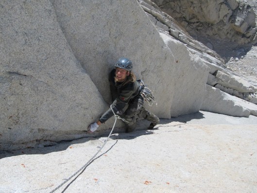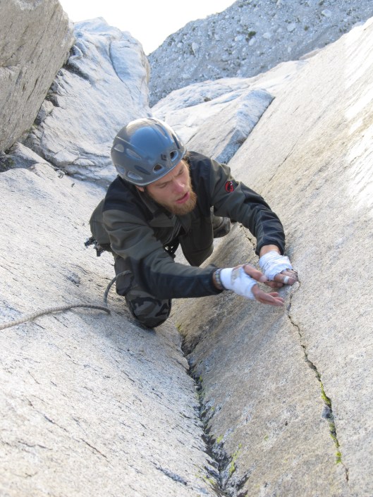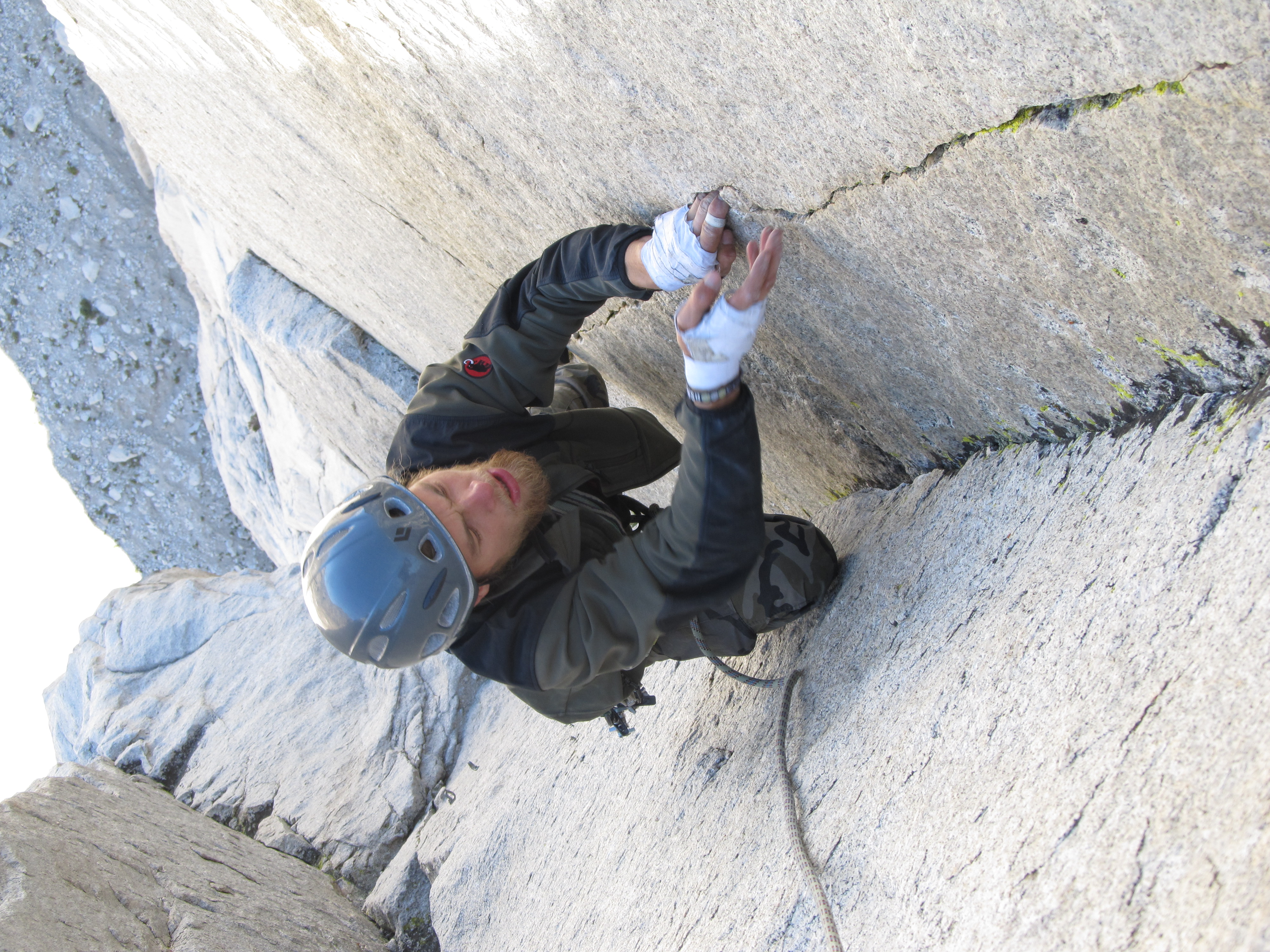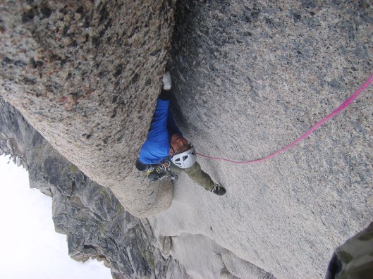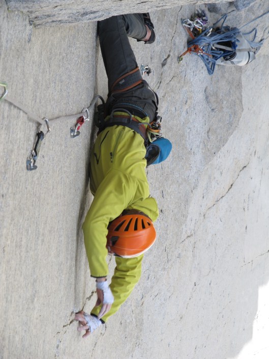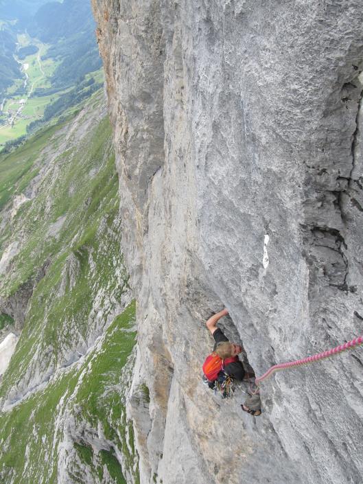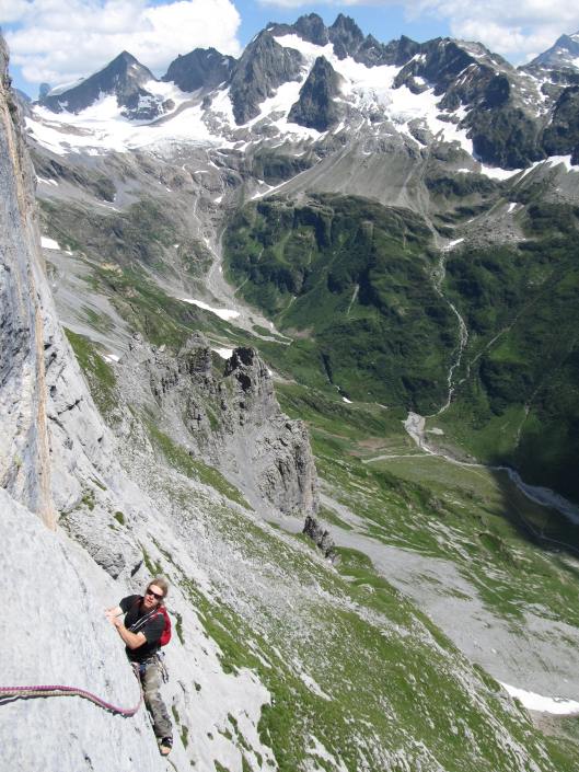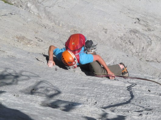 Jammergenoeg staat de wand op een sokkel van 150m losse brolrots. Na veel kreffelen en krochten stonden we er na een uur bovenop. Het was al snel duidelijk dat dit niet zomaar een gewone kalkwand is om even op te komen sportklimmen….Neen het is echt wel een serieuse onderneming en met de losse brol en de complexe approche en de mont blanc op de achtergrond, is er meer spraken van een alpiene course. Om 9.30 stonden we dan eindelijk onderaan de wand en aan de juiste route. Eerst even opgewarmd met een 6b+ en daarna was het al direct pattaten geven in de eerste 7b+. Hier vielen zowel Sam als ik op dezelfde delicate cruxpassage. Deze lengte werd gevold door een technische 7a op dal, daarna kwam nog een 6b+(brol) en 2 prachtige 7b’s.