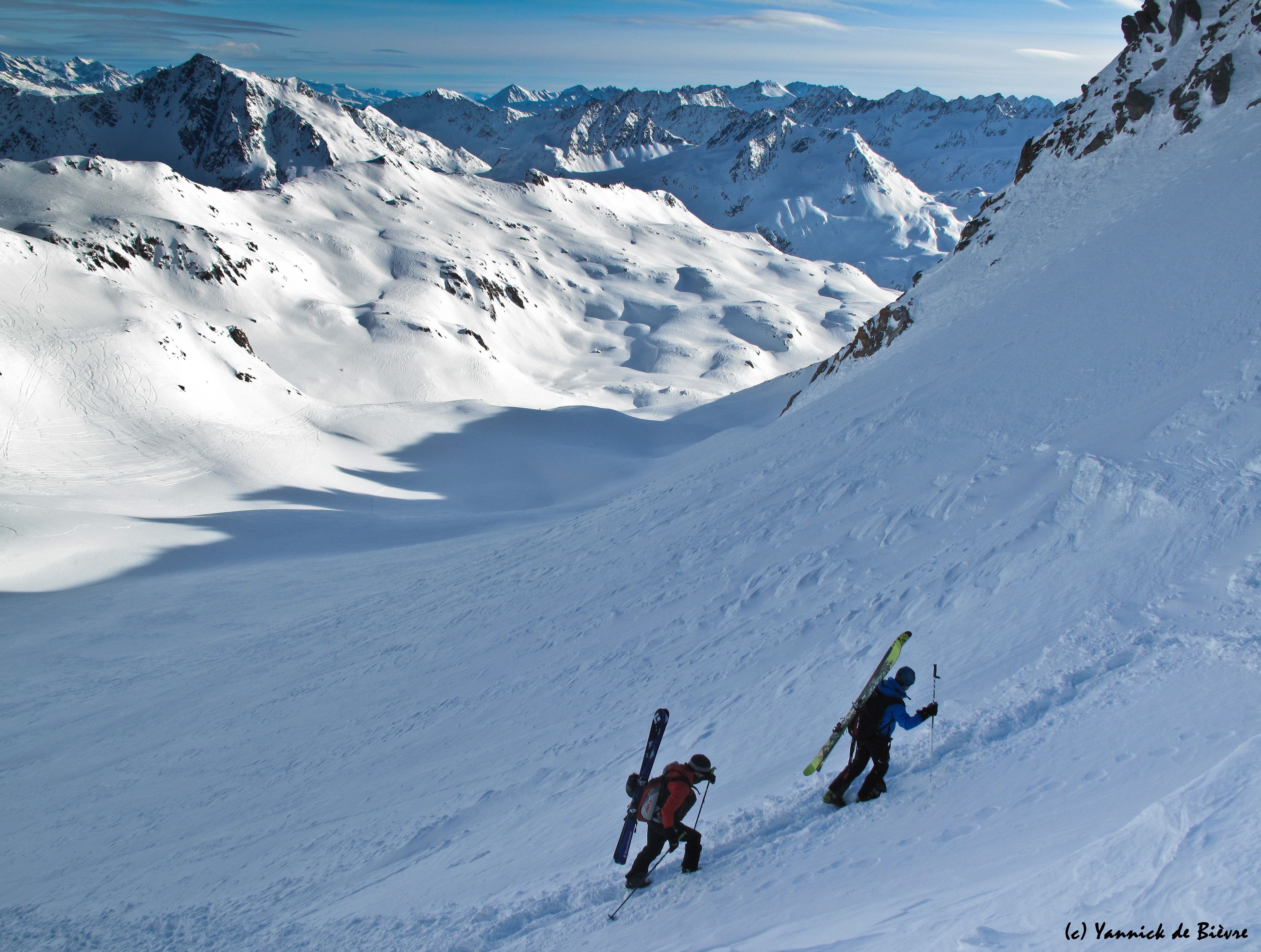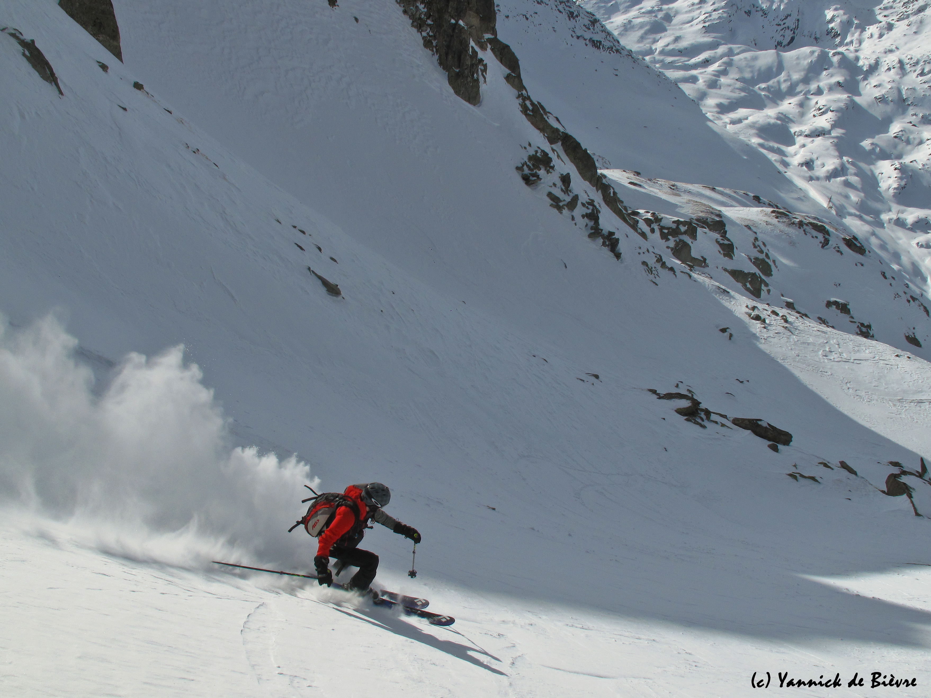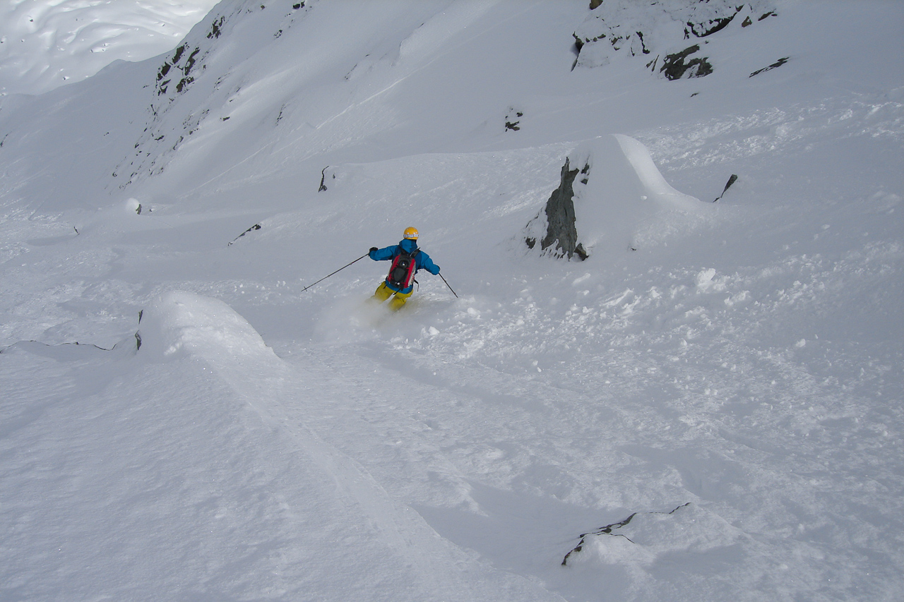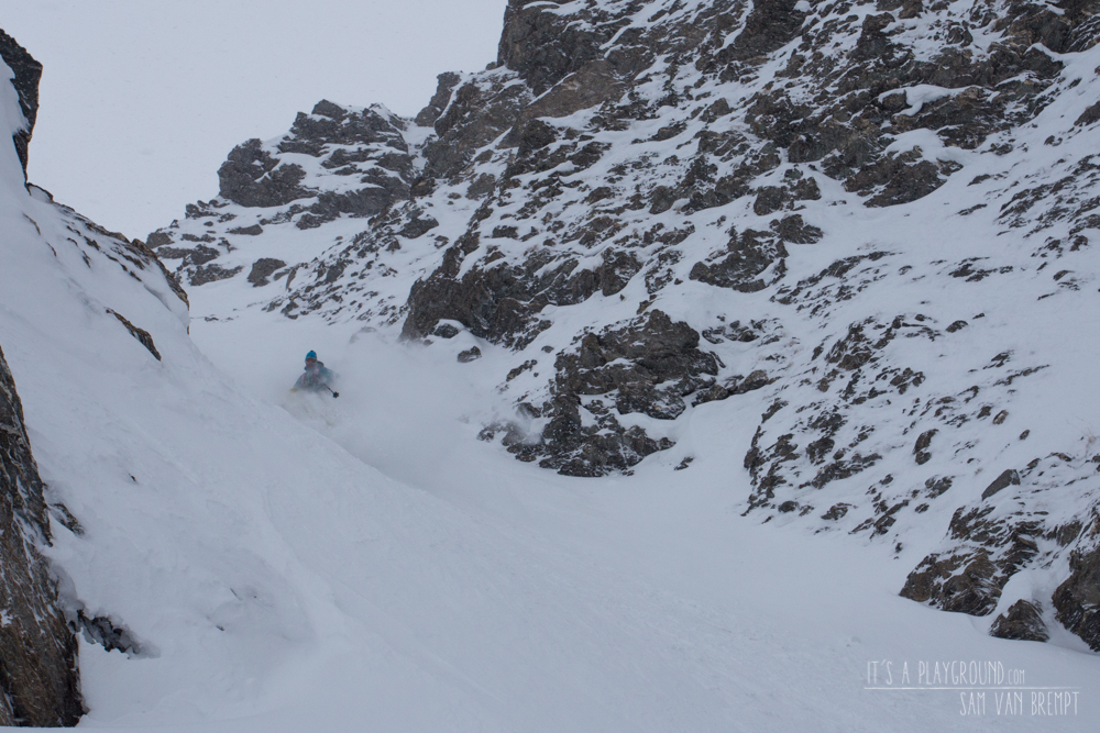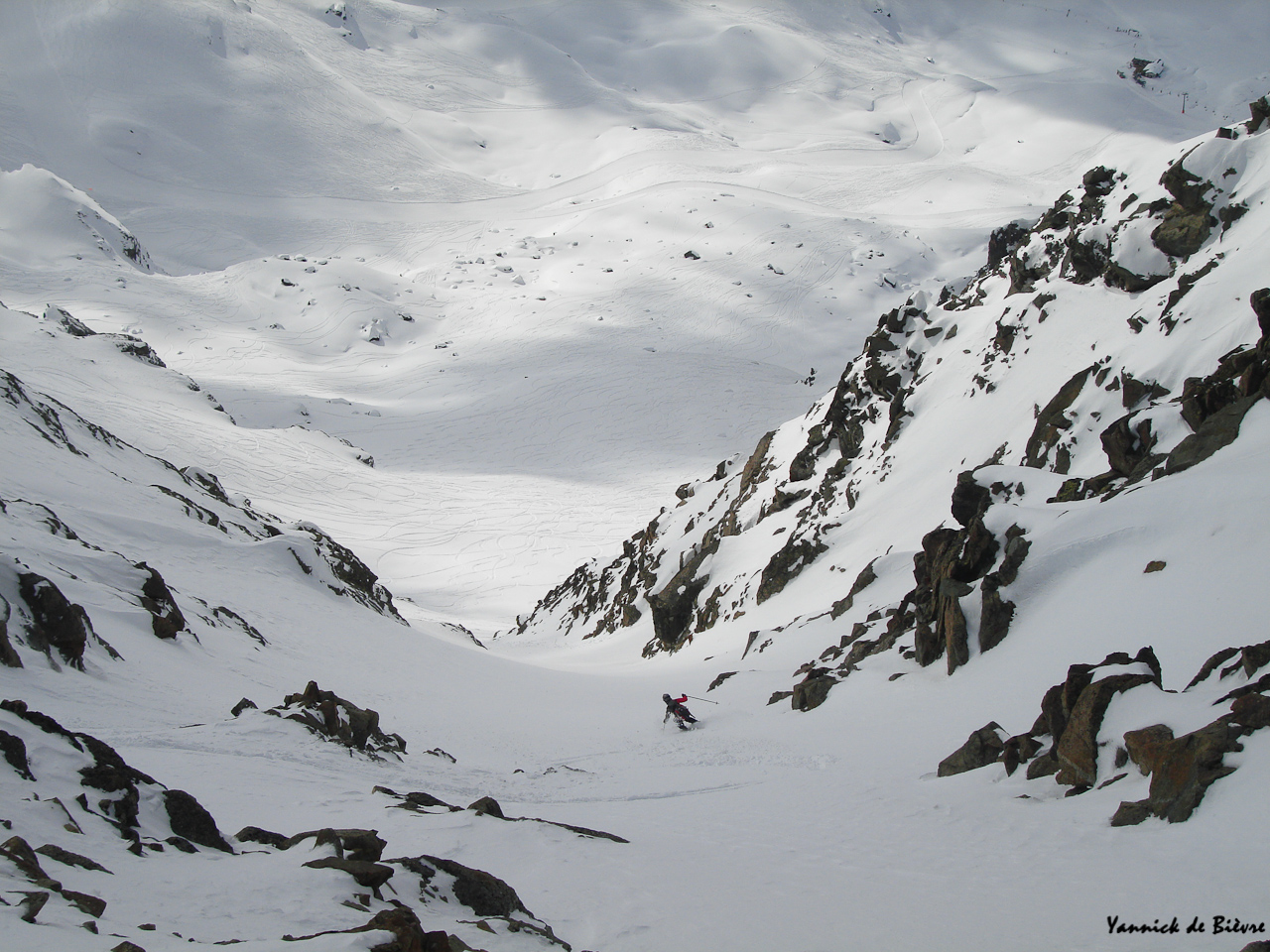 De derde keer dat ik boven kwam had Koen de plaats van partner in crime overgelaten aan Frank. Samen zagen we meer in het afdalen van nog niet eerder geskied couloir aan de westkant van de berg dan dezelfde run voor een derde keer te herhalen.