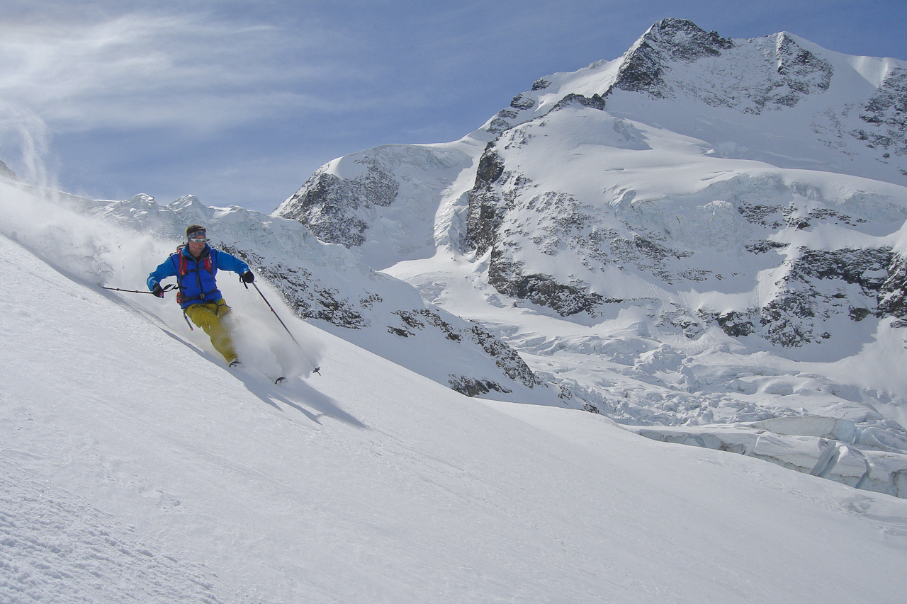 Nadat Engelberg volledig afgekrast was en onze benen op (meer dan 10.000 hoogtemeters op 1 dag…), was het tijd om via Heidiland de Engadin-vallei binnen te rijden. Reeds enkele jaren droomde ik om de Noordwand van Piz Corvatch eens af te skiën. Het feit dat Koen Van Hiel me dit enkele jaren geleden al voordeed maakte de drang er niet beter op. Lift tot op de gletsjer, een stuk ‘no-fall zone’ afskiën om op een ander gletsjer te komen en een half uurtje stappen later stonden we op de top. Er waren al enkele mensen ons voorgegaan, maar de prachtige run in diepe poeder maakte er toch een festijn van.