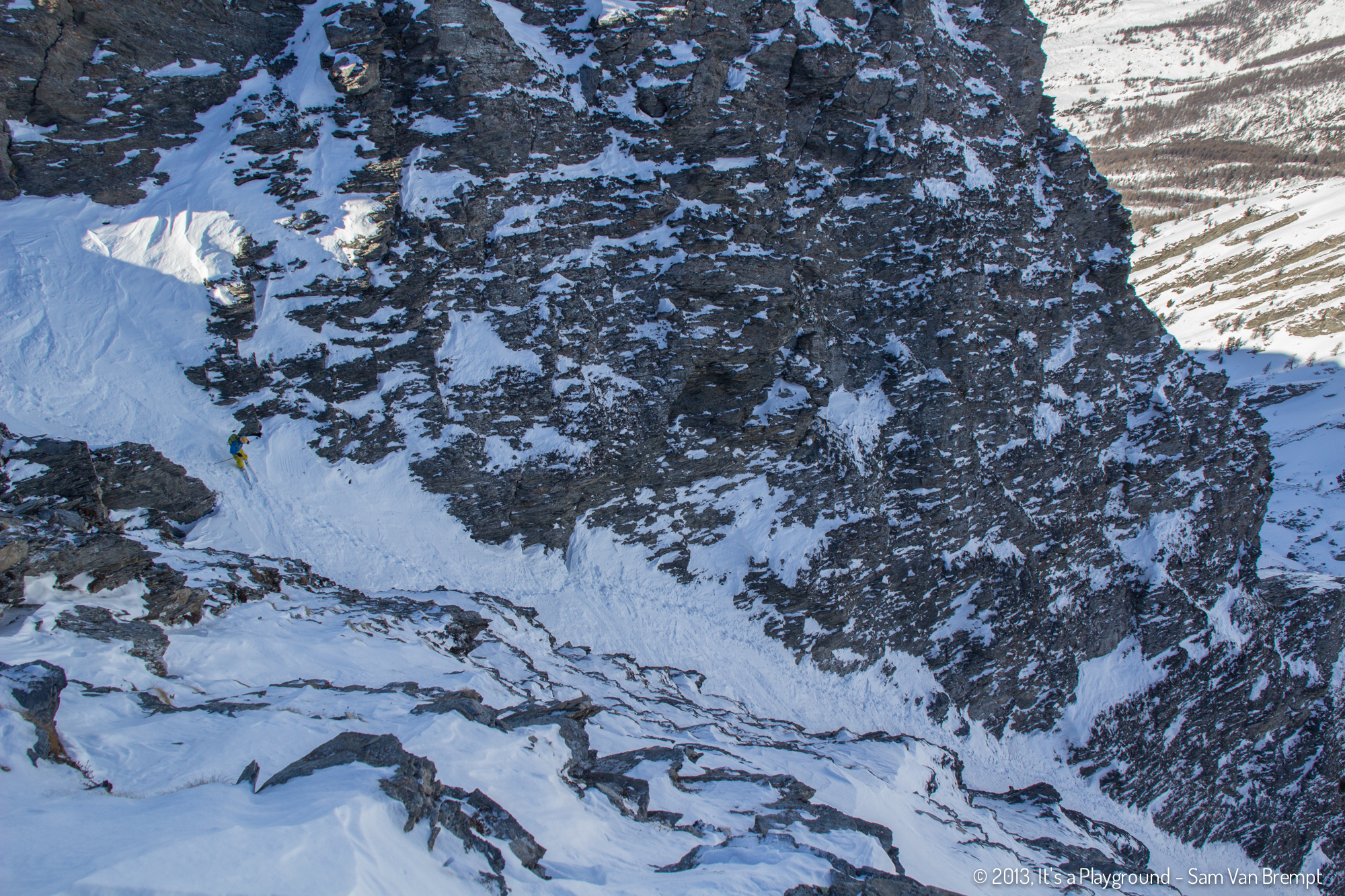 Na een heerlijke lunch op de top zonder een zuchtje wind begonnen we aan de laatste afdaling van de trip. Eerst als een gek doorheen het couloir.