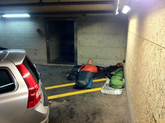 Het sneeuwde zelf zo hard dat parkeren geen sinecure was. Gelukkig vonden we een ondergrondse parking waar we nog enkele uren konden slapen.’s Morgens was het een leuk weerzien met een pak MC’ers. Tim en Nelson waren van de partij, Bram en Marijke waren ook in de buurt en Jasper en ik vonden onderdak in de mobilhome van Frank.