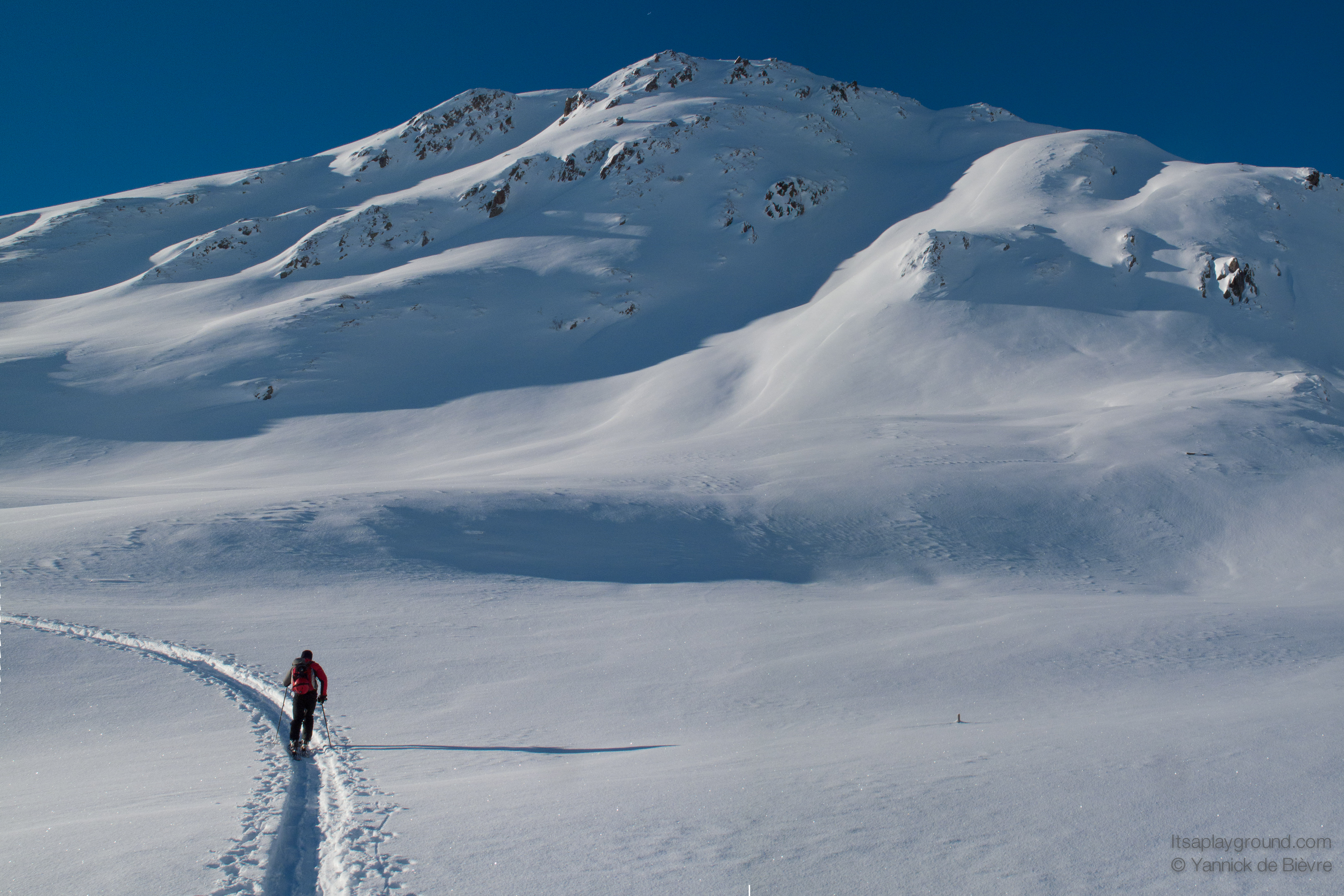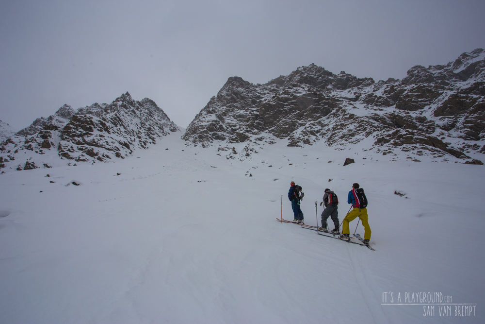 De drie omliggende valleien boden meer tourski-opties dan we op zeven dagen konden realiseren. Heerlijke hellingen die halverwege onze reis een nieuw wit deken kregen, deden ons elke dag dromen naar meer. Onze dagelijkse routine bestond eruit om een lijn te kiezen, enkele uren omhoog te stappen en te genieten van de afdaling in een onwaarschijnlijk kader.