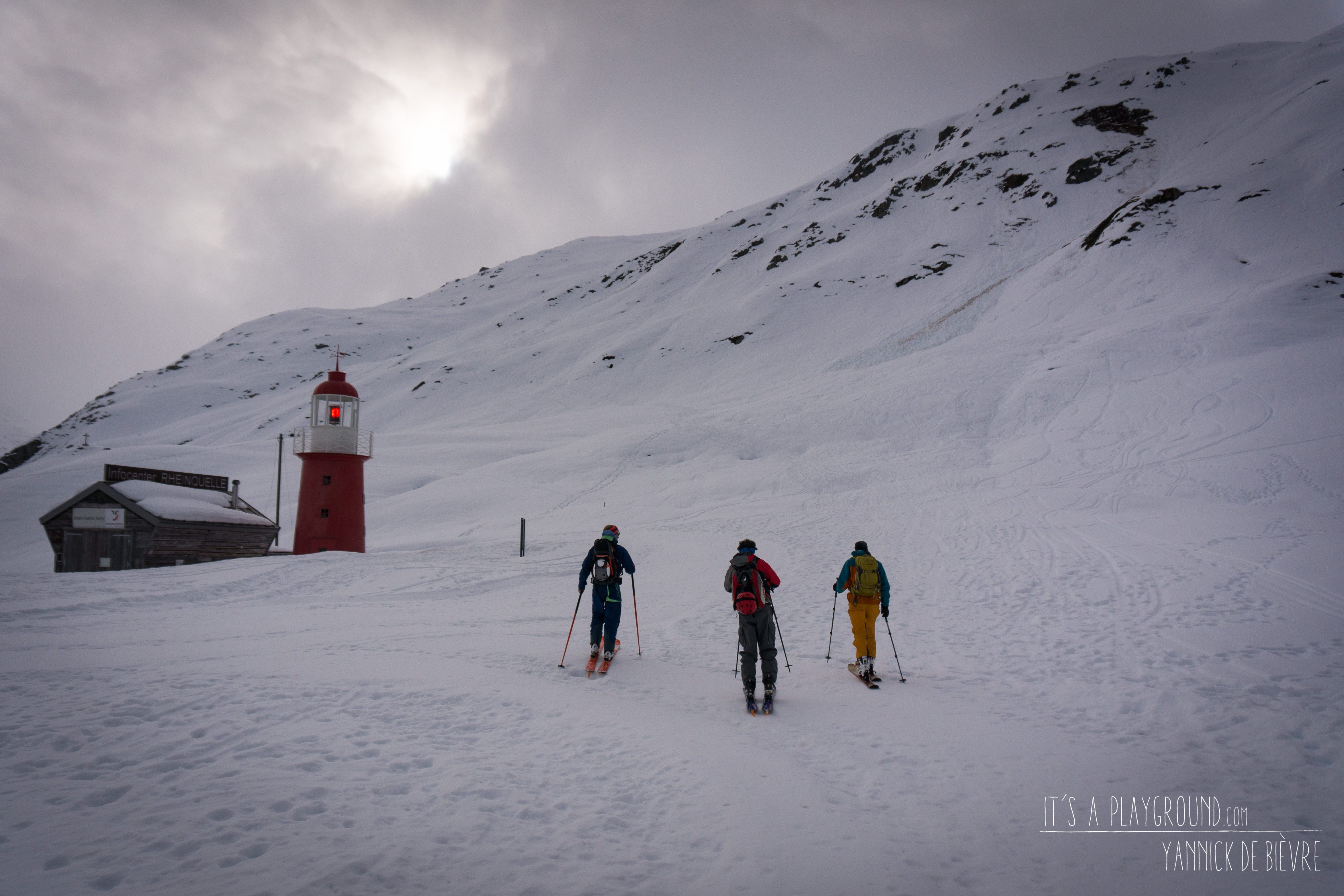 Ons idee om vanuit de vallei te vertrekken liep al snel letterlijk in het water. De sneeuwgrens begon pas zo een 300hm hoger. Gelukkig bood het treintje dat over de Oberalppas rijdt de oplossing. Een half uurtje later konden we uitstappen op 2200m in een witte wereld. Ook al was het zicht (en de sneeuw) niet top, met hulp van de vuurtoren zouden we altijd veilig beneden moeten geraken ;-)