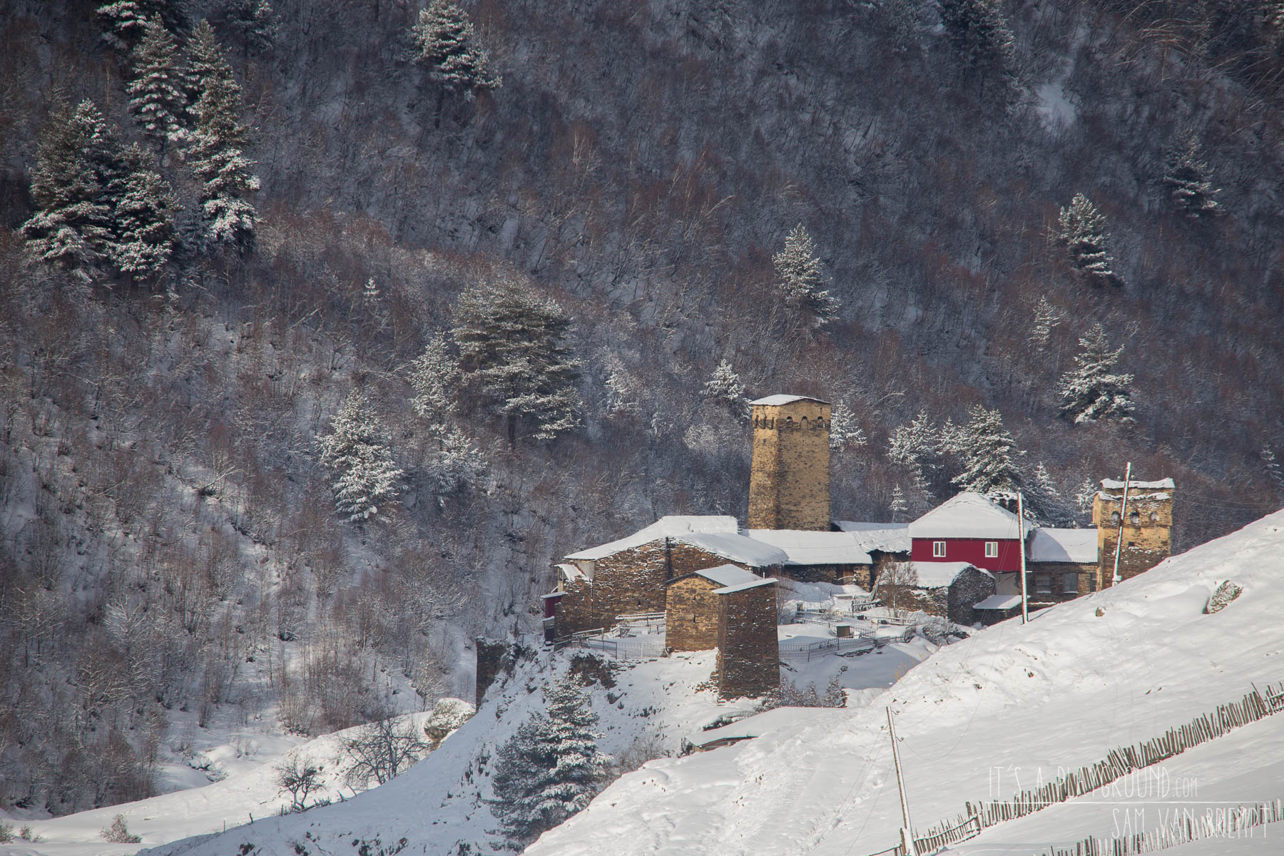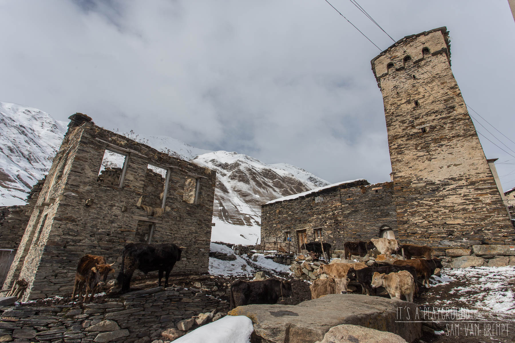 Ushguli (2100m) ligt in het hart van Svaneti, een bergstreek aan de grens tussen Georgië en Rusland. De streek wordt gekenmerkt door de tientallen vestigingstorens die overal verspreid staan. De huizen en torens werden gebouwd tussen de 9e en 13e eeuw. Sindsdien is er nog niet veel veranderd. De lokale families leven van wat het land opbrengt en van hun eigen dieren. Die waren er in overvloed. Koeien, geiten, schapen, paarden, honden en ganzen waren de echte inwoners van het dorp. Zij liepen vrij rond, wat het geheel nog charmanter maakte.
