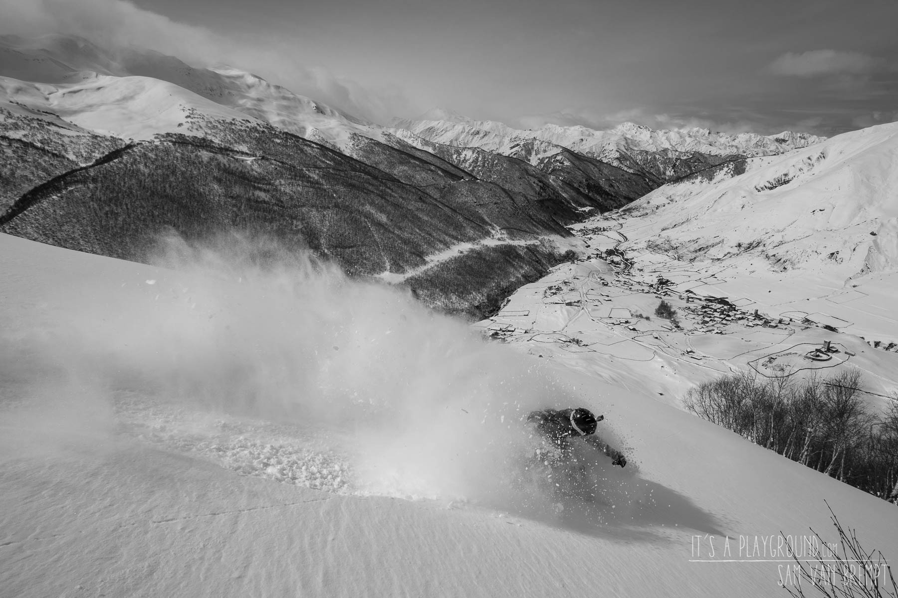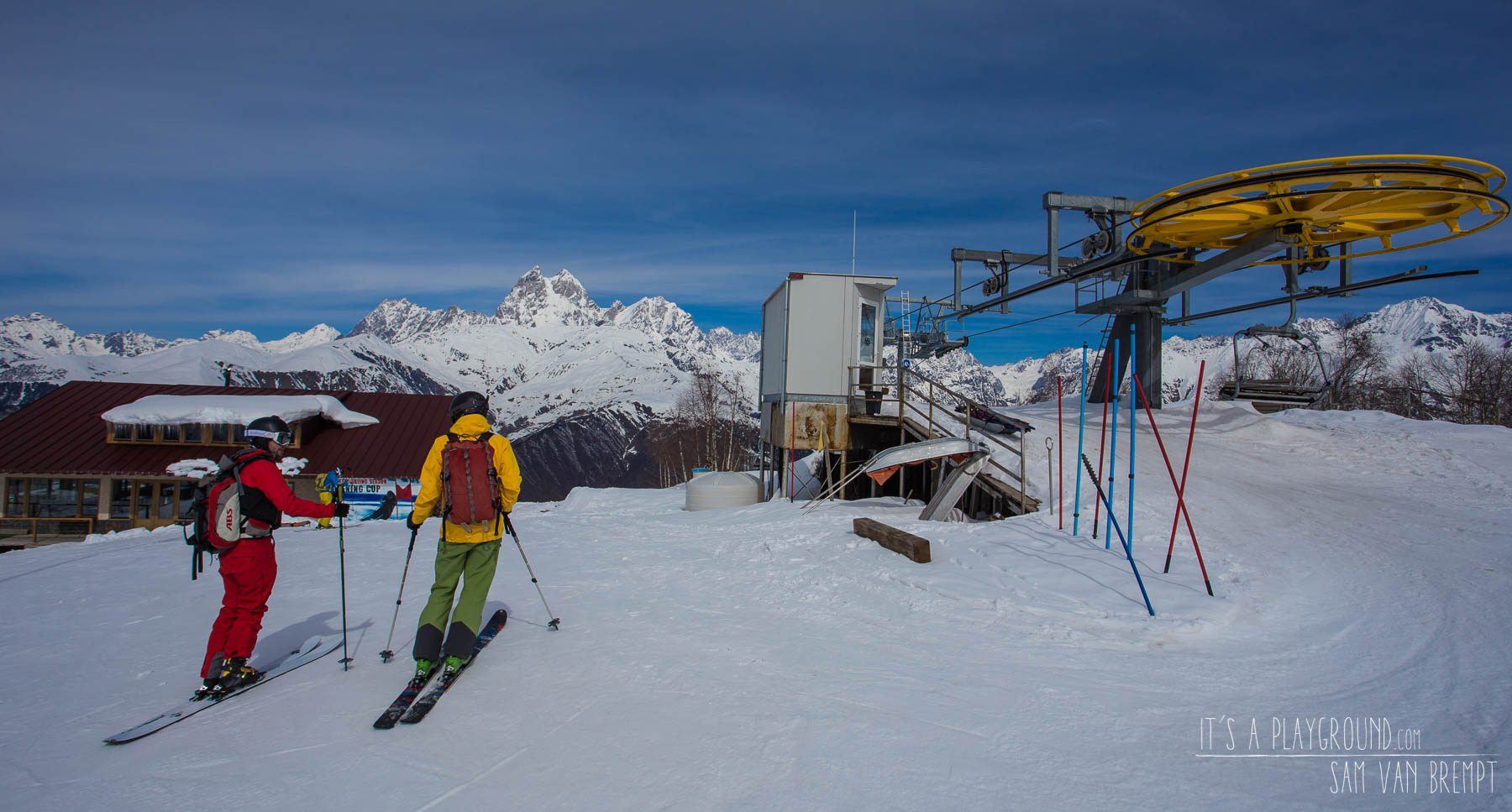 Na zes dagen touren besloten we nog een dag het skigebied van Mestia te verkennen. Een splinternieuwe lift van Duitse makelij bracht ons de hele dag voor slechts zeven euro naar de top. Het skigebied bood vanaf hier een 360° panorama van de Kaukasus en een heerlijke afdaling. Het feit dat er met uitzondering van twee locals geen kat te bespeuren was, maakte de ervaring nog unieker.