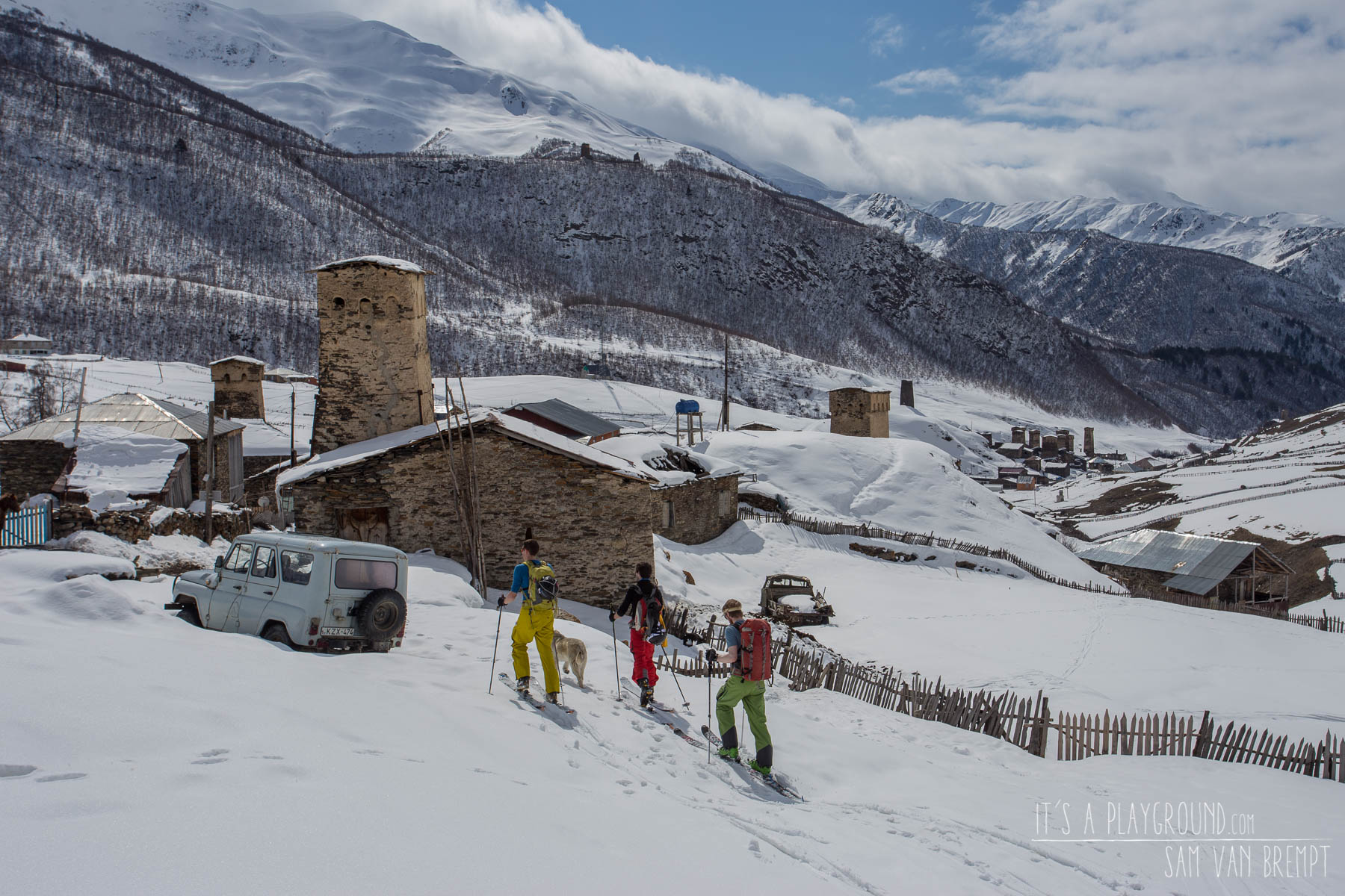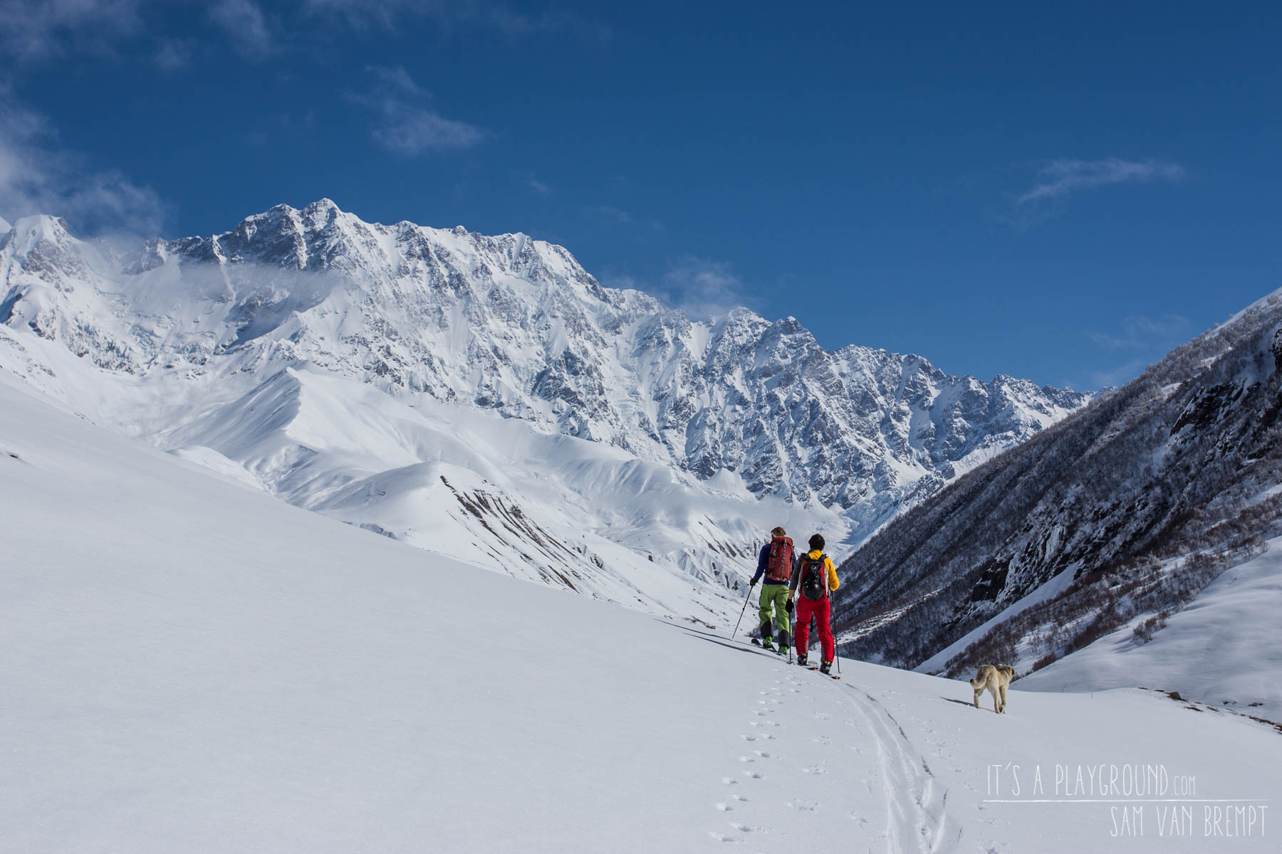 Eens we de grommende straathonden in het dorp voorbij waren, lag er een witte wereld te wachten om ontdekt te worden. Ushguli staat door de moeilijke bereikbaarheid nog niet op de internationale ski-radar. Slechts enkele skiërs verkenden de valleien voor ons, waardoor er nog een ongekend potentieel ligt aan eerste afdalingen. Tijdens ons verblijf waren er geen andere skiërs te bekennen. Dat was exact waarvoor we gekomen waren.