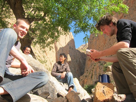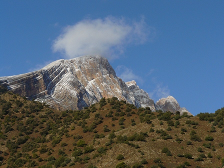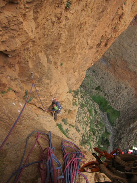 De dagen nadien volgen nog routes als Zebda(7b+, 220m), Shucran(7c,380m) en La bas(7b,400m). Shucran op zich is een mooie route, maar met een nogal bizar routeverloop. Sommige haken zijn totaal uit de lijn geplaatst, bepaalde lengtes zijn dan weer belachelijk kort en de meeste relais zijn heel slecht geplaatst, zodat het bloed in je benen volledig afgeklemd wordt. Wij klommen door tot de top via berberbrugjes op een stijle graat. Daarboven kwamen we onze franse vrienden tegen en dat leverde een leuke foto.