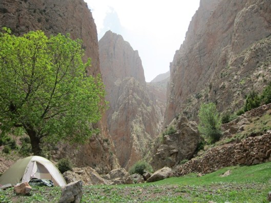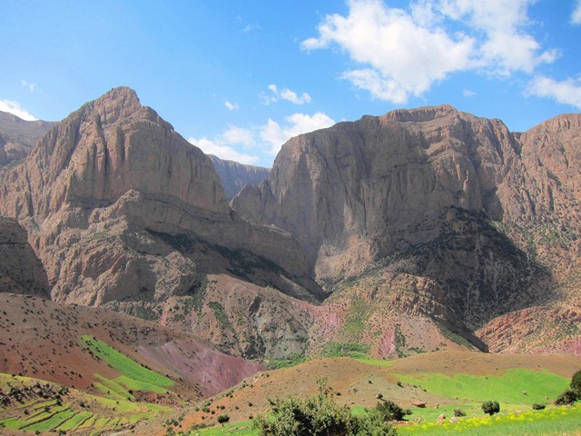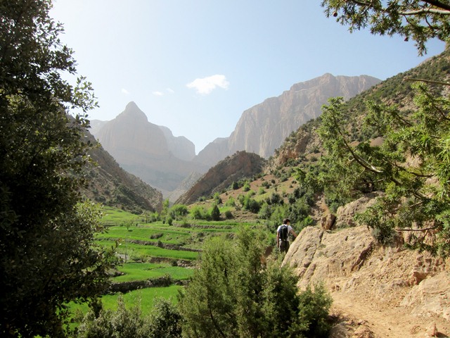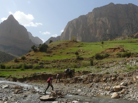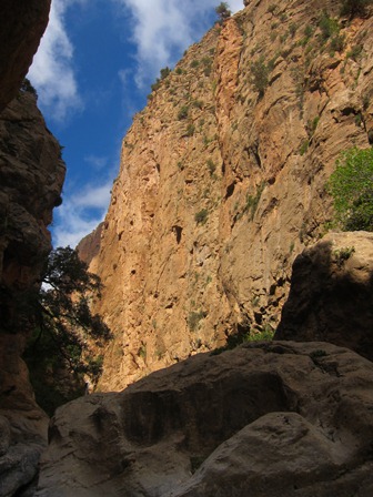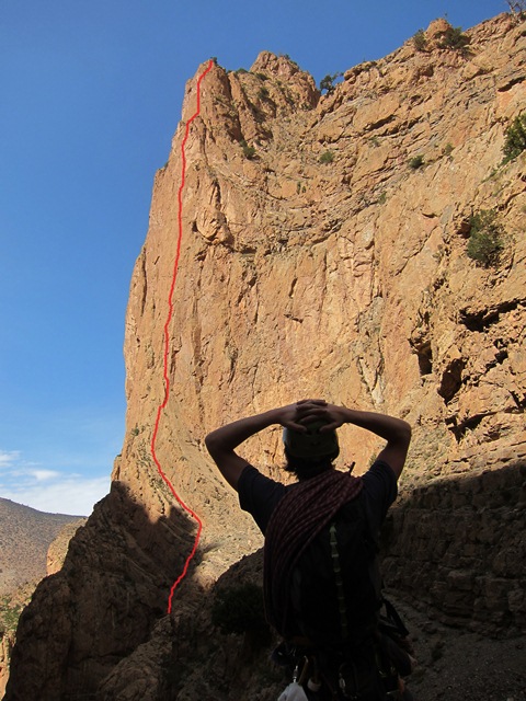 De dag nadien trekken we met onze volgeladen ezeltjes de vallei van Taghia binnen. Het voelt aan als toekomen in een klein weelderig paradijs, dit in schril contrast met Zaouiat., waar het dor en droog is. In de verte zien we hoge rotswanden opdoemen, 800m prachtige kalk. Ongeduldig als we zijn kunnen we het niet laten om al direct een routje te klimmen.(Classe montagne épinal : 6c+ 220m)