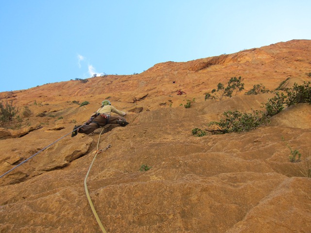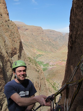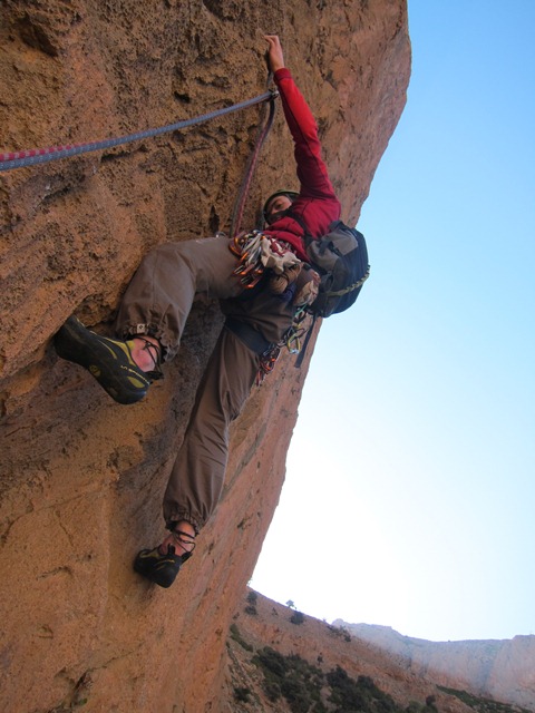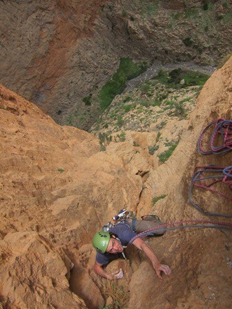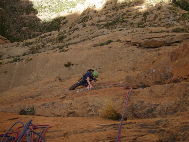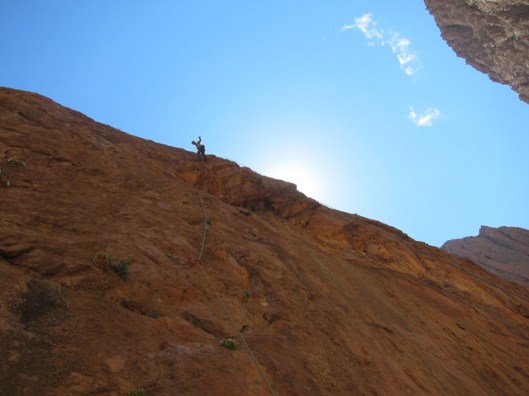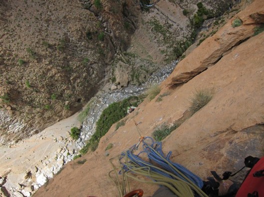 We bekomen even met de route a boire ou je tue le chien(6c, 250m). Ongeloofelijke 6a, 6b lengtes wisselen elkaar af tot op de top van Taoujdad. Die avond overtuigen enkele Fransen ons om Rivières Pourpes(7b, 600m) te proberen. Een van de klassiekers van het gebied. De eerste 350 overhangende meters baarde ons een beetje zorgen, vermits overhang klimmen voor beiden van ons niet de sterkste kant is. Maar het gaat vlot, de verzuring die ik nog had in l’axe du mal blijkt helemaal weg en dit keer is het echt cruisen geblazen. Alleen was er die verdomd ijzig koude wind waardoor we op de relais telkens weer moeten overgaan in diepvriesmodus. Omdat we op het einde helemaal bevroren zijn laten we de 2 gemakkelijke laatste lengtes voor wat ze zijn en rapellen we gewoon. Een goed keuze denk ik.