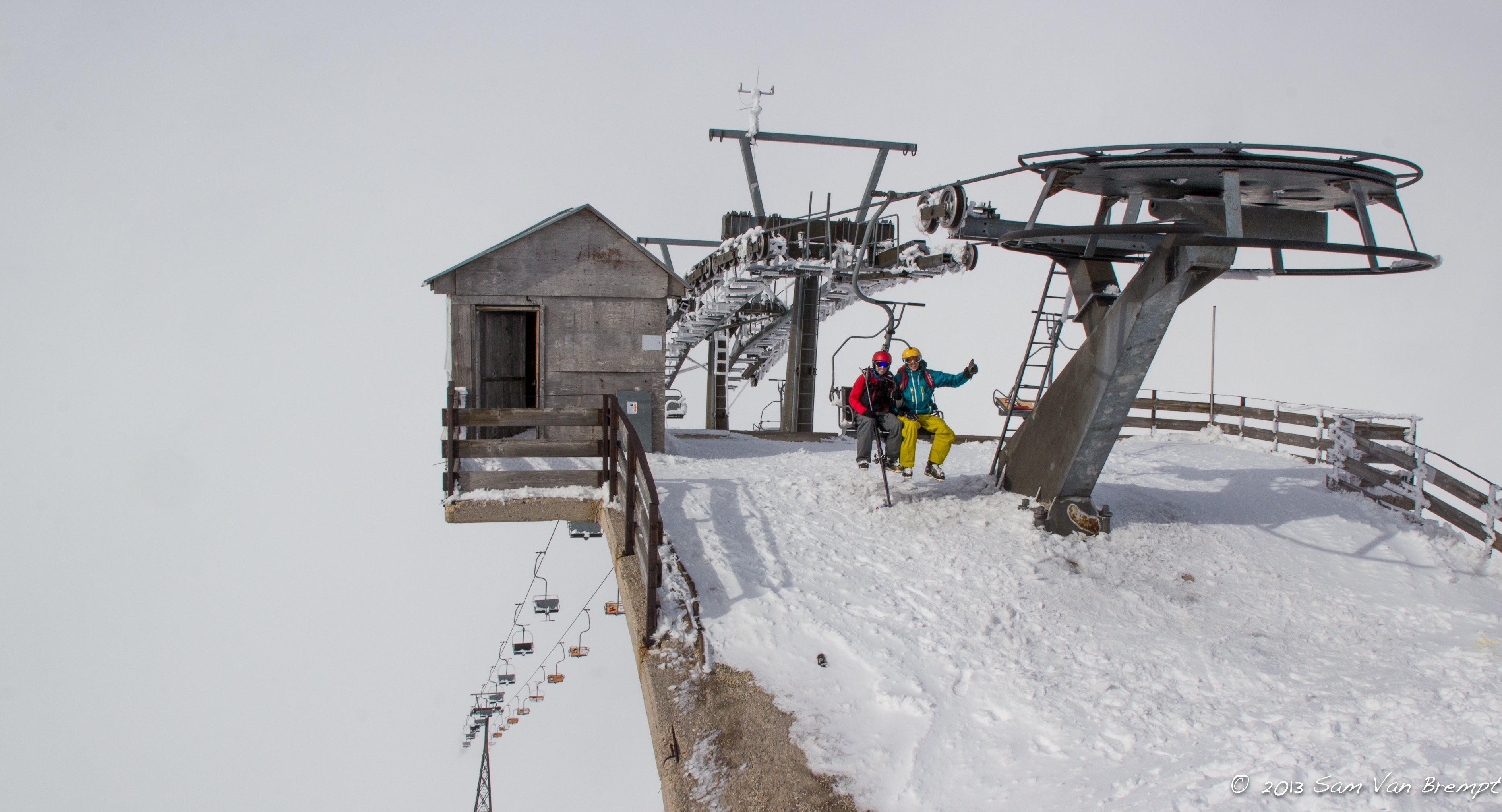 Na twee dagen van nogal zware approach, besluiten we om naar het in 5′ te voet toegankelijke Sottoguda te rijden. Maar wat we met die tijdswinst winnen, gaat verloren door anderhalf uur over besneeuwde cols te moeten rijden. Twee van de drie auto’s moeten sneeuwkettingen opleggen, maar het rijden door een tunnel van 5m hoge sneeuwmuren is wel indrukwekkend. Laat het duidelijk zijn, aan sneeuw is hier geen gebrek. Maar Sottoguda ligt slechts op 1350m en zo goed als alle watervallen zijn er onbeklimbaar zoniet onbestaande. Gelukkig ligt één lengte van een derdegraads waterval er goed bij en iedereen leert hier zijn eerste pasjes in het voorklimmen, de dag is niet verloren.