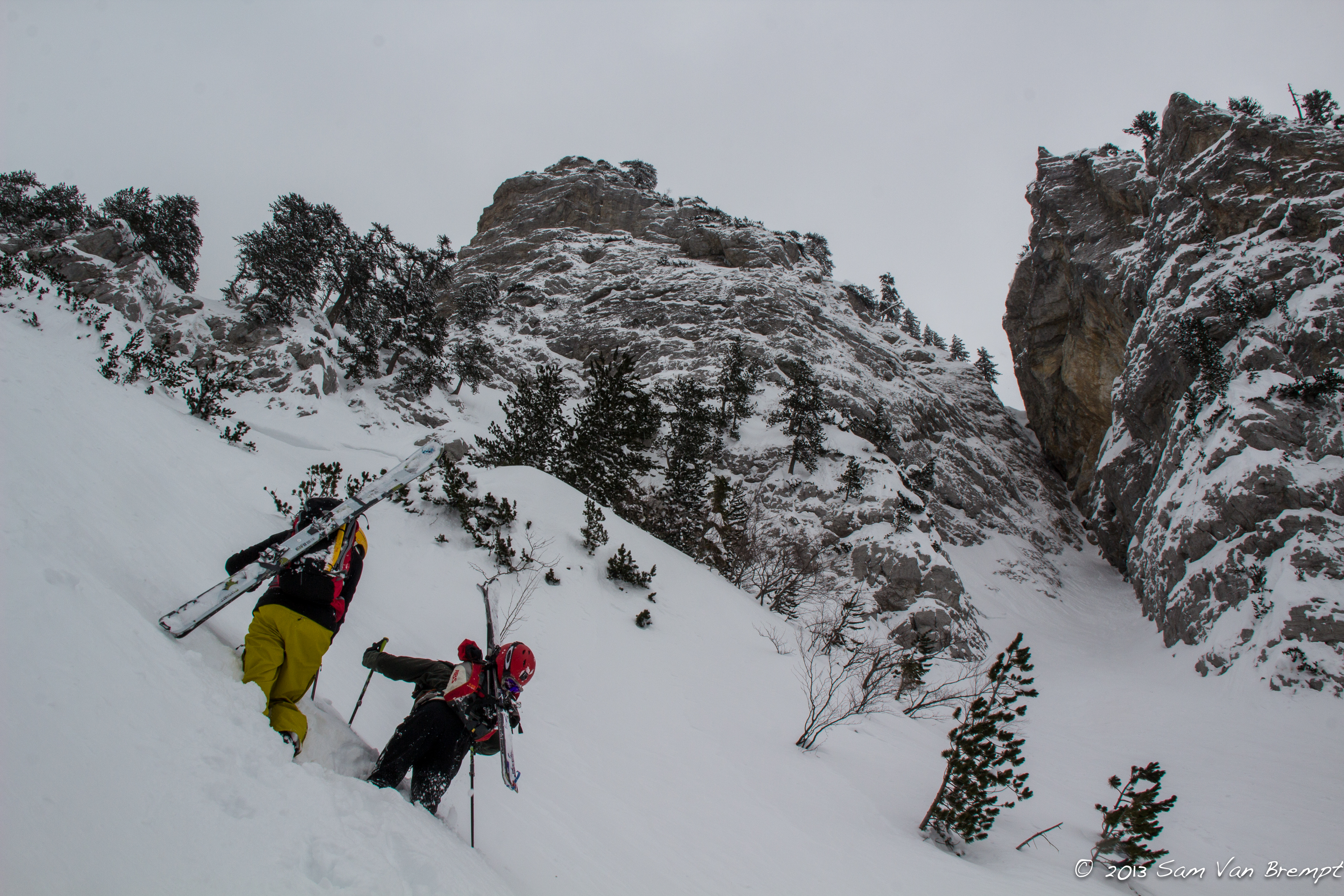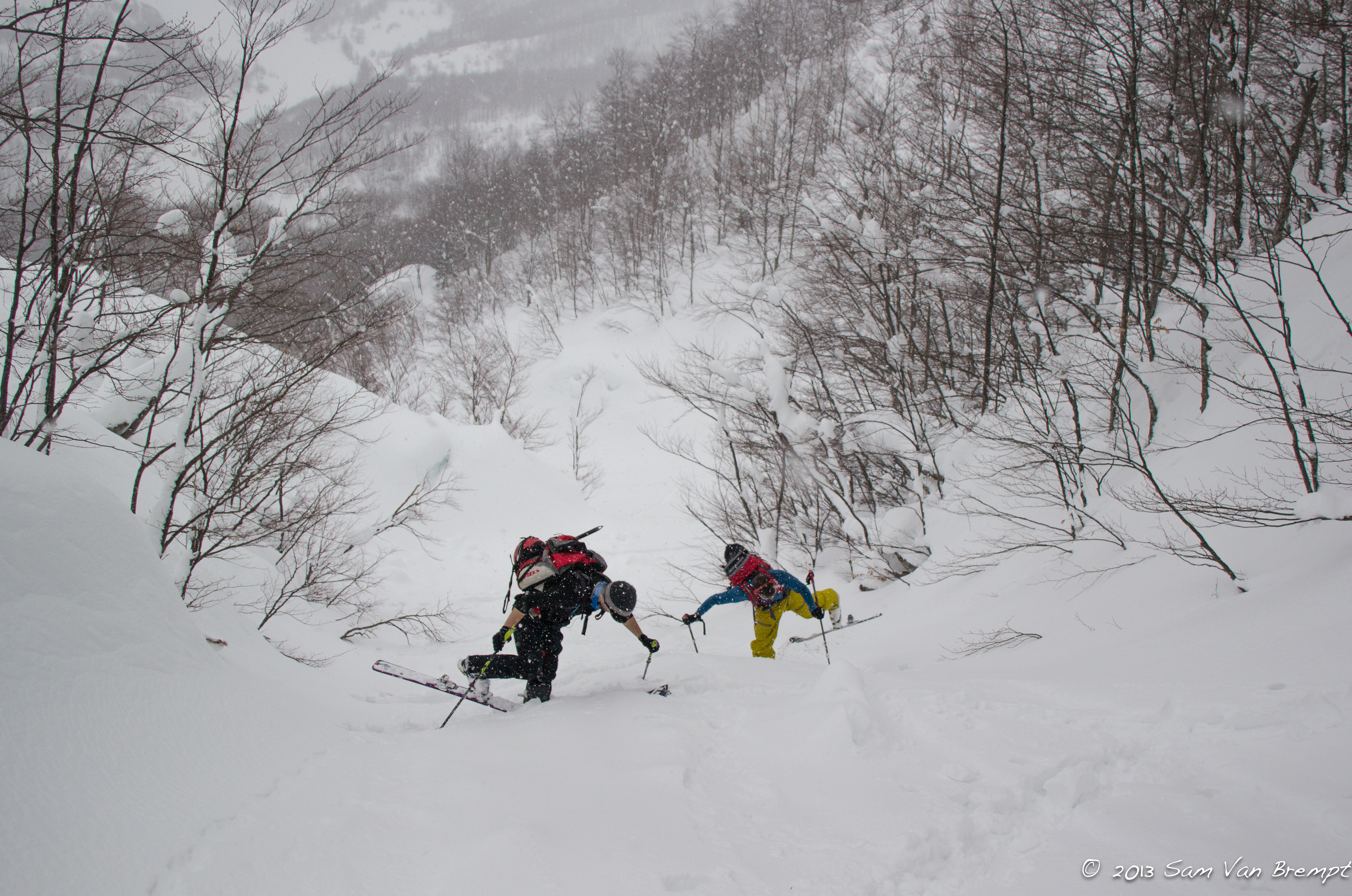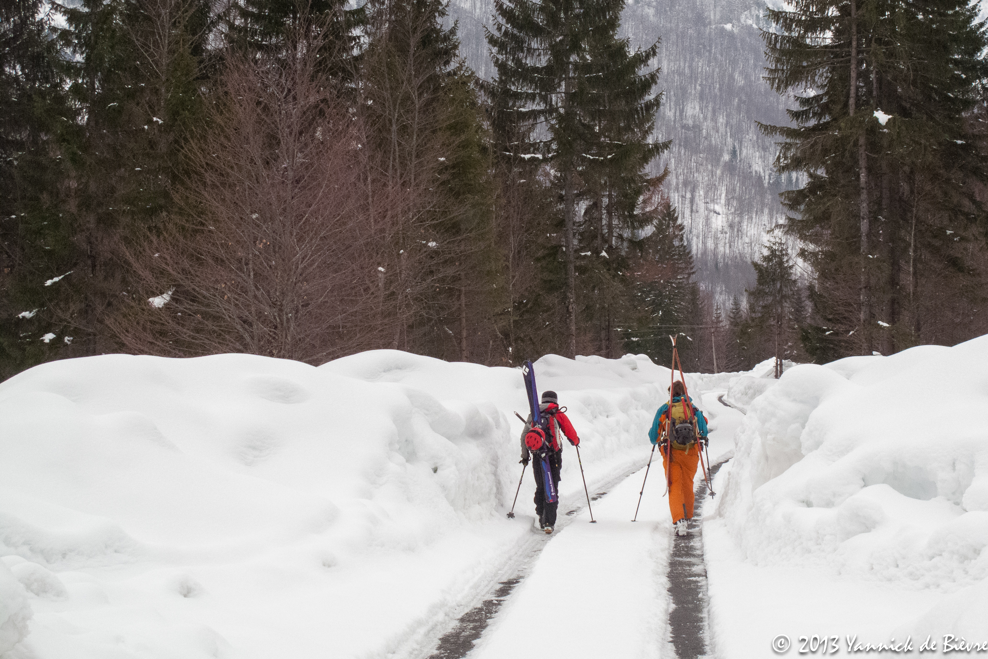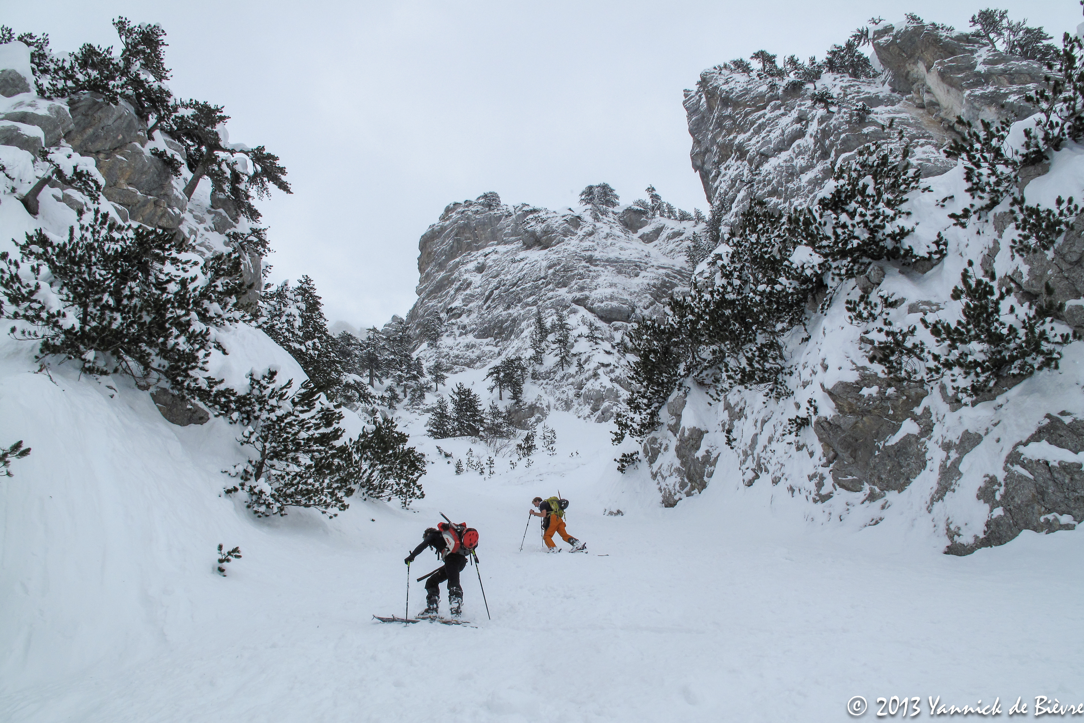 Na een lange heenreis van vrijdag op zaterdag en wat logistieke voorbereidingen, ging de stage op zondag 2 maart van start. Samen met Maxime had ik zaterdag al een sector gespot in het Höhlensteintal, maar voor de eerste lessen wou ik een scholingssector opzoeken in Möselegraben. Met onze volledige tourski-uitrusting beginnen we aan de volgens de topo 35′ instijg. Na anderhalf uur extreem steil terrein door een dicht bos vinden we deze sector, maar er is onvoldoende ijs. De toon was gezet voor deze week, moeilijke en vaak lange approach en het was nooit zeker dat we ook effectief ijs zouden vinden. Elke dag moest er dan ook steeds een plan B of zelfs C uitgedacht zijn. Plan B voor vandaag was alvast de sector die ik met Maxime gevonden had en vanaf 13 uur waren we dan toch aan het klimmen.