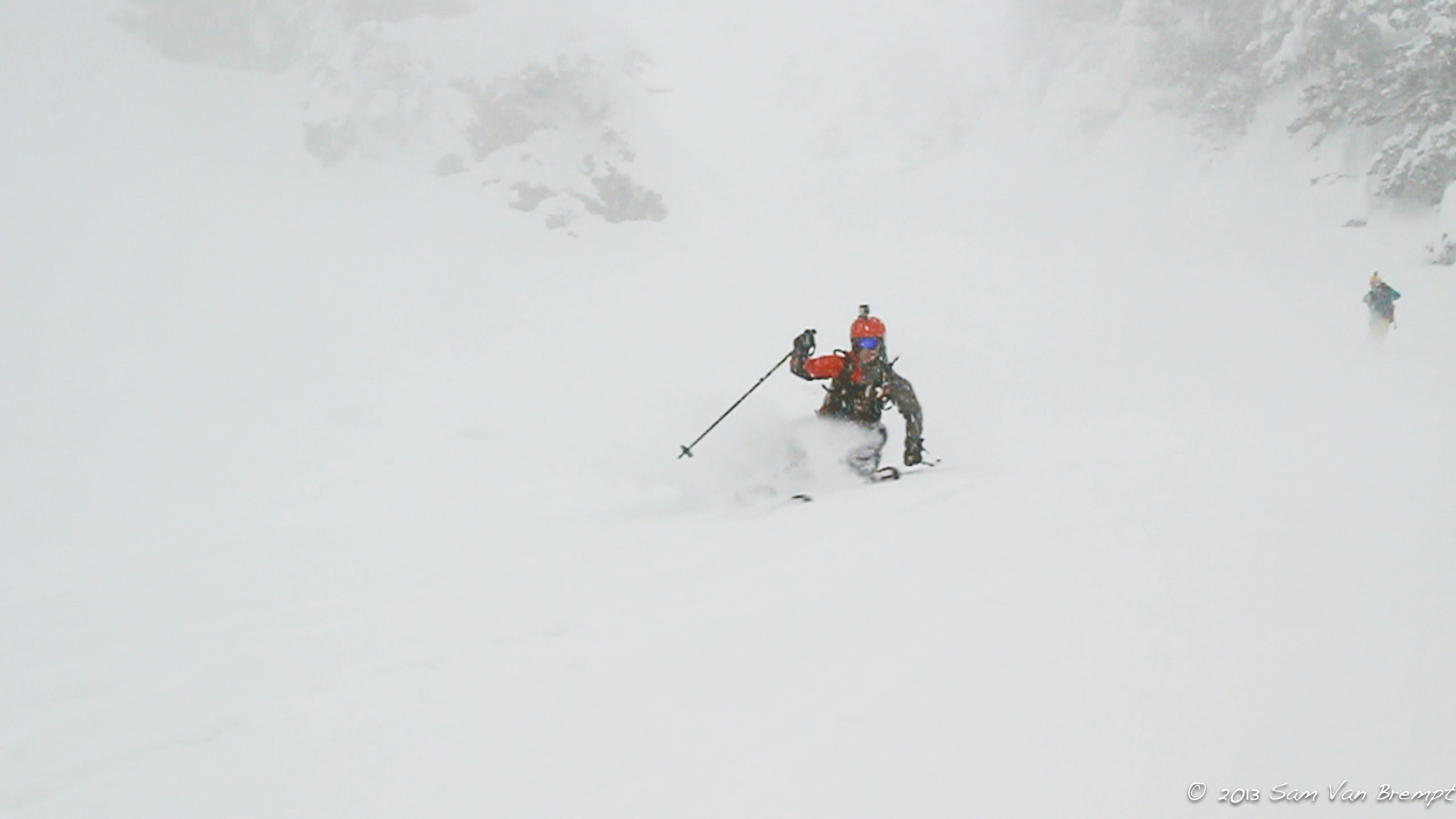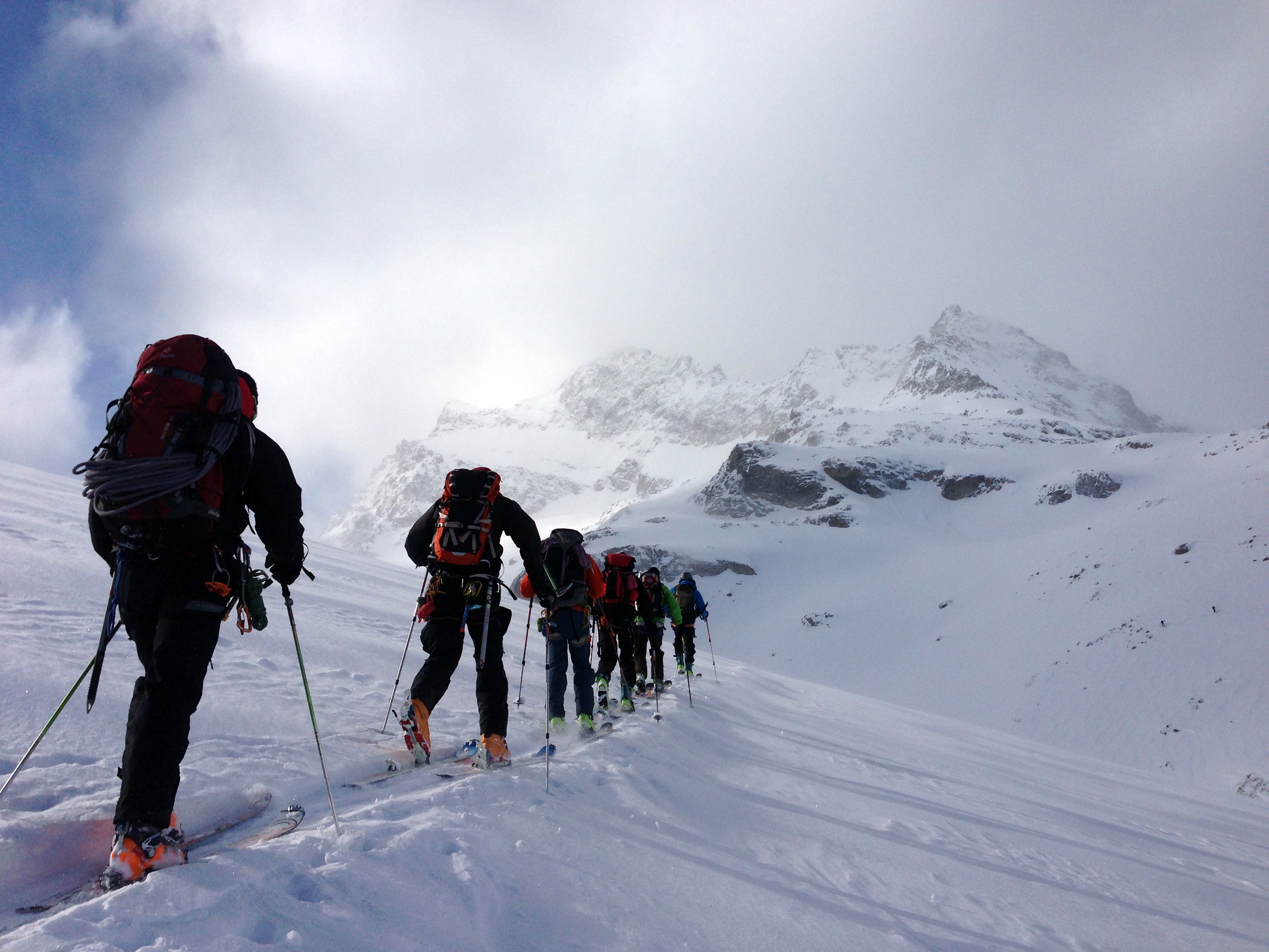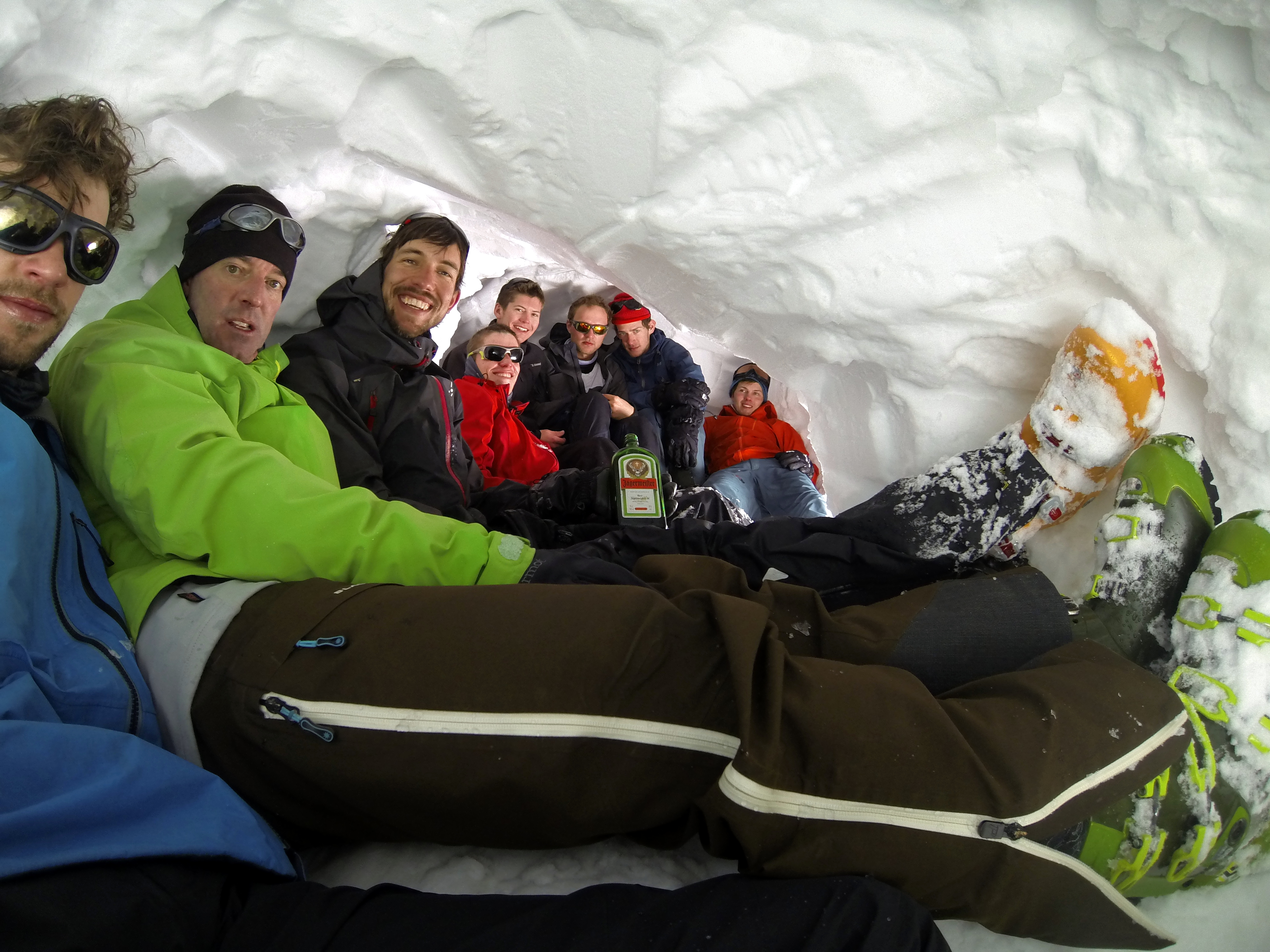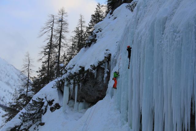 De tweede dag willen we op zeker spelen en gaan voor een sector in het Pragsertal, waar Quinten en Nicolas goed ijs hebben gezien. Het is mooi weer die dag en aangekomen op de parking zien we de watervallen mooi liggen. Maar ook de lawine-gevaarlijke hellingen er net boven, dus hop, plan B. Een drie kwartier verder rijden brengt ons naar Lappach, waar ons nog anderhalf uur tourskiën wacht om aan de hooggelegen Zösenberg watervallen te geraken. Hier installeer ik samen met Maxime, Quinten en Nicolas enkele topropes. Het thema van de dag is beveiliging in ijs, plaatsen van tussenzekeringen, standplaatsbouw en afdalen op abalakov en recupereerbare ijsschroef. Om dit alles in te oefenen, wordt er toprope geklommen, maar tussenzekeringen geplaatst alsof we aan het voorklimmen zijn. Na stevig geklommen te hebben, dit keer zelfs met twee ijsbijlen, wacht ons nog een pittige ski-afdaling met de topzware ijsklimrugzakken, ook dit wordt een dagelijks ritueel. Gelukkig tovert Jeroen ’s avonds weer een geweldige maaltijd te voorschijn.