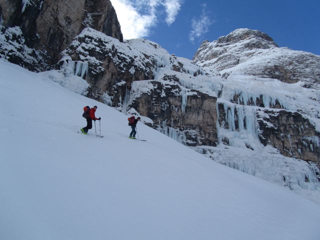 Al bij al een geslaagde dag, alleen verliezen we veel tijd met lange approaches om uiteindelijk maar een paar lengtes te kunnen klimmen. ’s Avonds wacht steeds het koken en afwassen, gevolgd door theorie weerkunde of lawinekunde, iedereen begint wat moe te worden. Maar niet versaagd, nog twee dagen om maximaal ervaring op te doen en het beste gebied moet nog ontsloten worden. Val Travenanzes is enkel bereikbaar door een twee uur lange approach op tourski’s en er ligt geen enkele eenvoudige waterval. Dit is het koninkrijk van de afgelegen vijfde en zesde graads, alleen wie sterk staat maakt hier een kans.