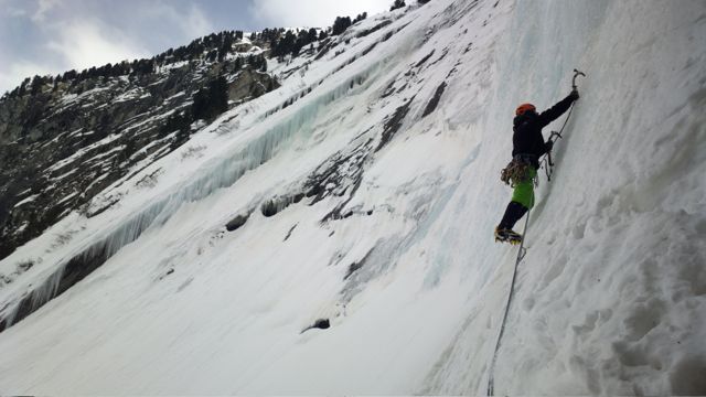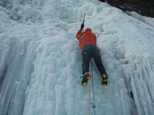 De eerste lesdag gaat vooral over de juiste klimtechniek en dan vooral om een goede voetentechniek, de basis van elke klimbeweging. En wat is er dan beter om te leren ijsklimmen zonder ijsbijlen? Als het ijs voldoende structuur biedt, gaat dit zelfs erg goed en zeker met wollen handschoenen, die blijven een beetje aan het ijs kleven ;-) Als dat wat goed begint te gaan, krijgen ze er een ijsbijl bij. Zo blijven we klimmen en lijnen uitproberen op de limieten van het mogelijke, tot het donker wordt. Kwestie van de beschikbare tijd maximaal te benutten. ’s Avonds moet er nog gekookt worden en we genieten in ons appartement van een uitstekende maaltijd verzorgt door Jeroen.